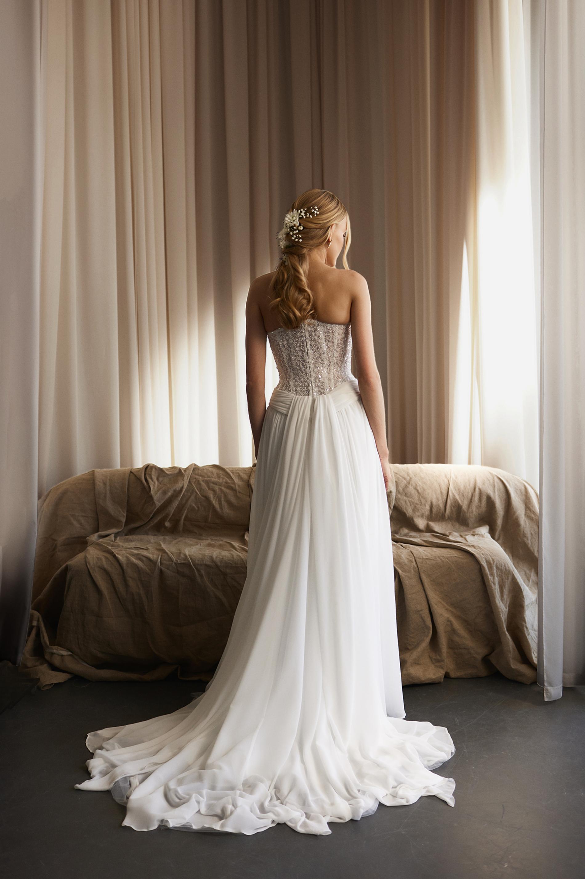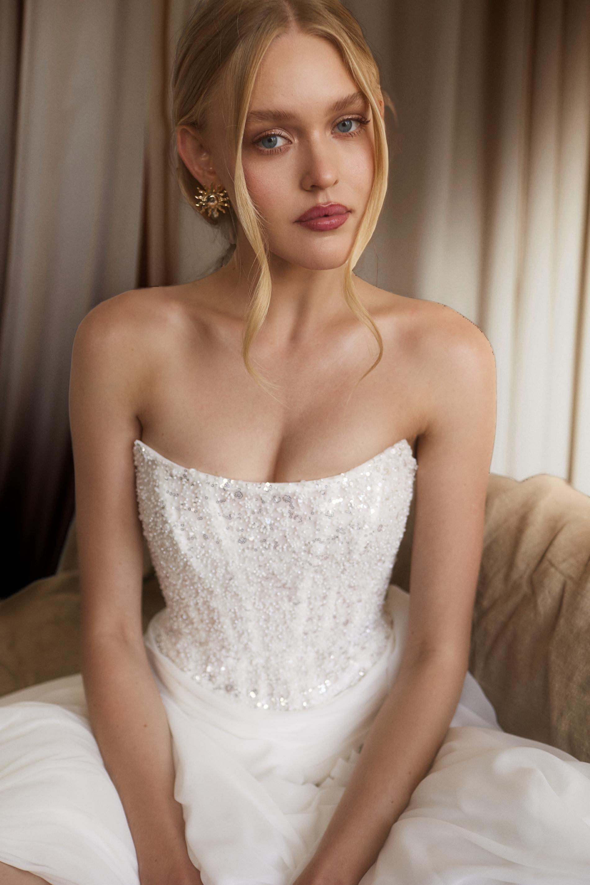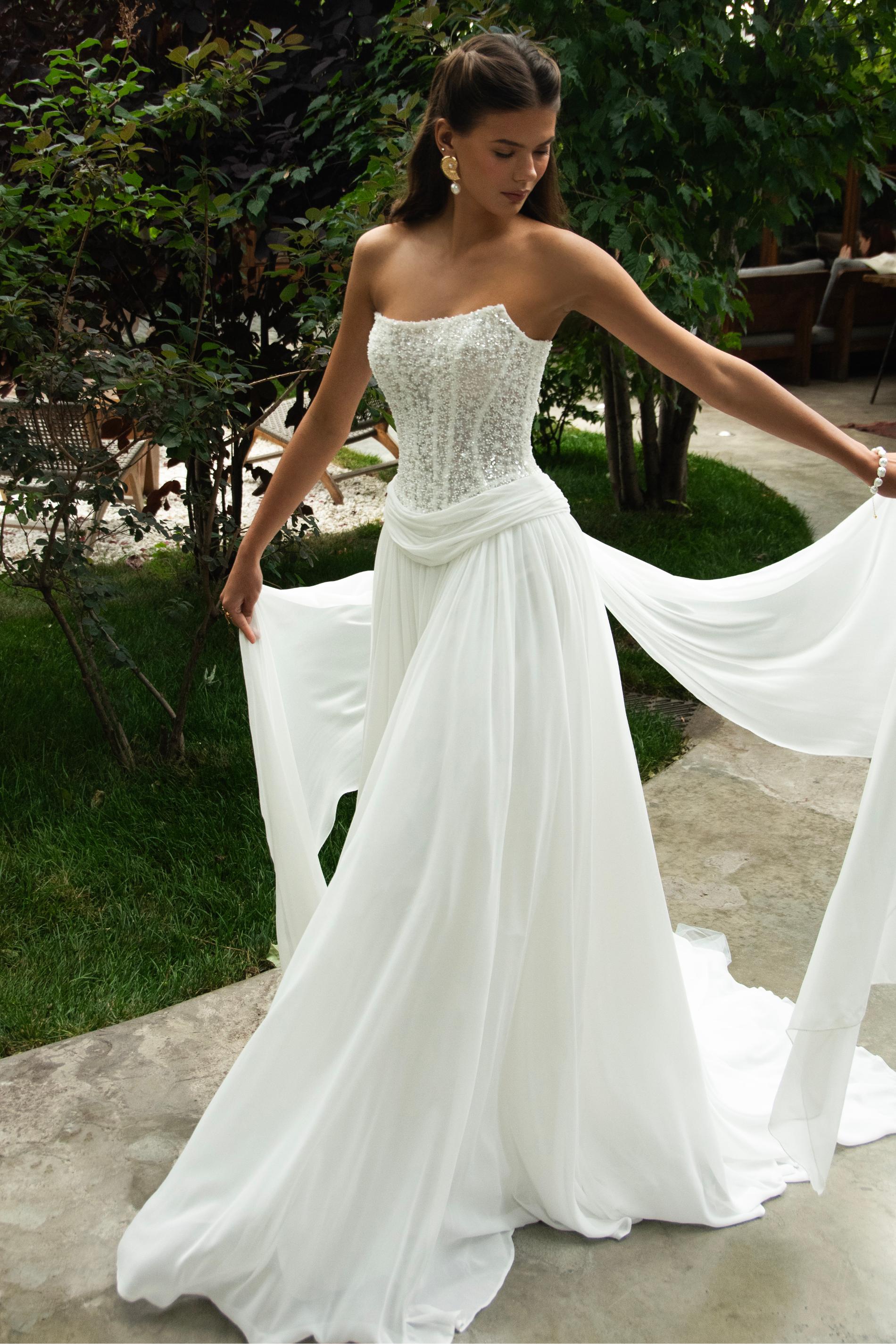 Свадебный верх платья выполнен из расшитого бисером корсета, который красиво мерцает при движении. Юбка свободная, многослойная, собрана на талии с мягкими складками. Отсутствие рукавов и открытая линия плеч делают образ легким и свежим. Элегантная простота дополнена текстурой и блеском бисерной отделки.