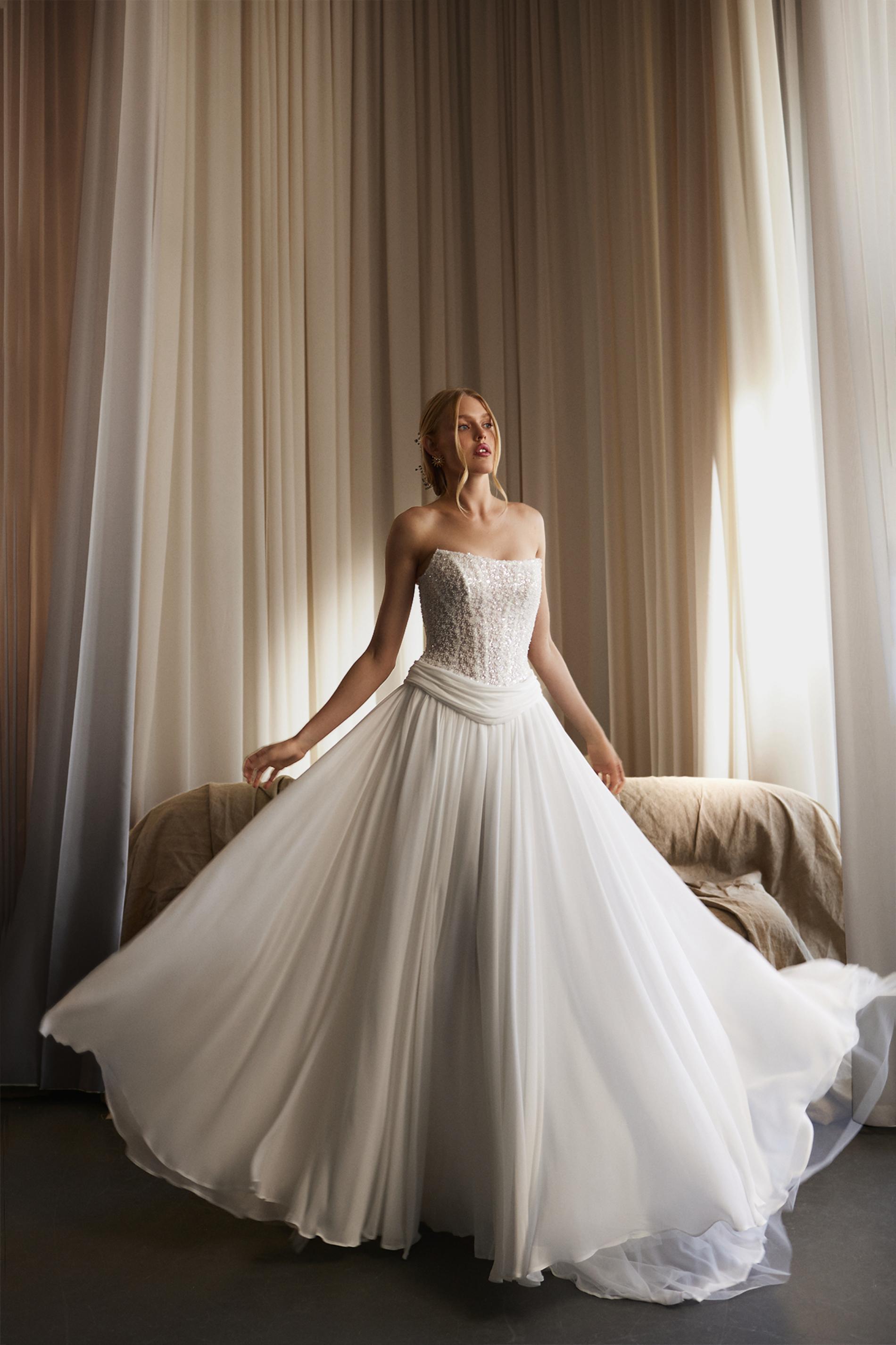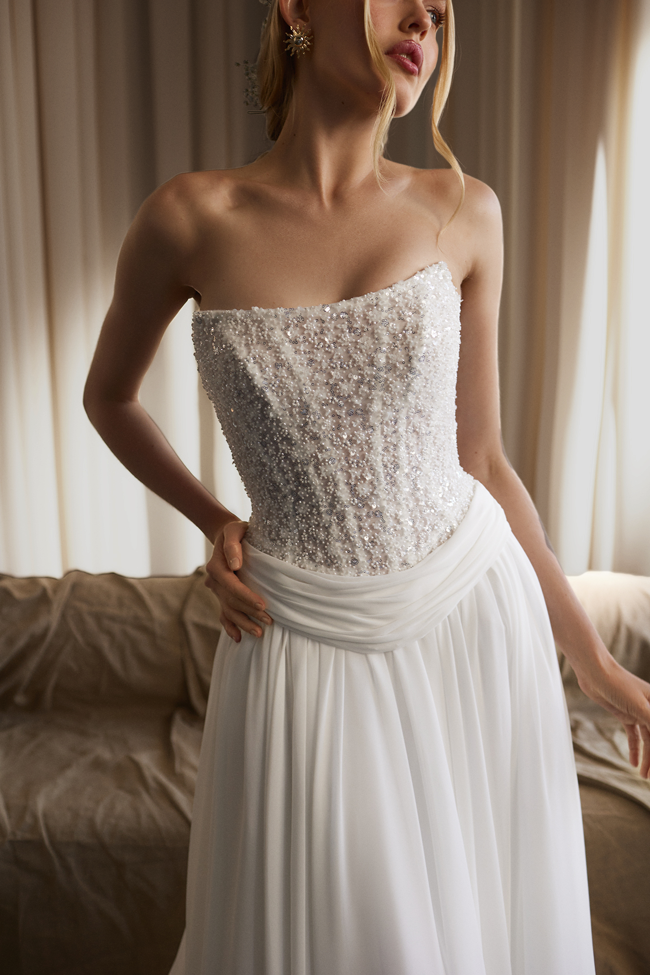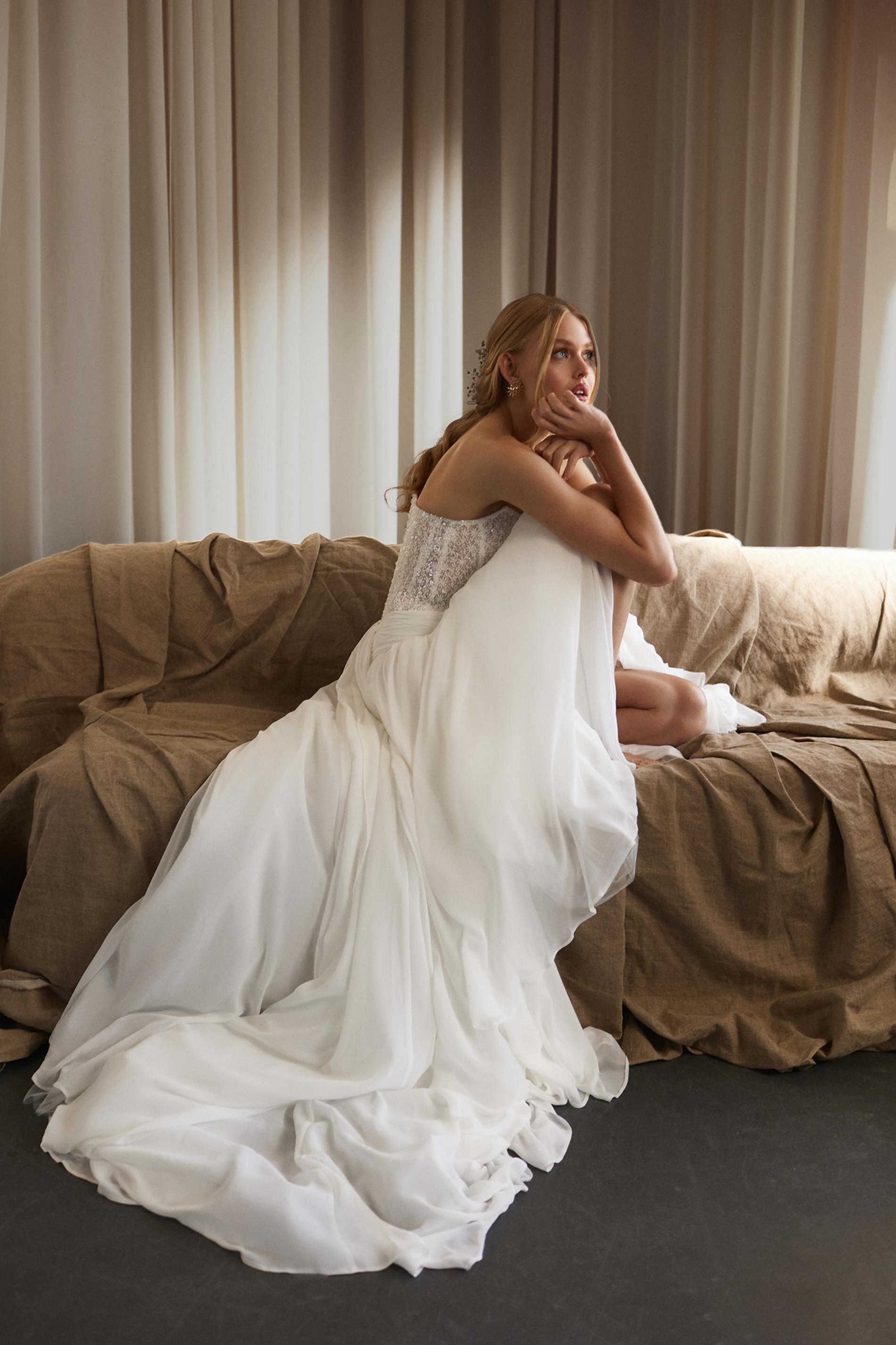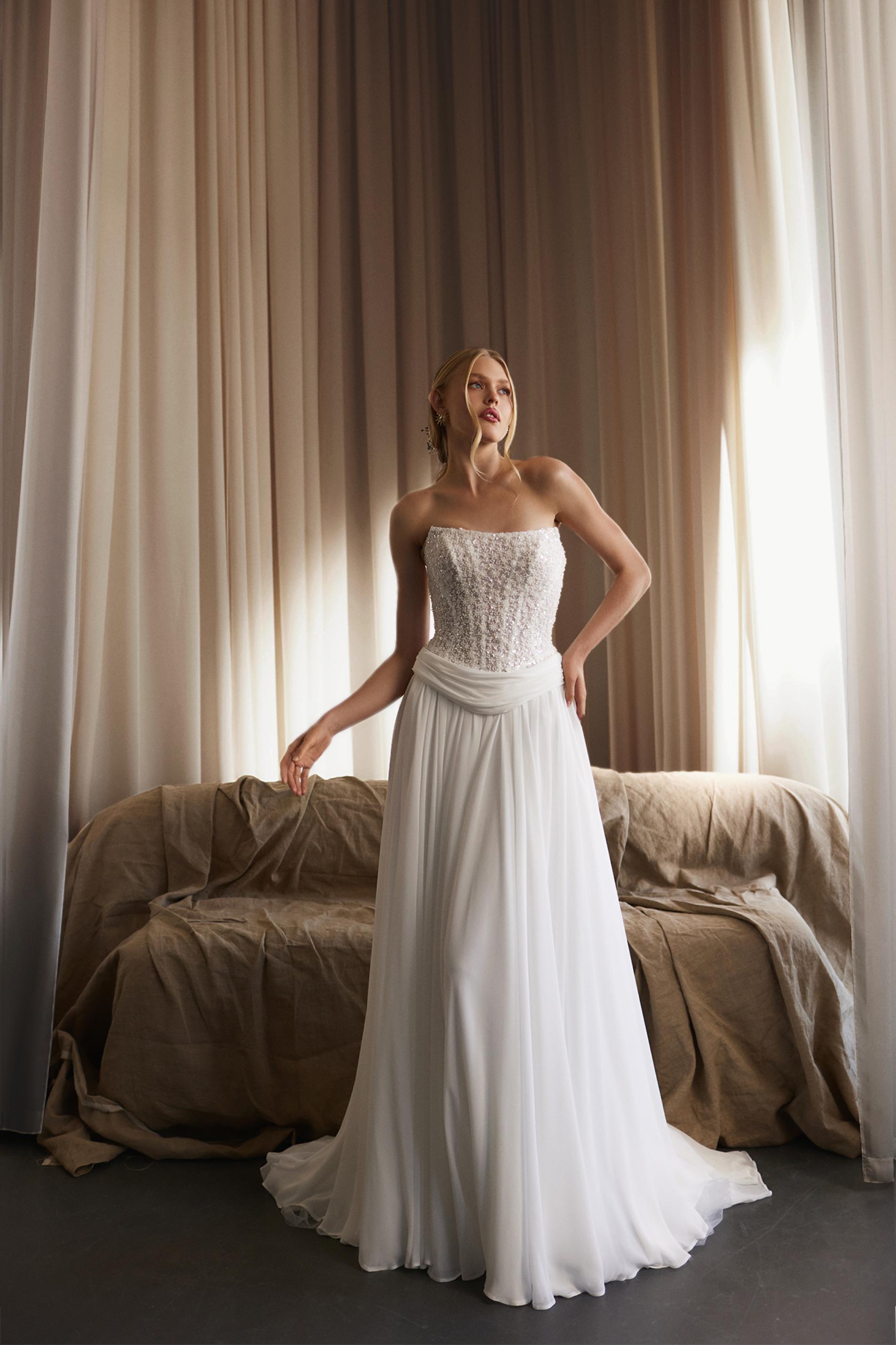 Свадебный верх платья выполнен из расшитого бисером корсета, который красиво мерцает при движении. Юбка свободная, многослойная, собрана на талии с мягкими складками. Отсутствие рукавов и открытая линия плеч делают образ легким и свежим. Элегантная простота дополнена текстурой и блеском бисерной отделки.