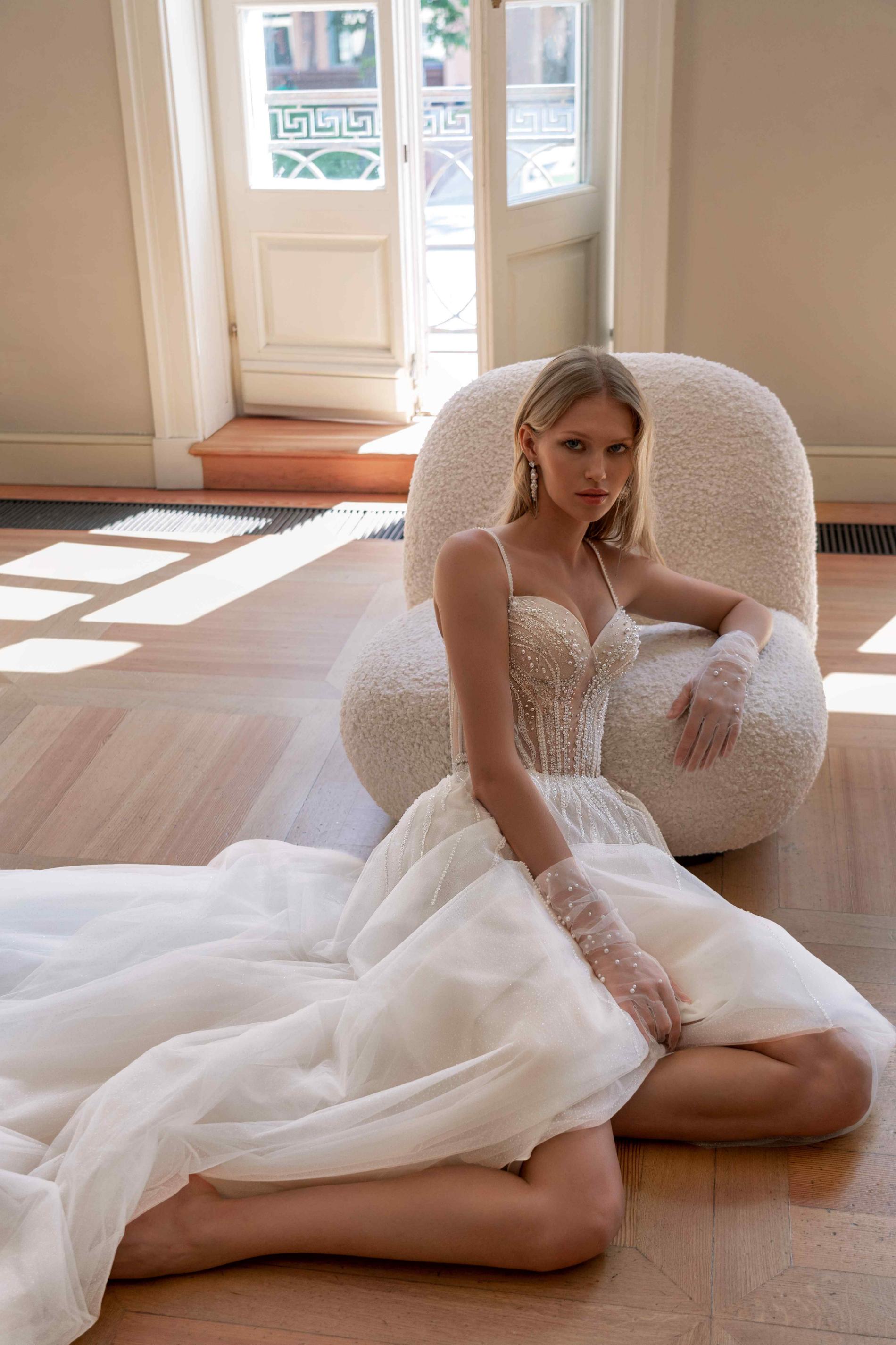 Свадебное платье на тонких бретелях с нежным прозрачным корсетом и пышной многослойной юбкой из сетки. Вышивка и блестящие акценты делают наряд торжественным и сказочным