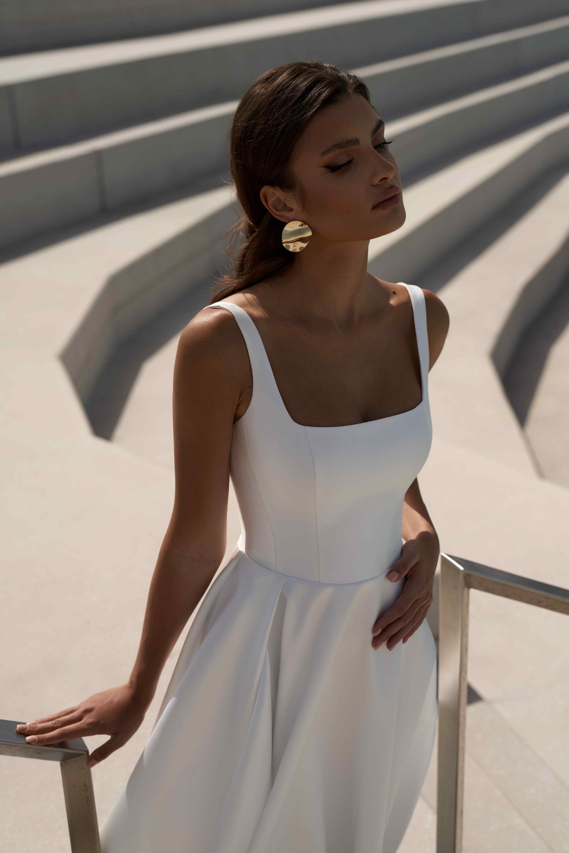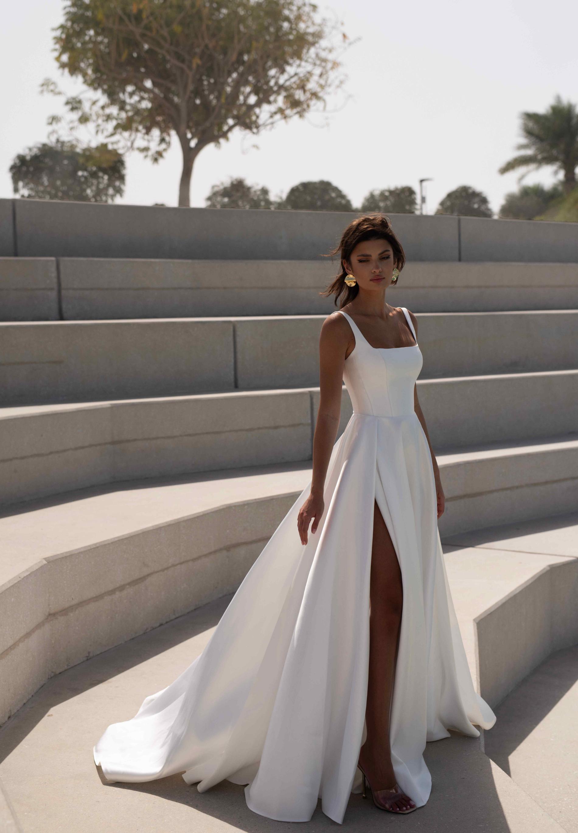 Свадебное платье на тонких бретелях с плавным и объемным шлейфом, подчеркивает утонченную линию спины и силуэт.
