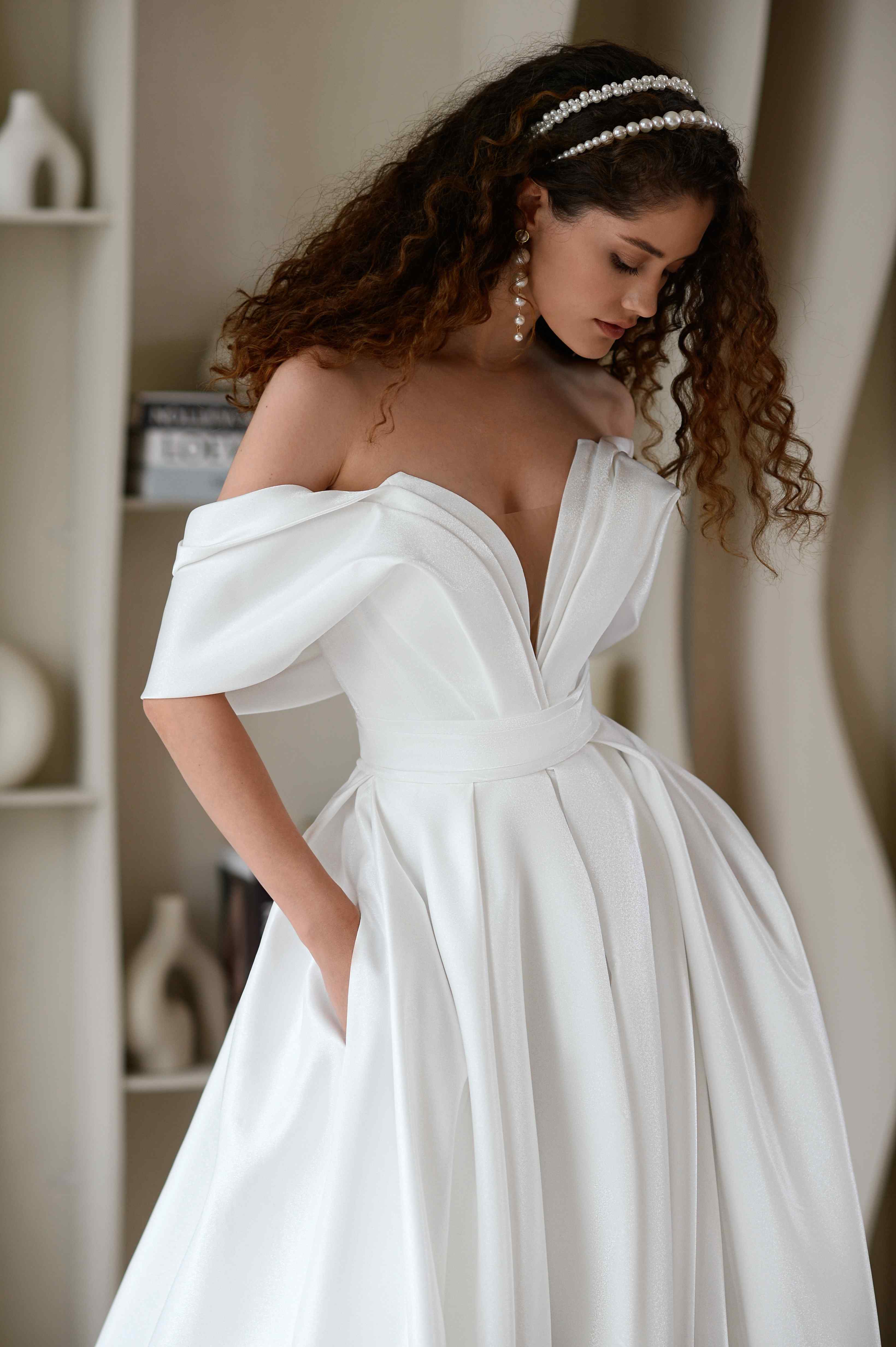 Пышное свадебное платье А-силуэта с открытыми плечами. Верх выполнен из мягких складок ткани, формирующих глубокий фигурный вырез в зоне декольте и нежные драпированные рукава, которые элегантно спадают с плеч. Акцент на талии и классическая широкая юбка придают наряду легкость, романтичность и ощущение торжественного праздника.
