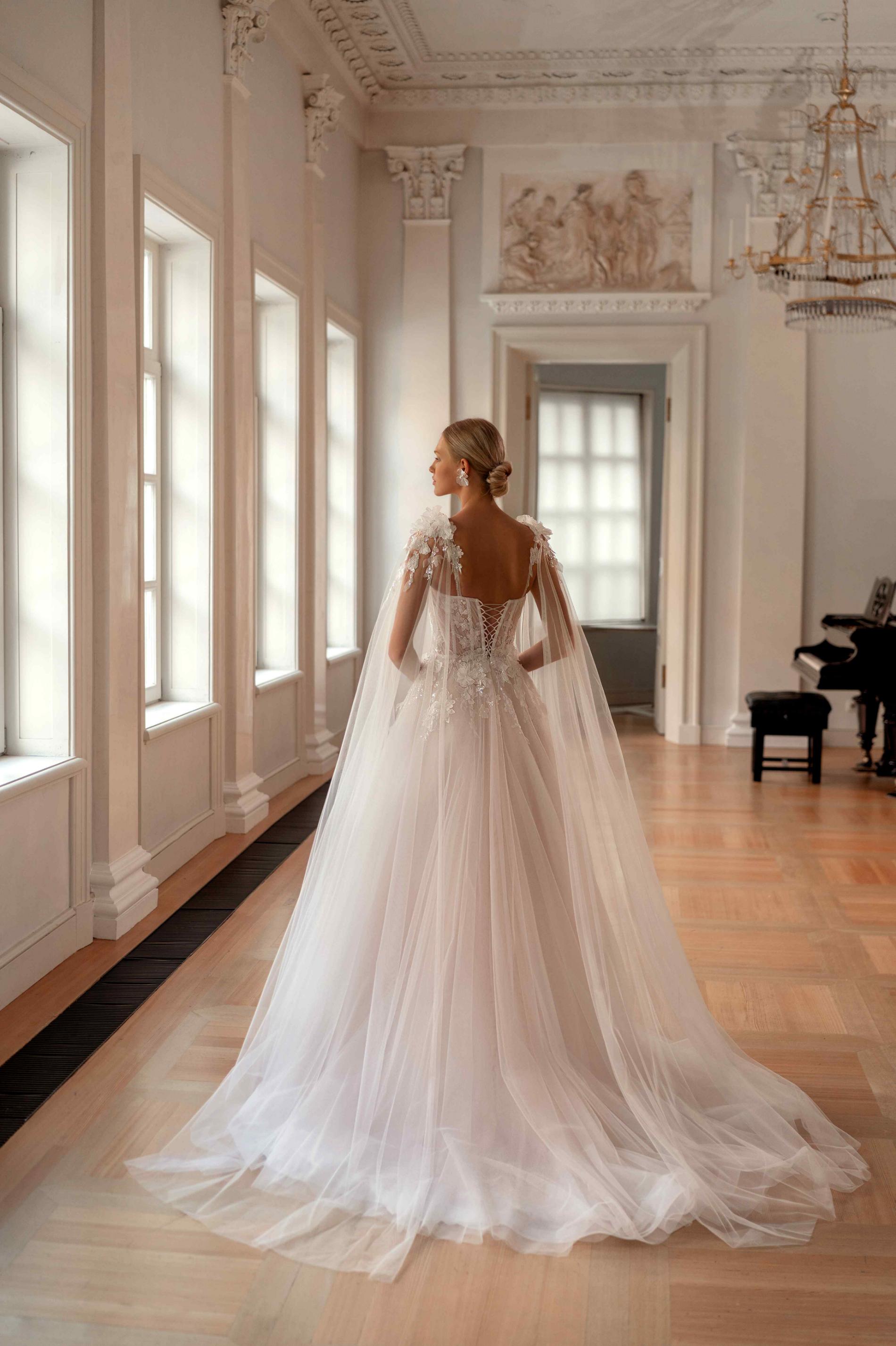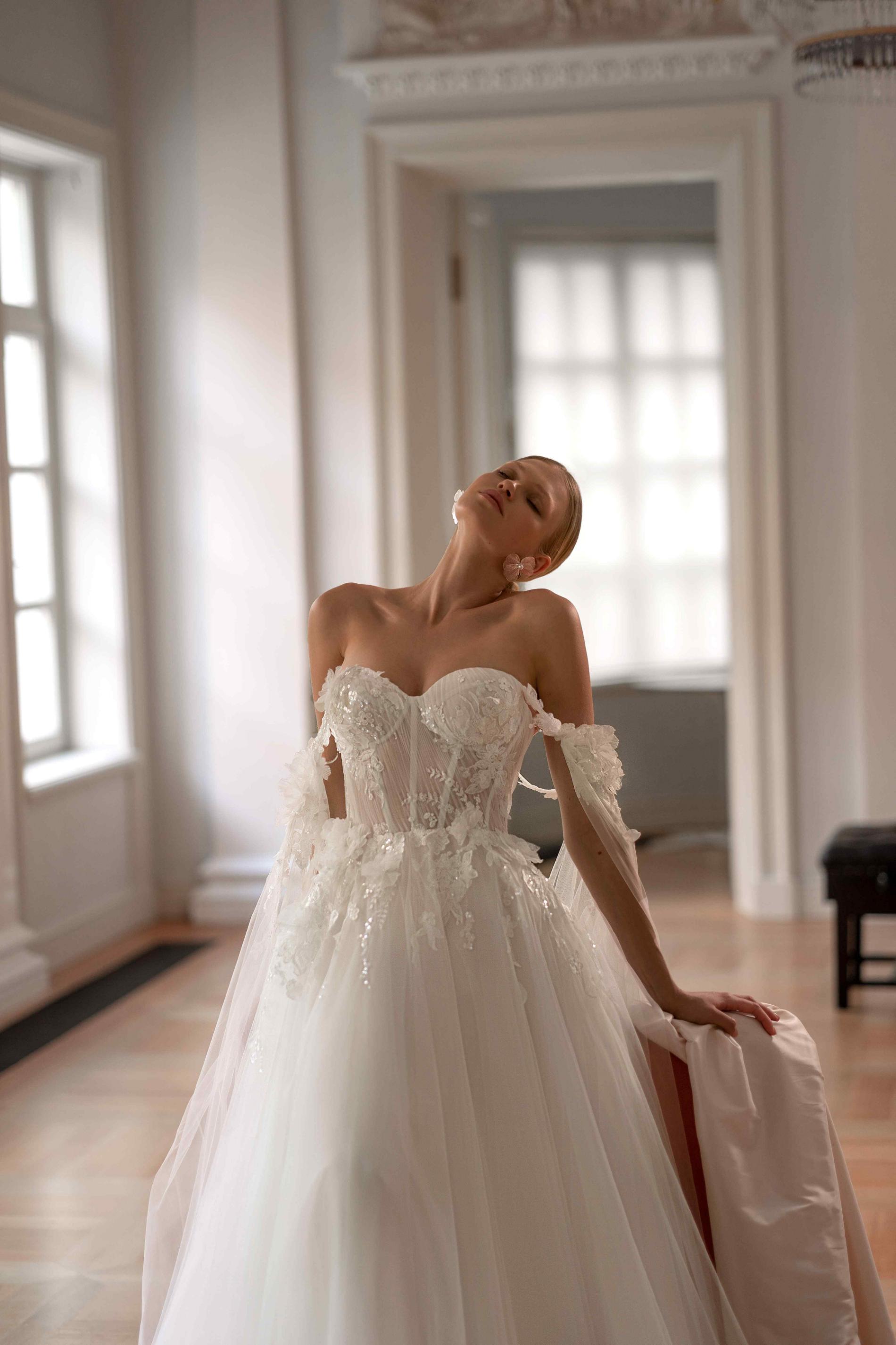 Свадебное пышное платье с прозрачным корсетом, объемными вышитыми плечами и длинными полупрозрачными накидками-рукавами. Наряд выглядит волшебно и утончённо