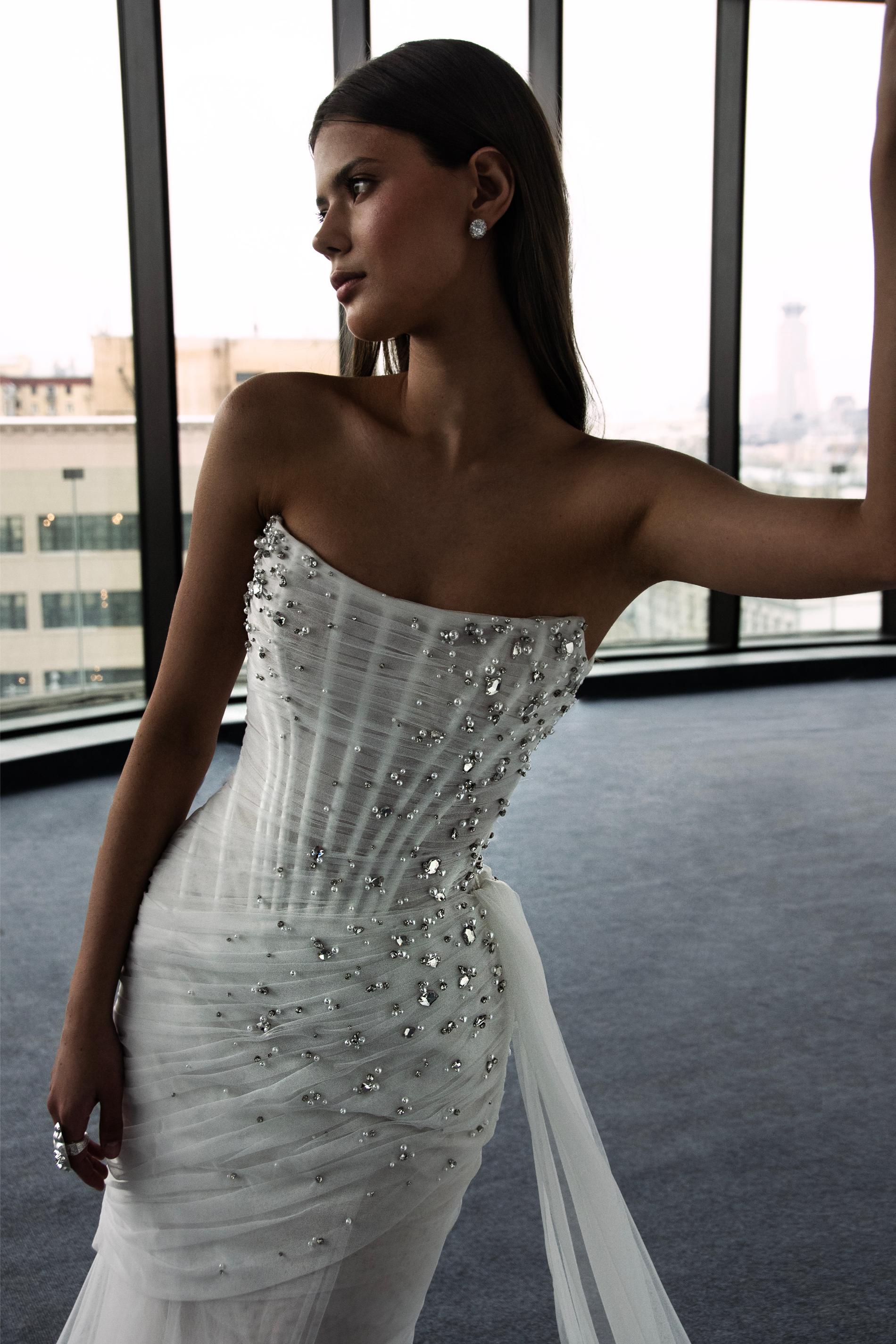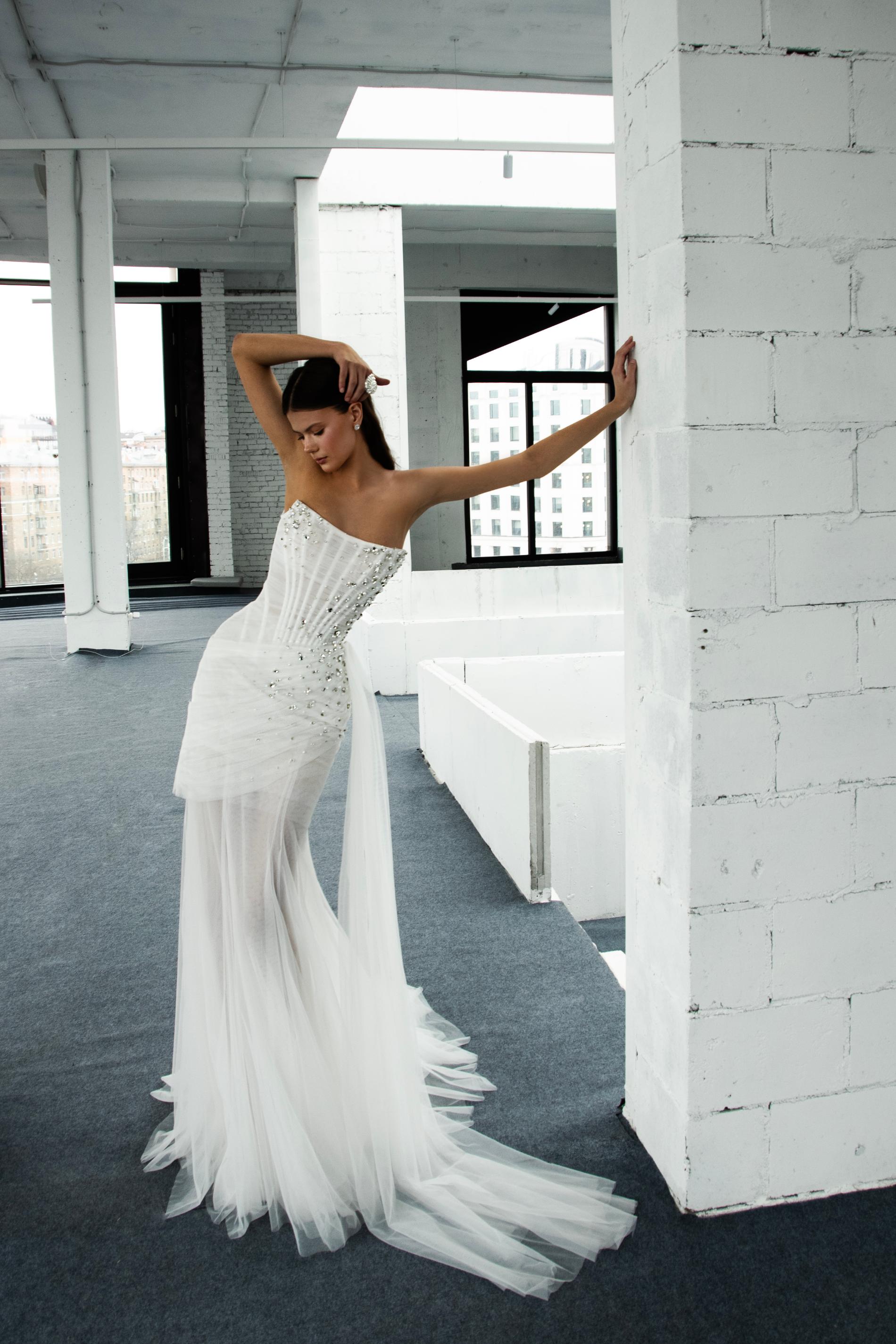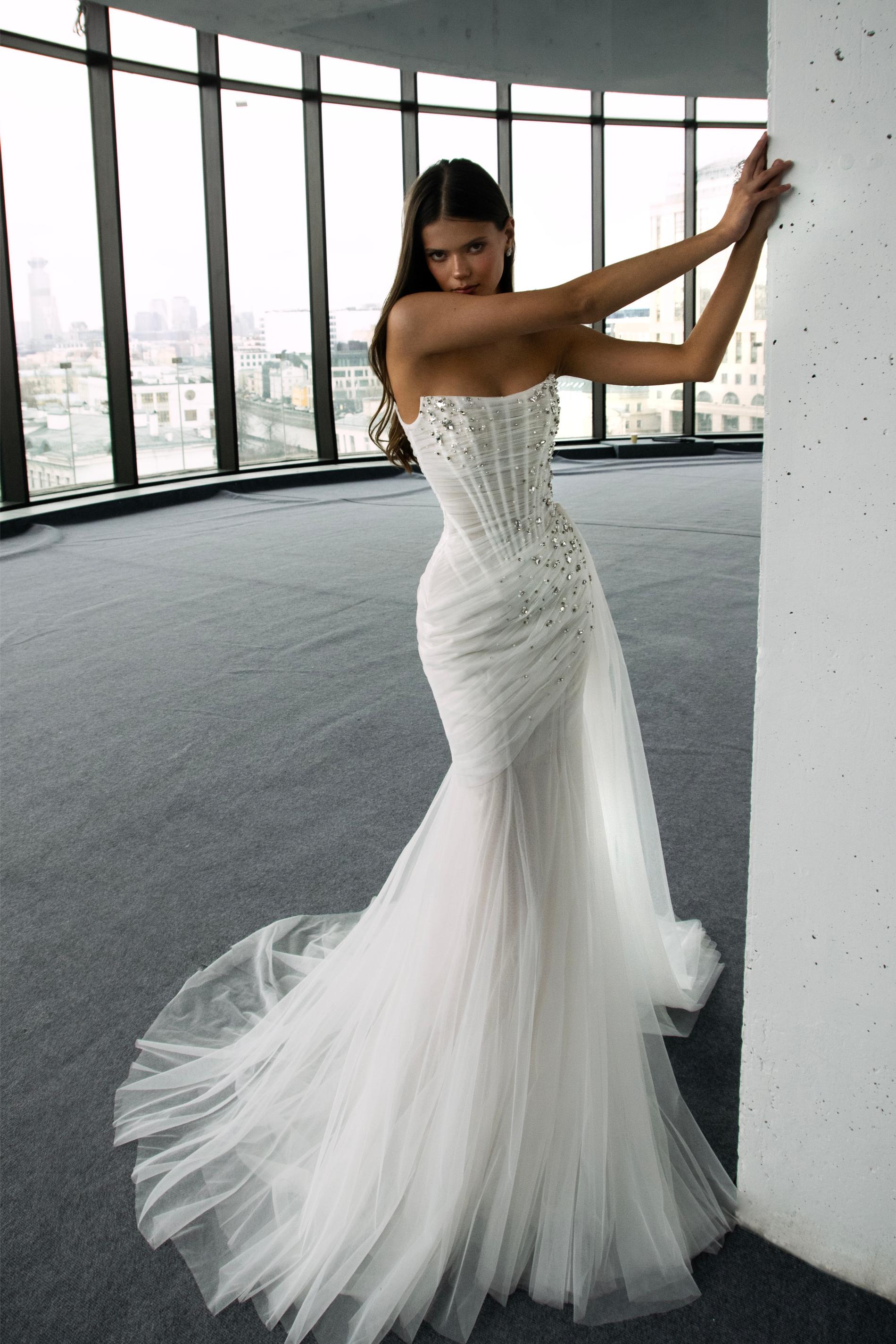 Свадебное платье выполнено из легкого тюля с драпировкой по всей длине корсета, создавая эффект нежных складок. Лиф асимметричный, на одно плечо, открывает линию декольте и отличается элегантным силуэтом. Вся поверхность лифа и бедер расшита сияющими стразами и бусинами, добавляющими образу эффектного блеска.