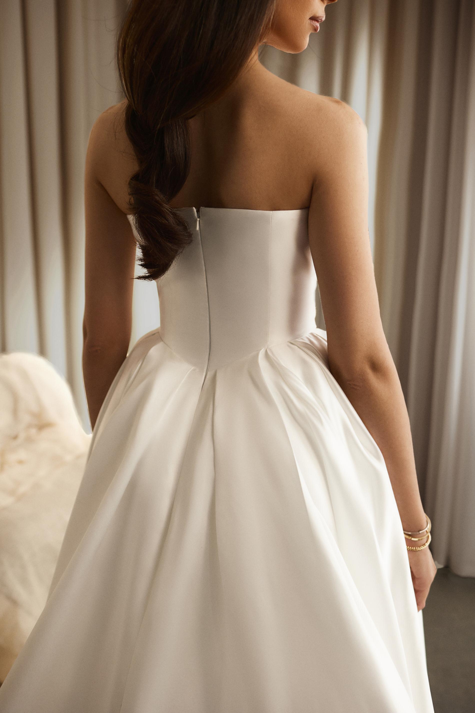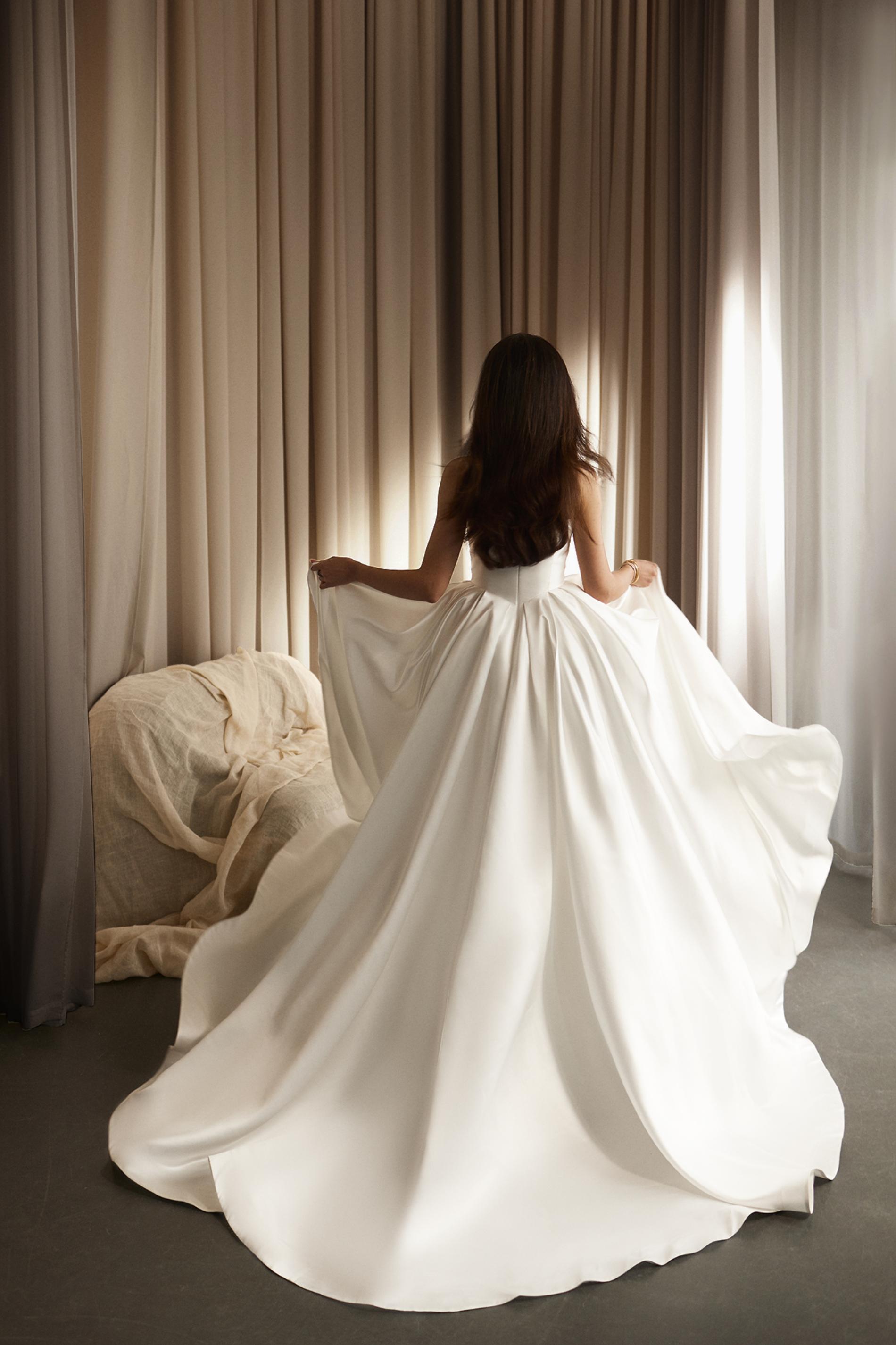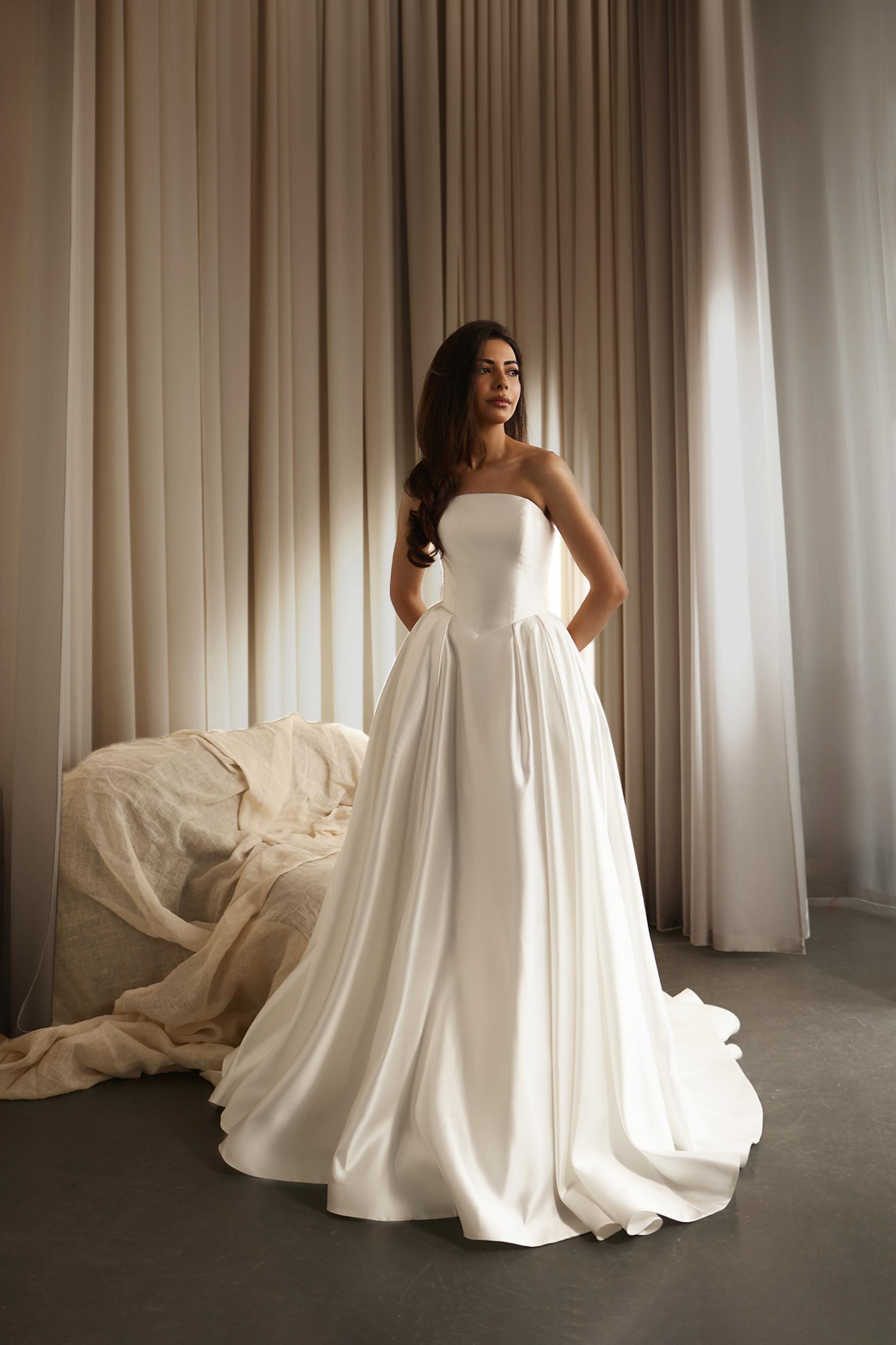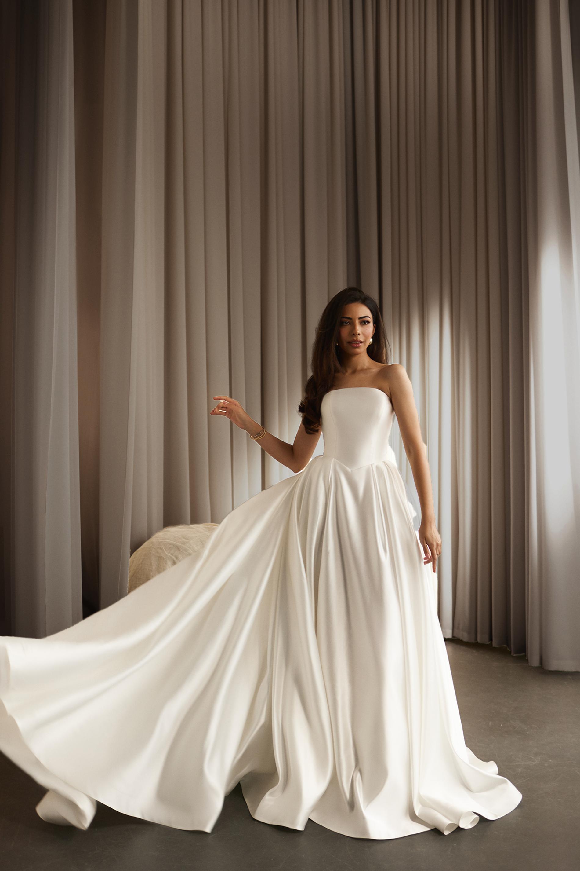 Свадебное платье выполнено из роскошного сатина, создающего эффект струящейся ткани. Корсет без бретелей с прямым вырезом переходит в объемную юбку с длинным шлейфом. Классический силуэт А-силуэта подчеркивает фигуру и добавляет торжественности.