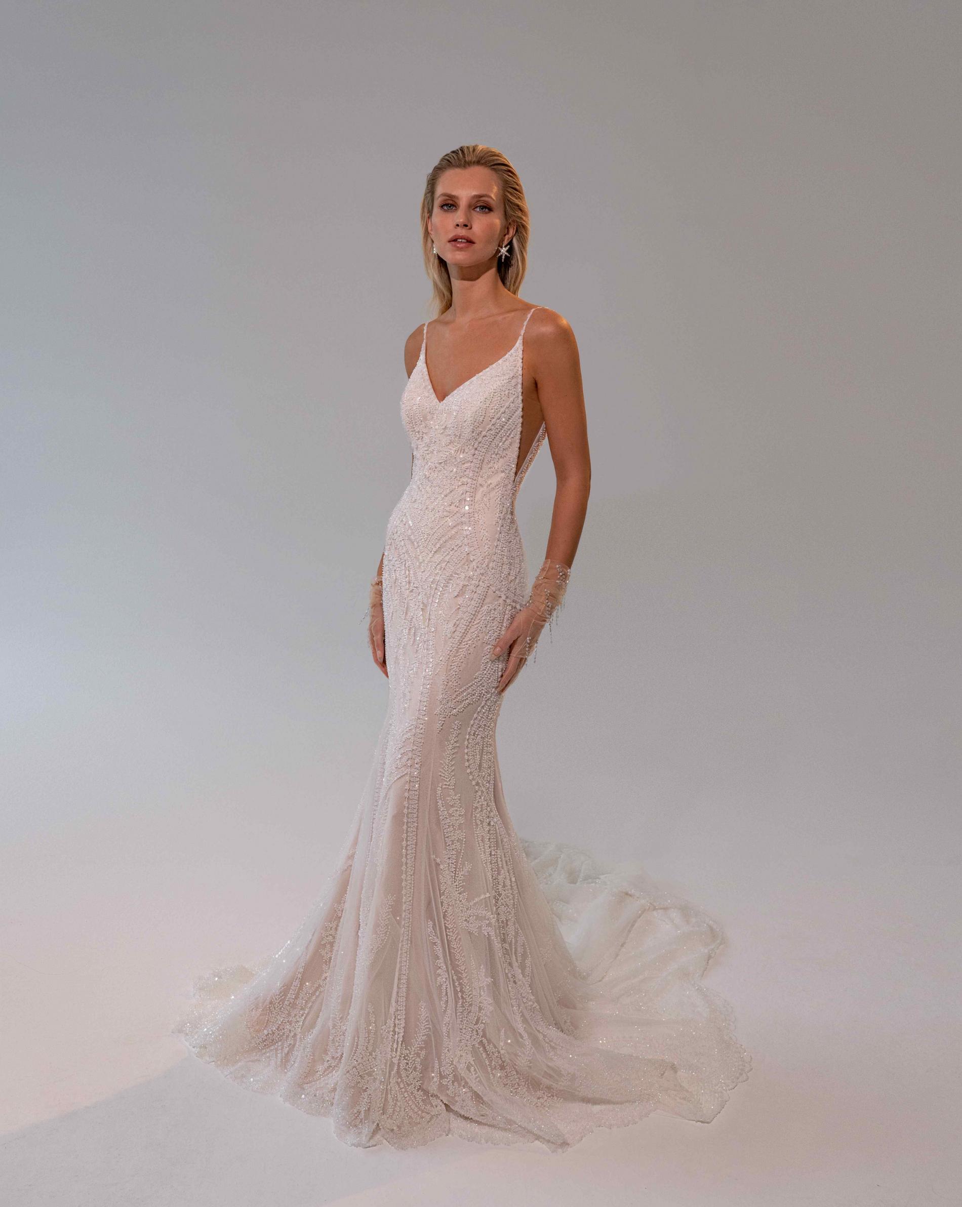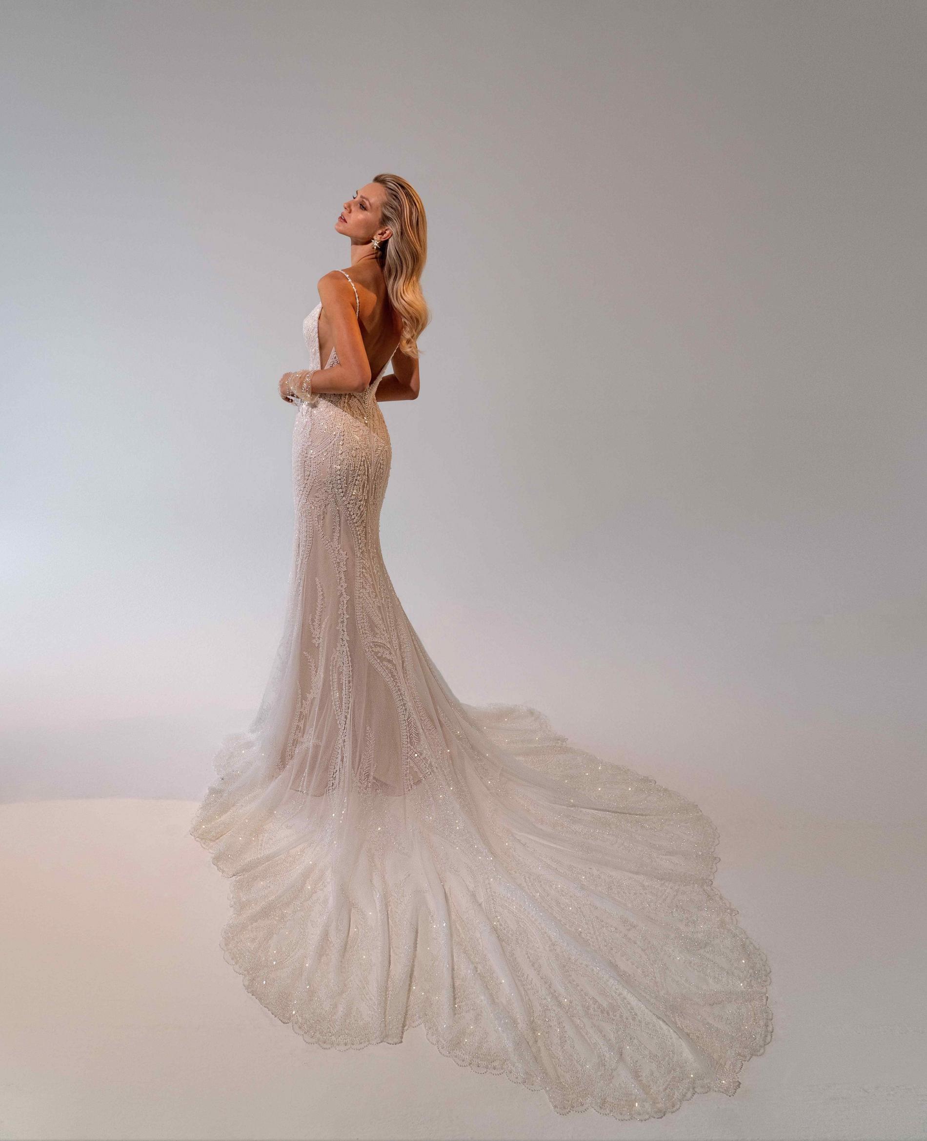 Свадебное платье силуэта «русалка» выполнено из легкой ткани с блестящей отделкой, идеально подчеркивает фигуру и создает элегантный образ невесты. Открытая спина на тонких бретелях, эффектный шлейф и современный дизайн делают модель отличным выбором для стильной свадьбы.