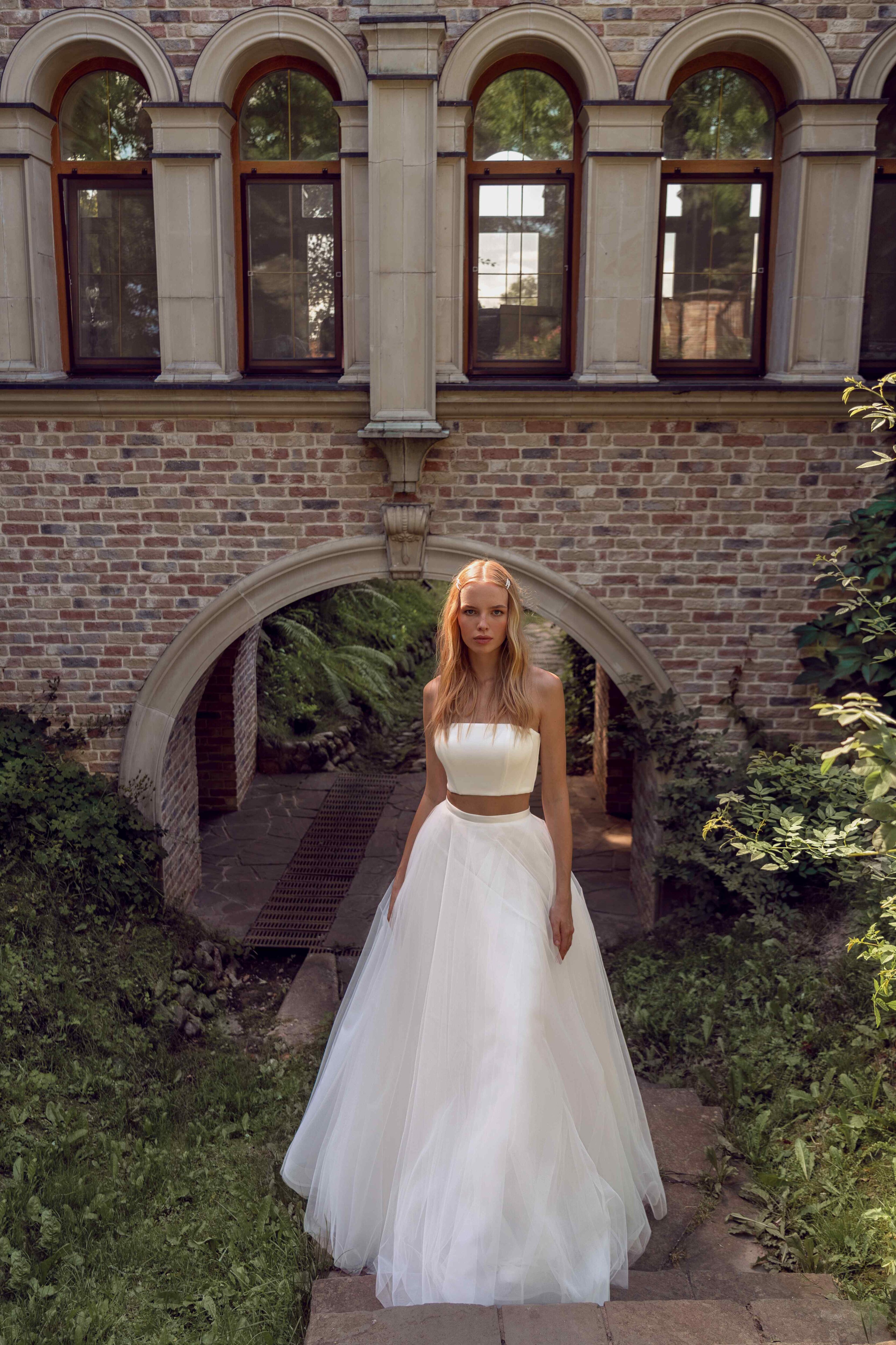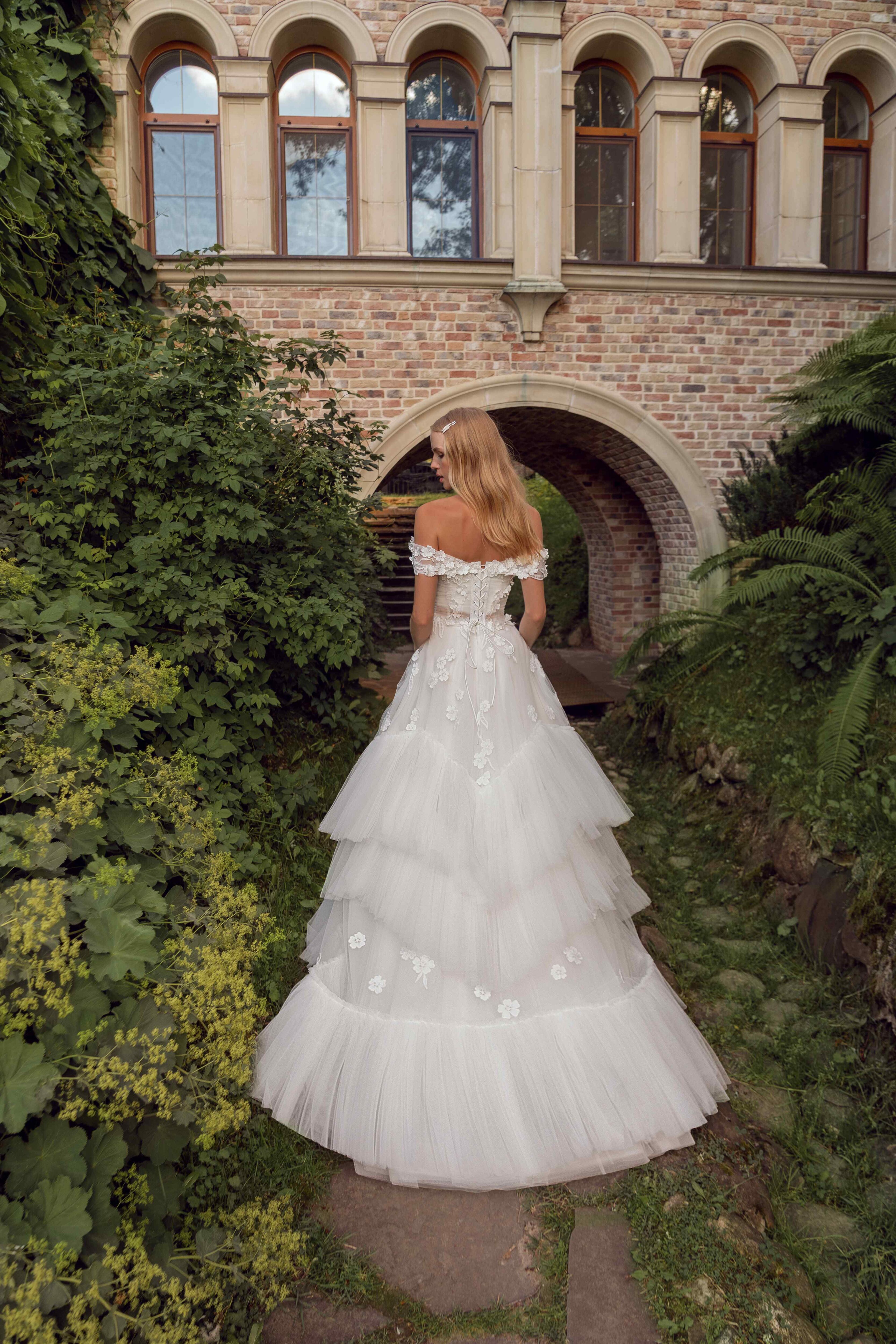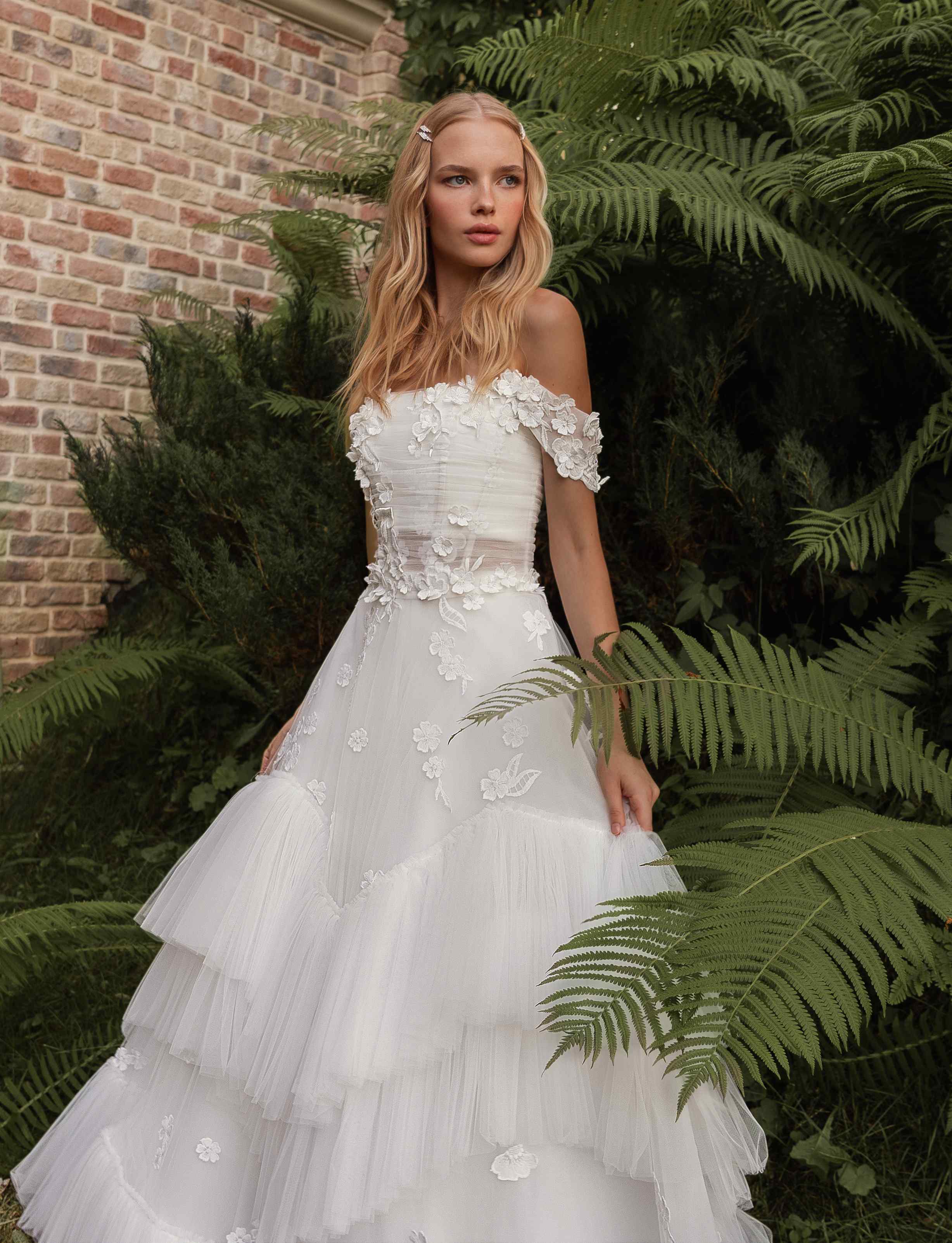 Романтичное свадебное платье, из многослойного фатина, с открытыми плечами, ажурными вставками и объемными аппликациями. Юбка выполнена каскадом оборок, создавая пышный и женственный силуэт.