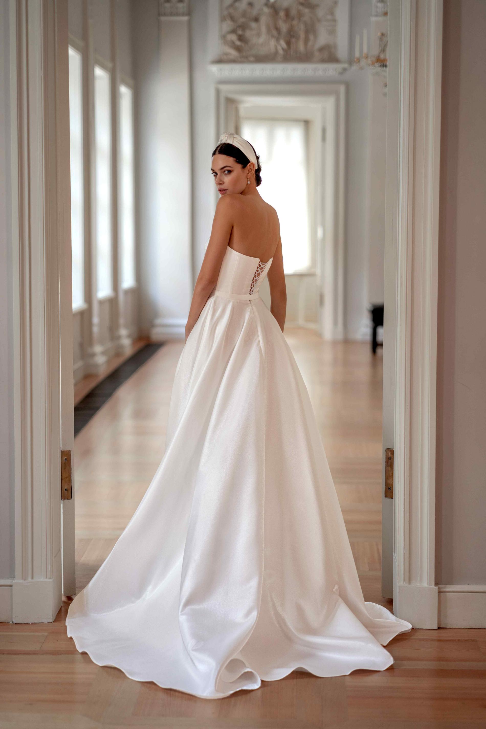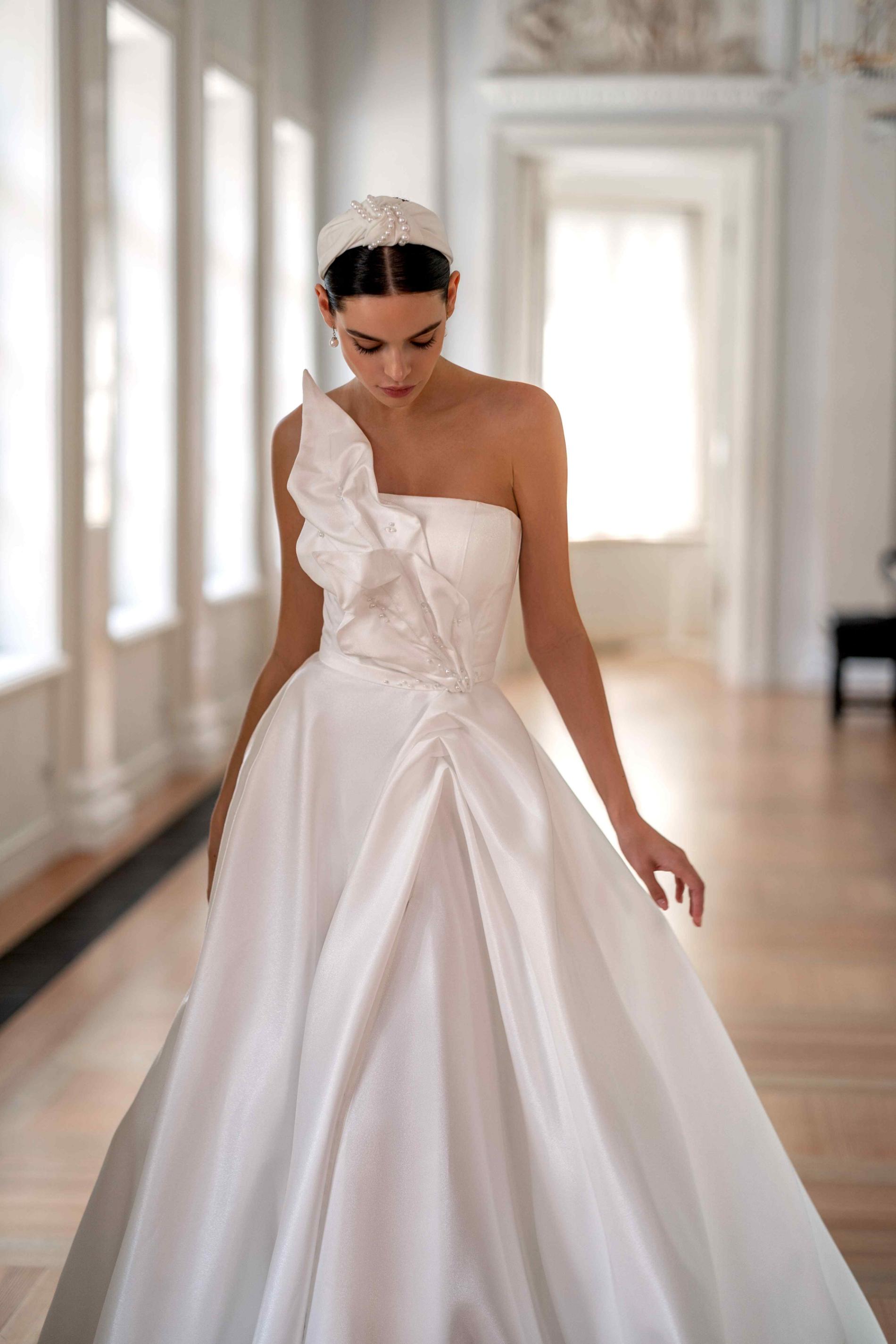 Свадебное платье А-силуэта современного кроя выполнено из гладкой сияющей ткани. Модель с одним открытым плечом, декорирована объемной рюшей и асимметричной драпировкой на лифе. В юбке высокий разрез, визуально удлиняющий ноги и добавляющий легкость образу.