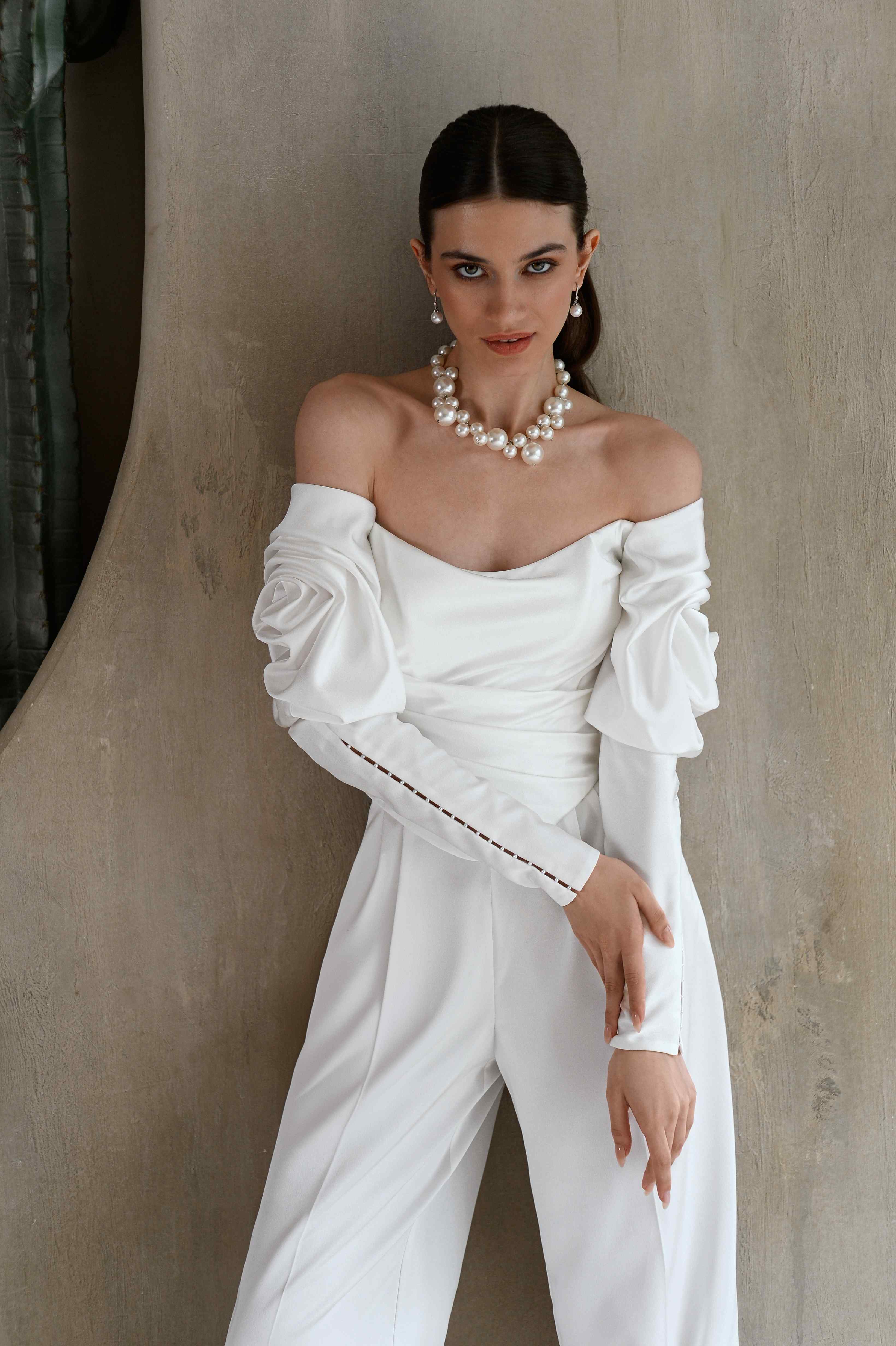 Современный свадебный комбинезон с открытыми плечами. Верх выполнен в корсетной технике с драпировкой, а длинные облегающие рукава декорированы объемными сборками и элегантными швами по длине. Брюки прямого кроя создают модный и необычный свадебный образ.