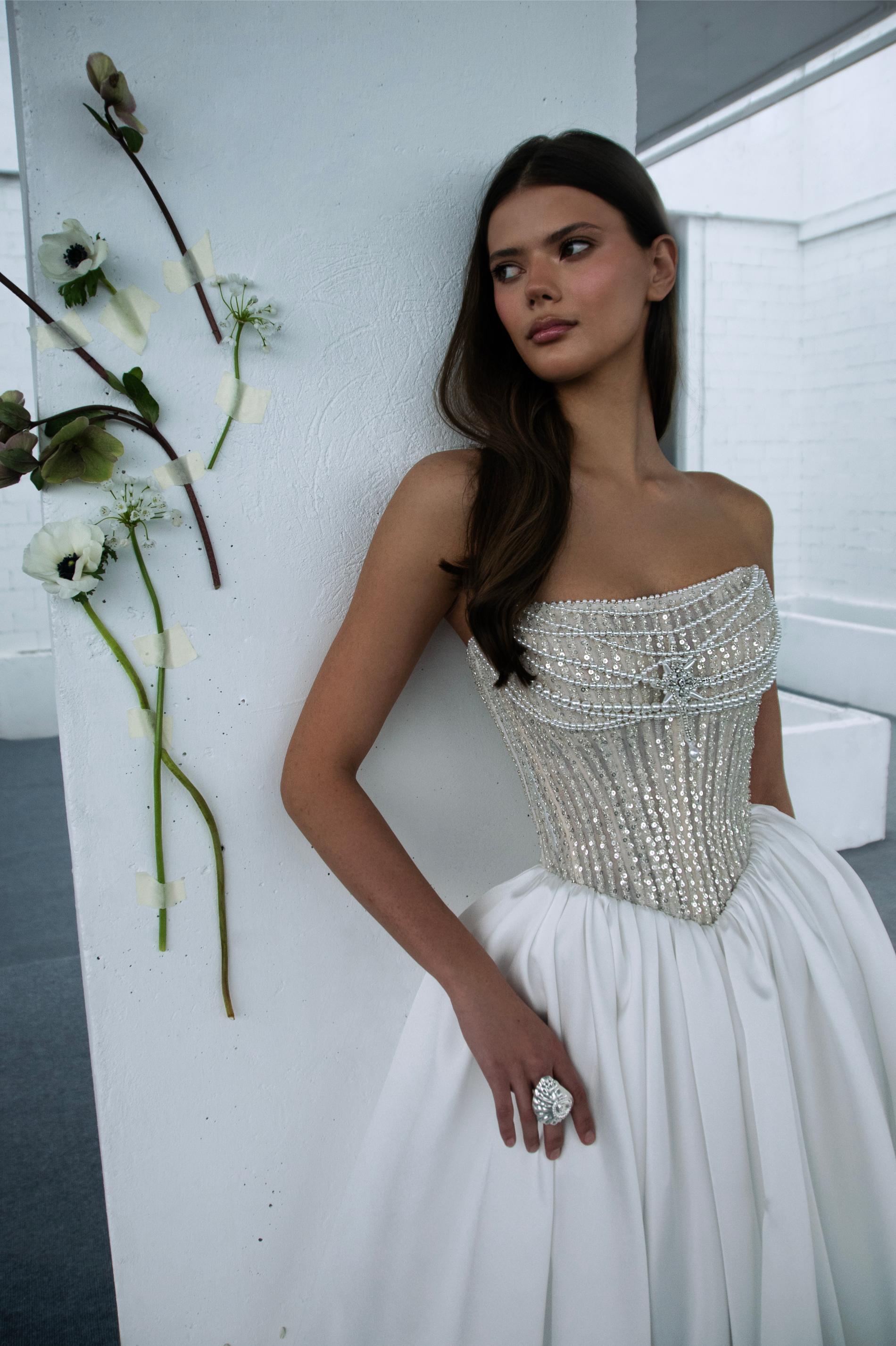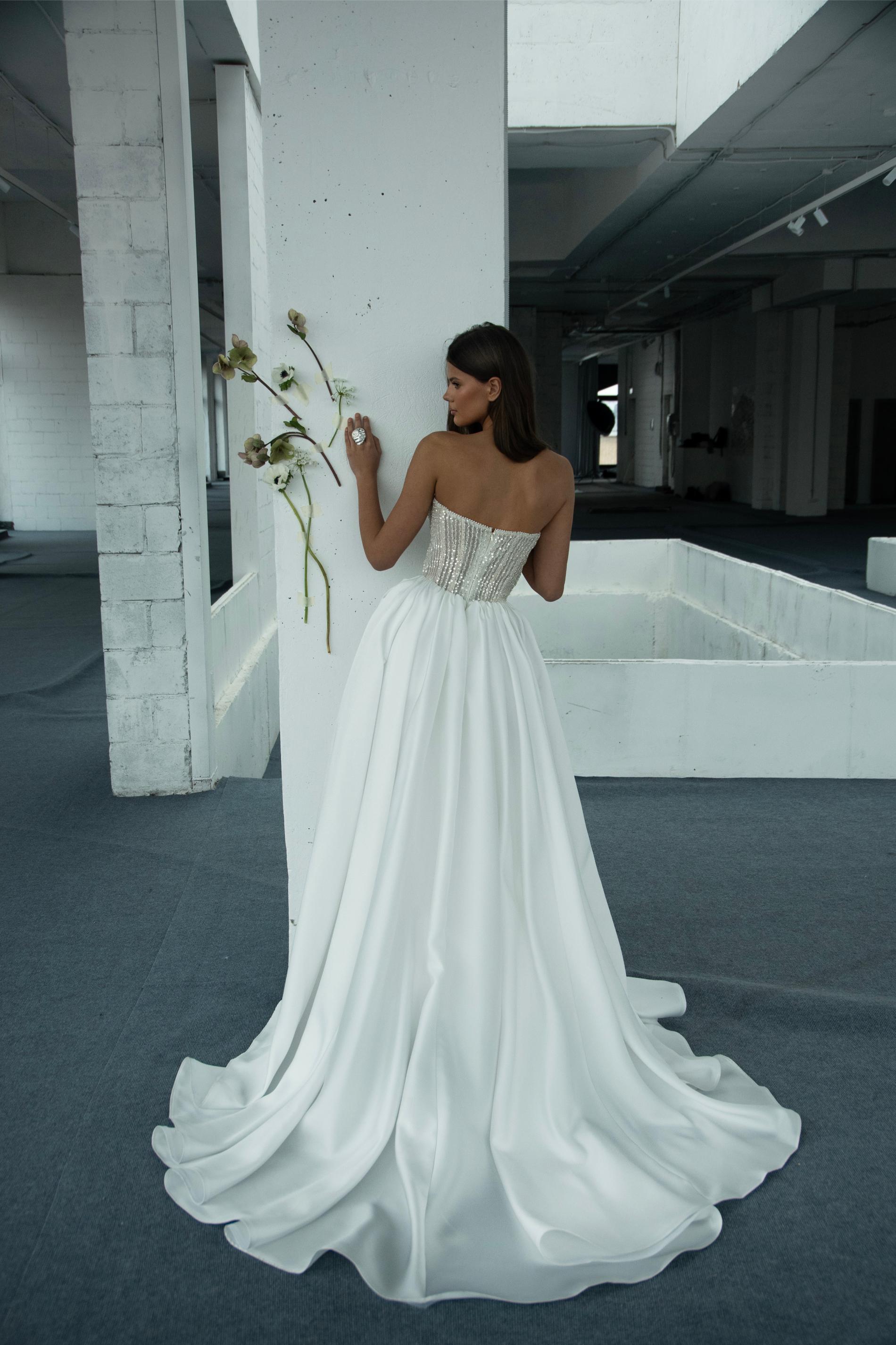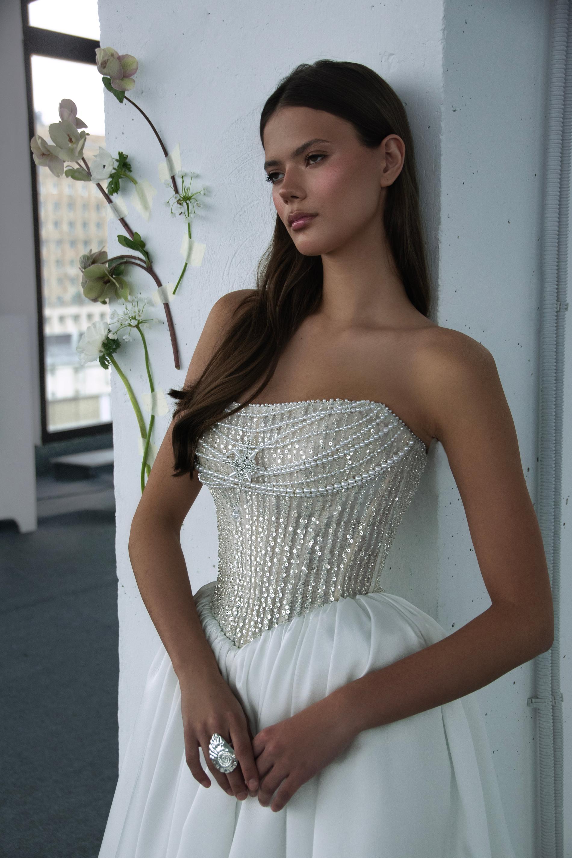 Свадебное платье оформлено корсетом-бюстье, декорированным серебристыми бусинами и пайетками, создающими эффект дорогого ювелирного изделия. Верх плотно прилегает к фигуре и визуально подчеркивает талию за счет скульптурного силуэта. Юбка из гладкой плотной ткани формирует объем A-силуэта и мягко ниспадает в пол многочисленными крупными складками. Такой наряд сочетает в себе блеск и роскошь с классической элегантностью.