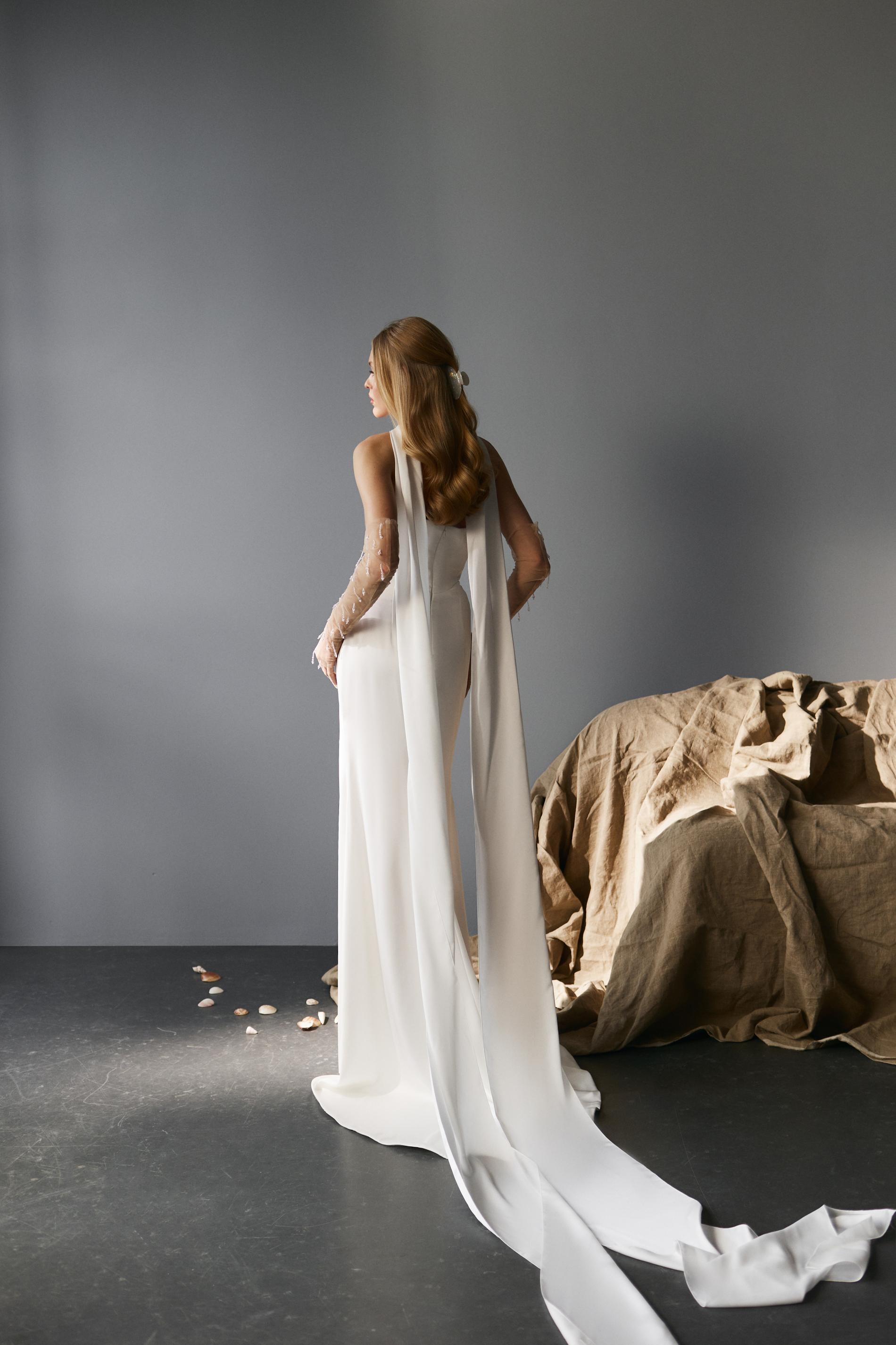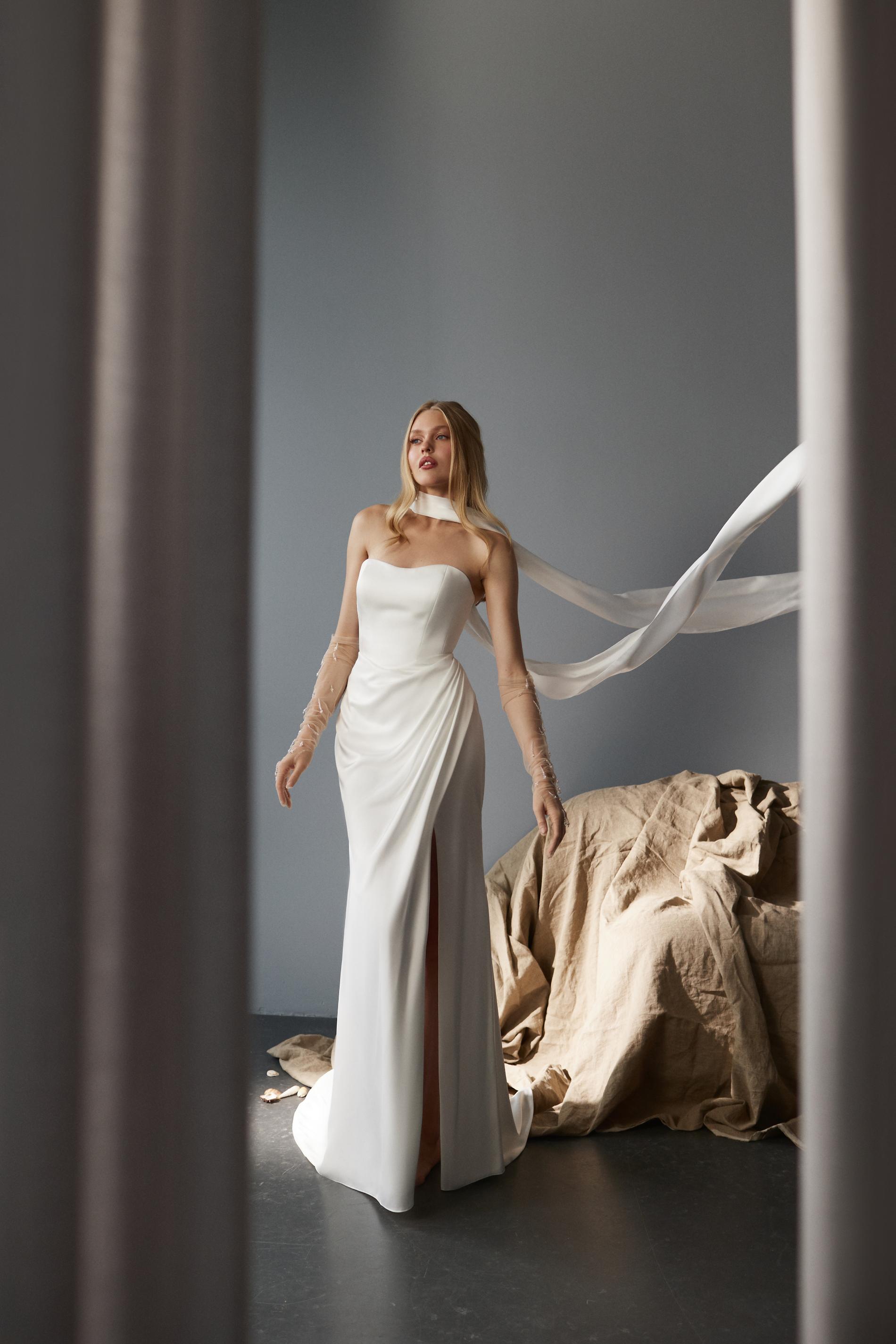 Свадебное платье изготовлено из гладкой белой ткани с легким атласным блеском. Корсет выполнен в стиле «бандо», полностью открывающий плечи и декольте. Драпировка на талии и свободная юбка с разрезом создают изящный и соблазнительный силуэт.