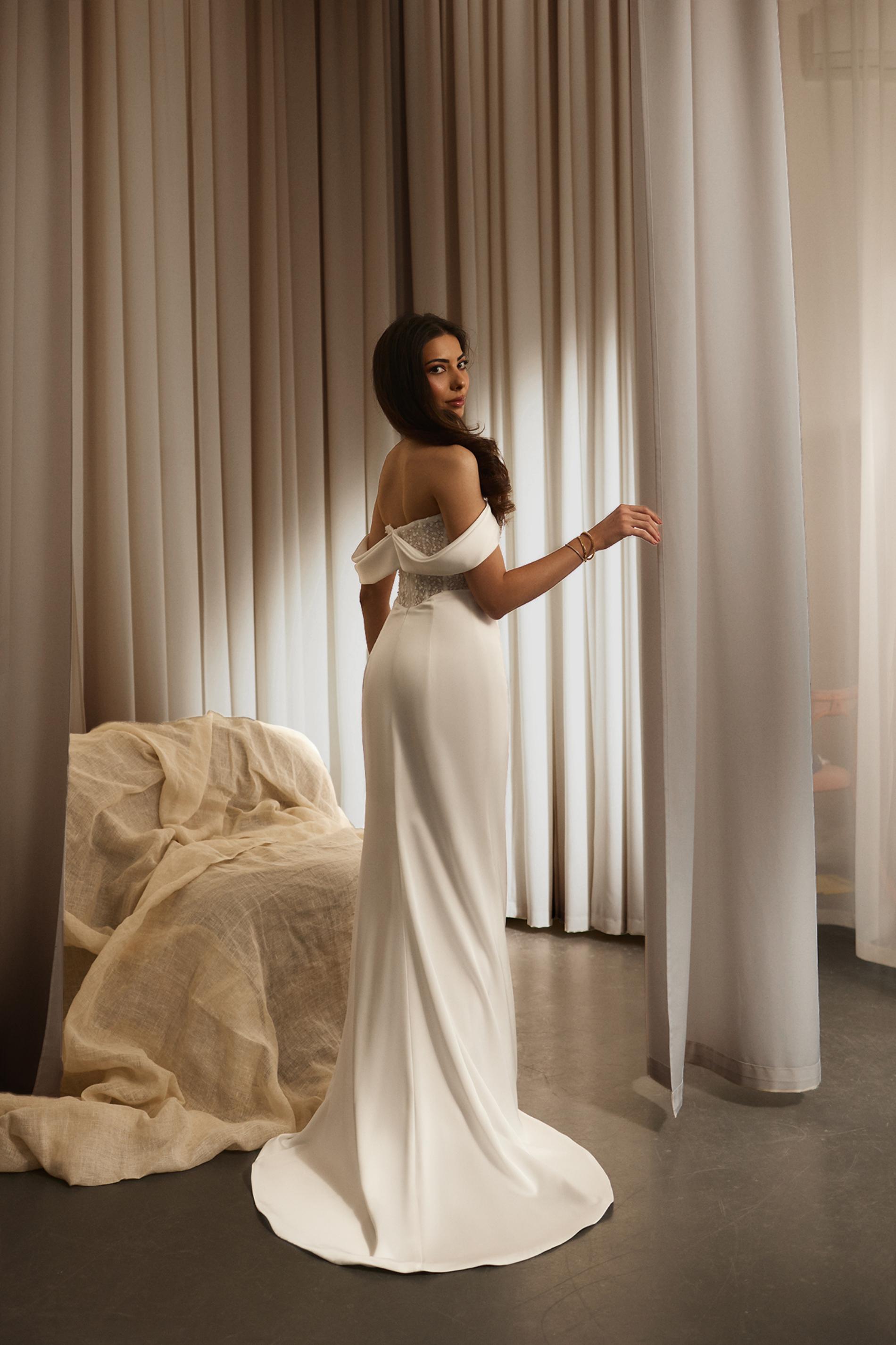 Свадебное платье выполнено из гладкой светлой ткани и имеет шелковистую фактуру. Верх оформлен открытым корсетом с изысканной отделкой, усыпанной сияющими пайетками и бисером. Спущенные бретели придают образу романтичность и подчеркивают линию плеч. Юбка платья облегающая с драпировкой и высоким разрезом на ноге, благодаря чему силуэт выглядит современно и элегантно.