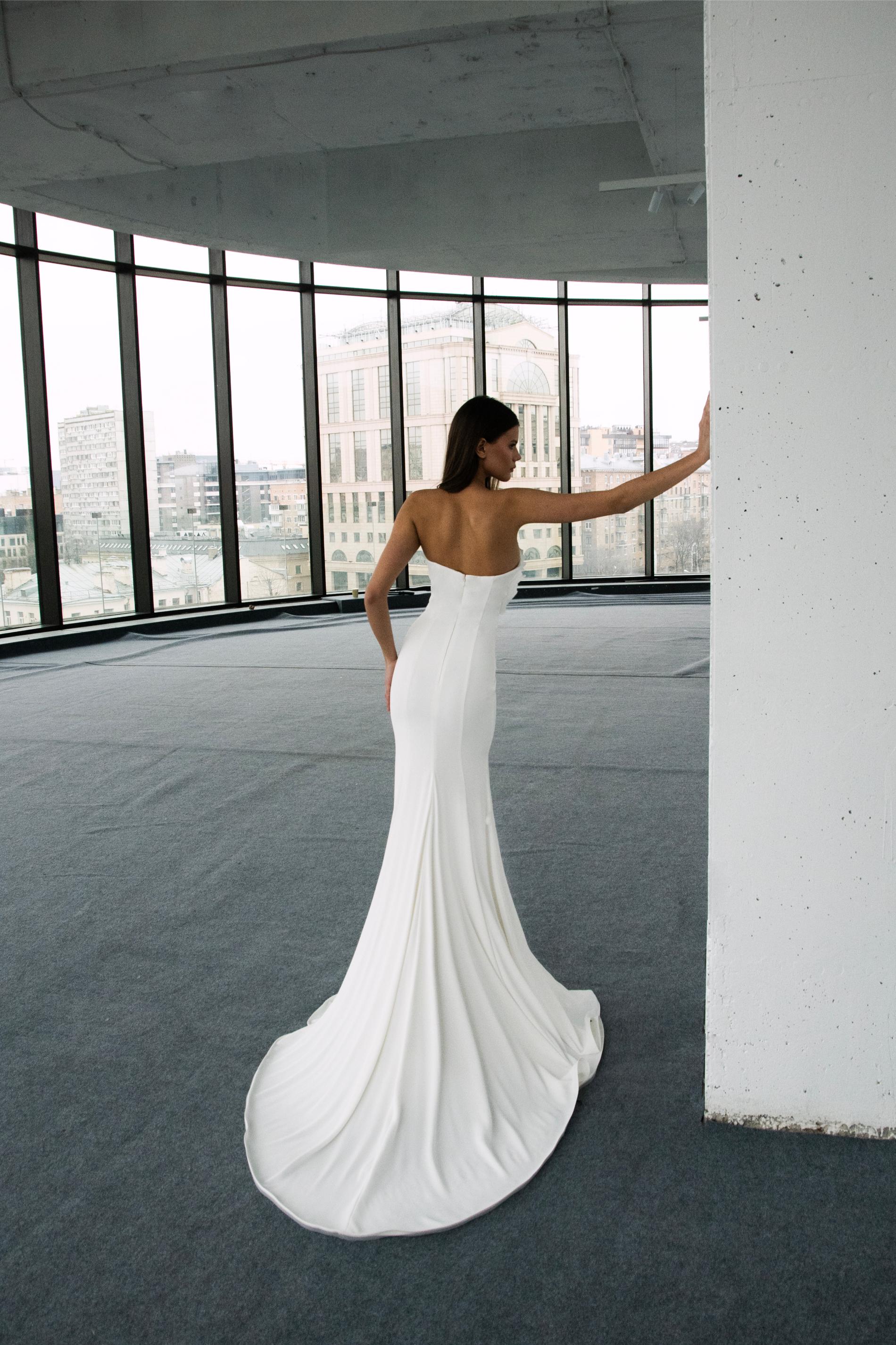 Свадебное платье выполнено из гладкой белой ткани в облегающем, лаконичном фасоне. Верх платья оформлен как корсет-бюстье без бретелей, открывающий плечи и подчёркивающий линию декольте. На корсете расположены крупные объемные цветы из ткани, создающие акцент и декоративную асимметрию. Юбка длинная, прямая, плавно переходит в небольшой шлейф, завершая элегантный и современный образ.