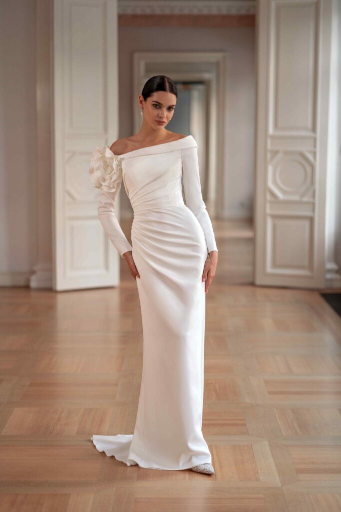 Свадебное платье прямого кроя, выполненное из гладкой ткани, с асимметричным открытым плечом и длинным рукавом. На плече украшение в виде объемной текстильной розы, а мягкая драпировка подчеркивает талию. Минималистичный дизайн придает образу современность и изысканность.