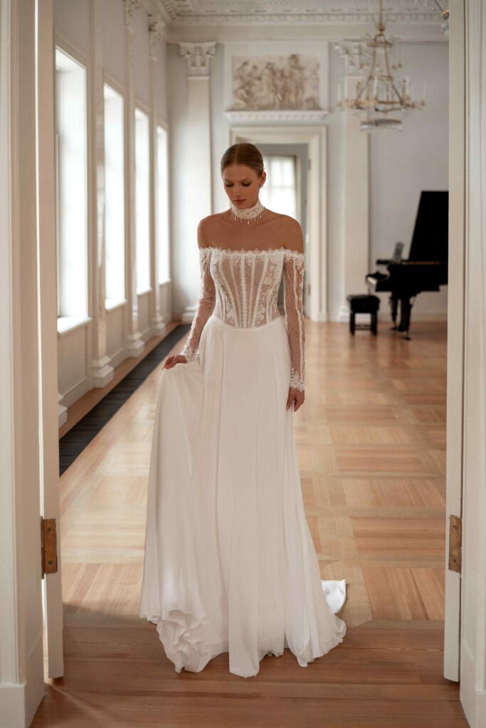Свадебное платье-бюстье с прозрачным корсетным верхом и длинными рукавами из кружева. Юбка свободно ниспадает из легких струящихся тканей, создавая нежный шлейф. Выразительный воротник-чокер и детальная вышивка делают образ утончённым и элегантным.