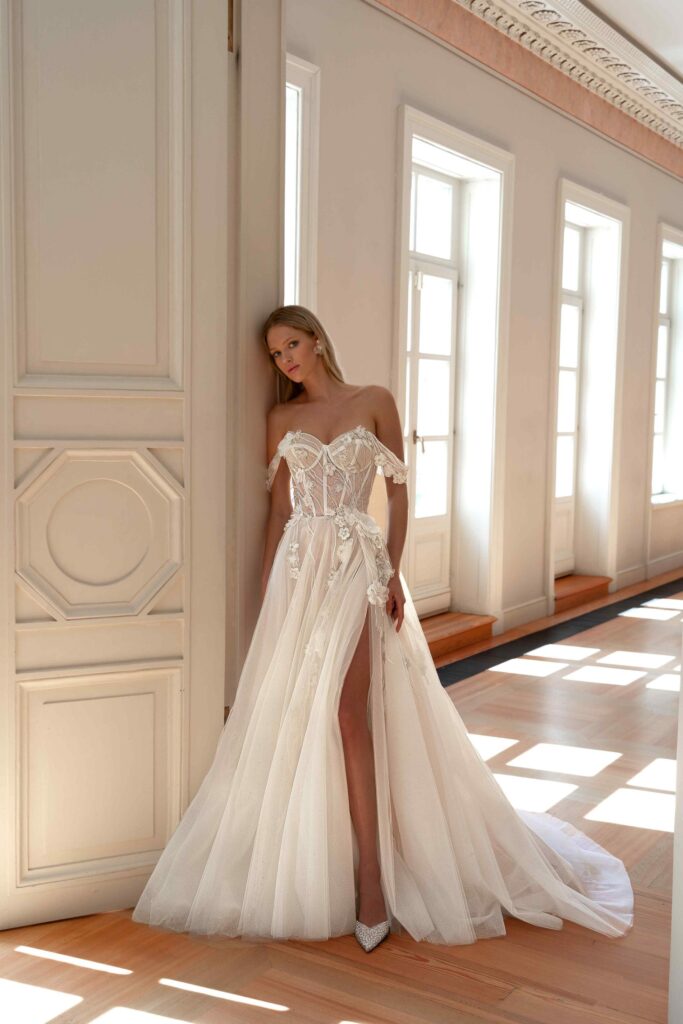 Свадебное платье с открытыми плечами и корсетным прозрачным лифом, украшенным изящной вышивкой и объемными аппликациями. Юбка легкая, воздушная, выполнена из многослойной ткани с мерцающим эффектом и высоким разрезом, подчеркивающим стройные ноги.