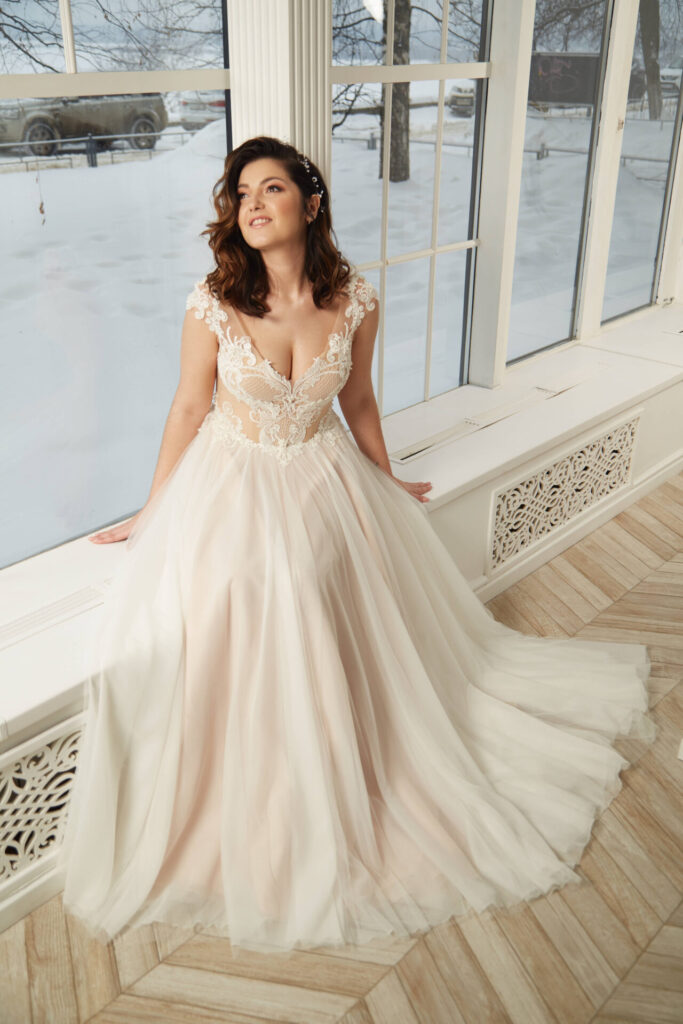 Свадебное платье выполнено из лёгкой многослойной ткани, создающей объемный и воздушный силуэт. Лиф украшен кружевом и прозрачными вставками, придающими наряду романтичность и утонченность. Глубокий вырез и открытые плечи подчёркивают женственность и грацию фигуры. Такой фасон идеально подойдёт для торжественной церемонии в классическом или сказочном стиле.