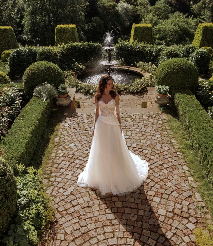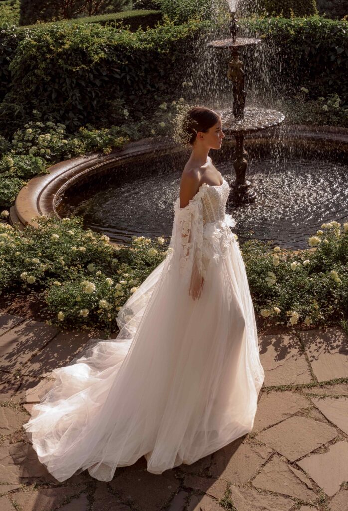 Свадебное платье — корсетное, с фактурной отделкой цветочными аппликациями. Сверкающая отделка сочетается с объёмными рукавами и прозрачной тюлевой юбкой, создавая по-настоящему сказочный и изысканный образ.