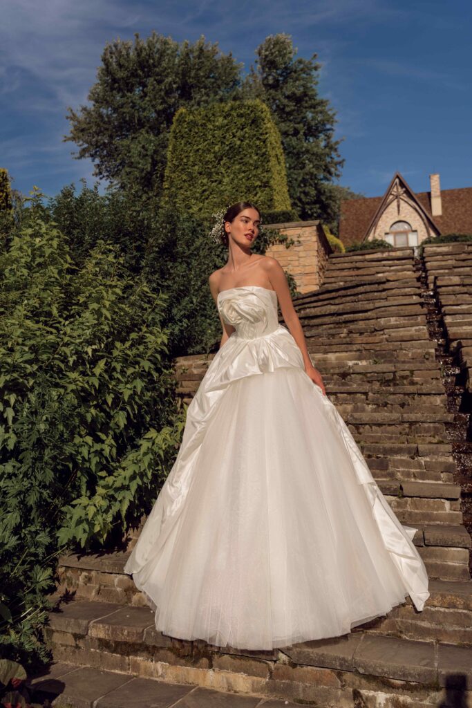 Свадебное платье — пышное и торжественное, с лифом из плотной драпированной ткани и объемной юбкой из тюля. Верх платья оформлен мягкими складками, что добавляет эффектный объем и классическую линию декольте.