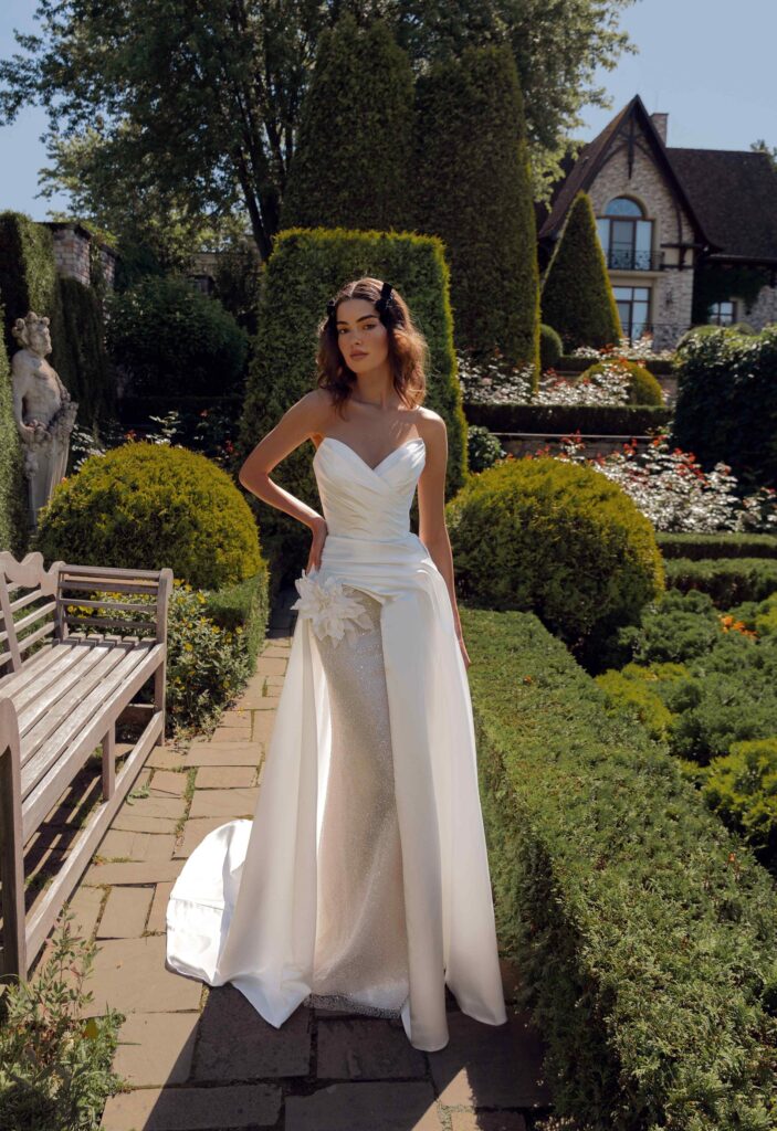 Свадебное платье — оригинальное двухслойное, где верхний слой выполнен из атласной ткани с драпировкой, а нижний — из расшитого бисером полупрозрачного материала. Верх с запахом и декором в виде цветов, силуэт прямой и очень современный.