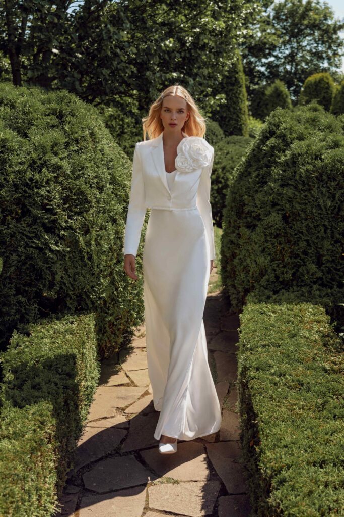 Свадебное платье выполнено в минималистичном стиле — это длинное, струящееся свадебное платье на тонких бретелях с V-образным вырезом и прямым свободным кроем. Ткань гладкая и слегка струящаяся, без декора, придаёт образу элегантность и лёгкость. Образ дополнен коротким жакетом на одной пуговице с акцентом в виде объемного тканевого цветка на плече, что придает наряду современность и […]