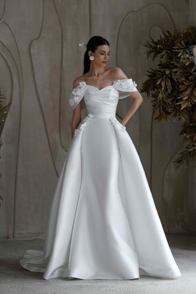Свадебное мини-платье с корсетным верхом, выполненное из белой ткани, украшенной объёмными кружевными цветами. Лиф без бретелей с вырезом-сердечком красиво акцентирует плечи и линию декольте. Короткая юбка А-силуэта смотрится свежо и актуально. Образ дополнен фатиной свадебной фатой с мелкими точками и жемчужным ожерельем.