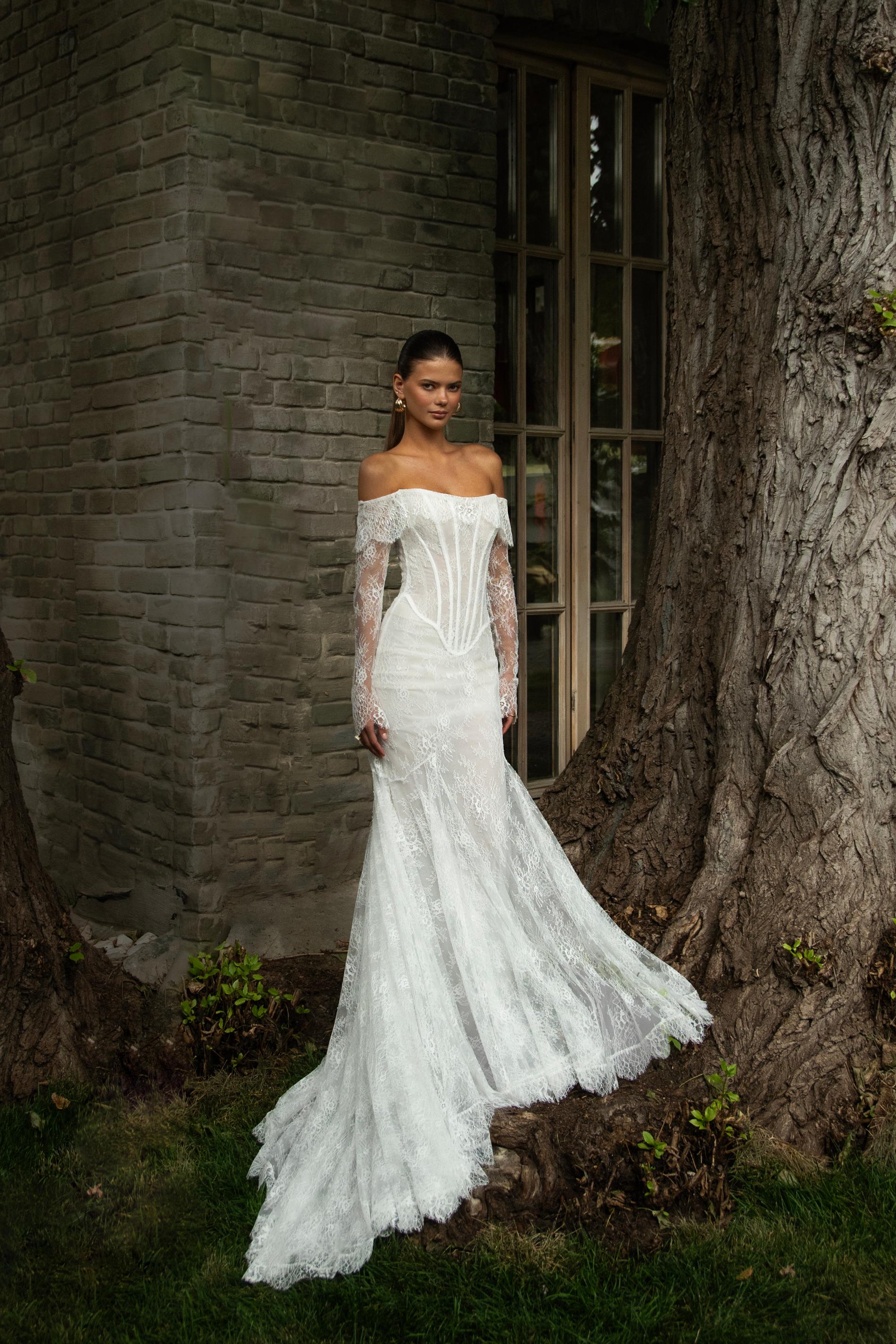 Свадебное платье выполнено из белого кружева с выразительным геометрическим корсетом и длинными рукавами. Верх платья спущен с плеч, образуя элегантный открытый вырез. Лиф и рукава украшены тонким узором, а на бедрах формируется невесомая драпировка. Юбка прямого силуэта с глубоким разрезом спереди и длинным шлейфом завершает утончённый образ.