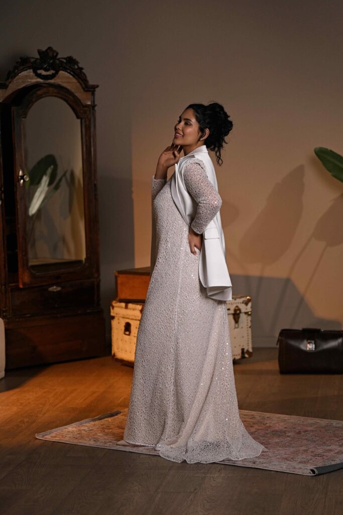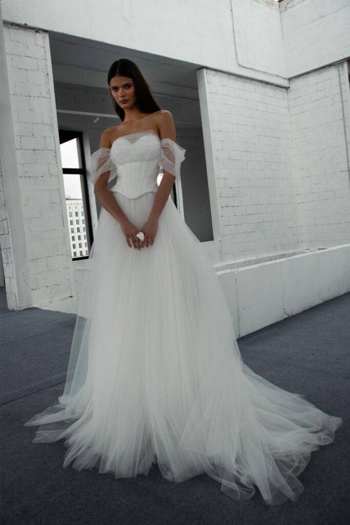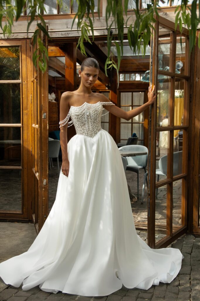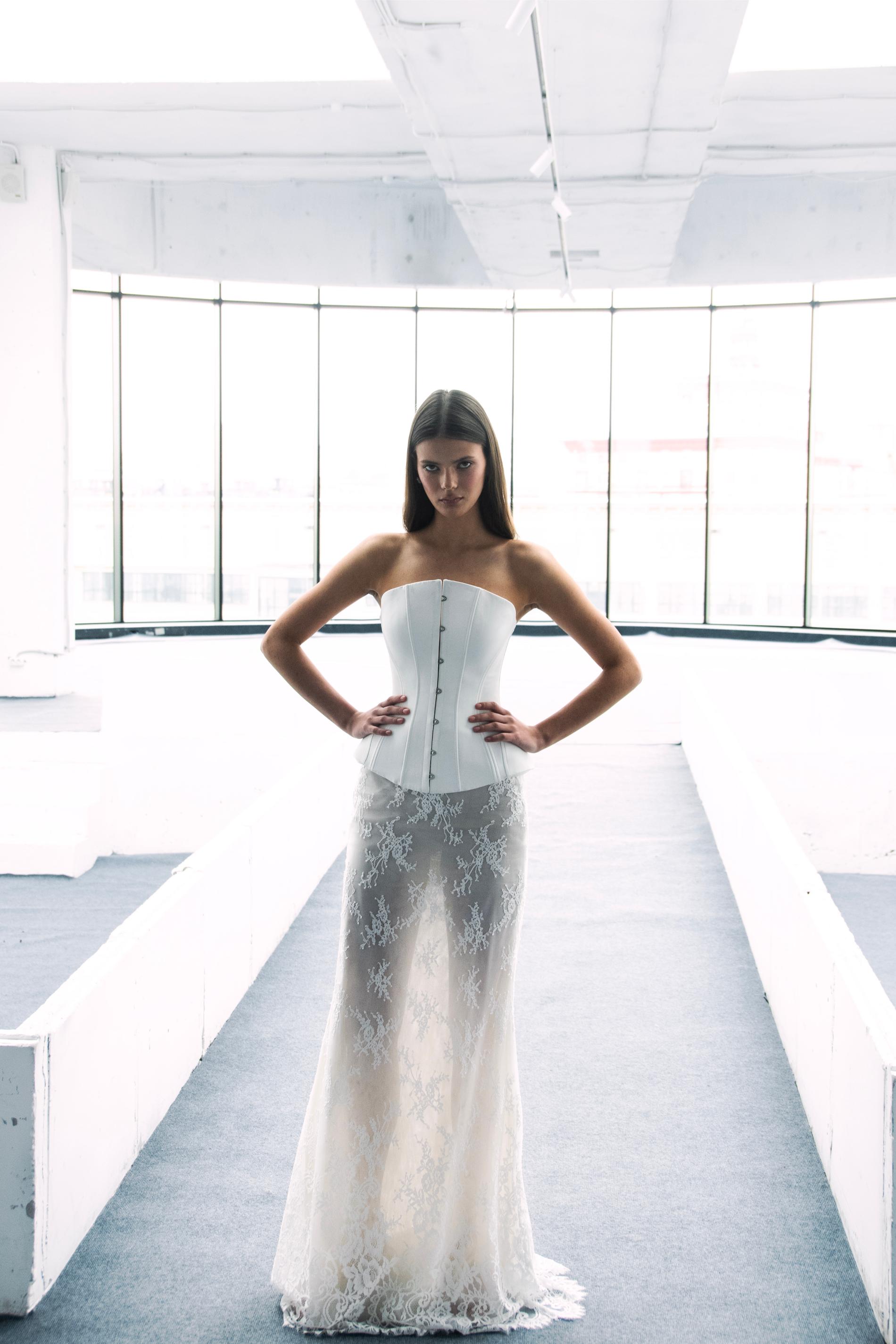 Свадебный наряд состоит из корсета без бретелей с чёткой анатомической формой и актуальной застёжкой на металлические крючки спереди. Верх прилегает к фигуре и подчёркивает линию плеч и талию. Юбка выполнена из бежевой полупрозрачной основы с изящным белым кружевом и орнаментом из цветов и веточек. Лёгкая фактура ткани и прозрачность делают образ чувственным и необычайно элегантным.