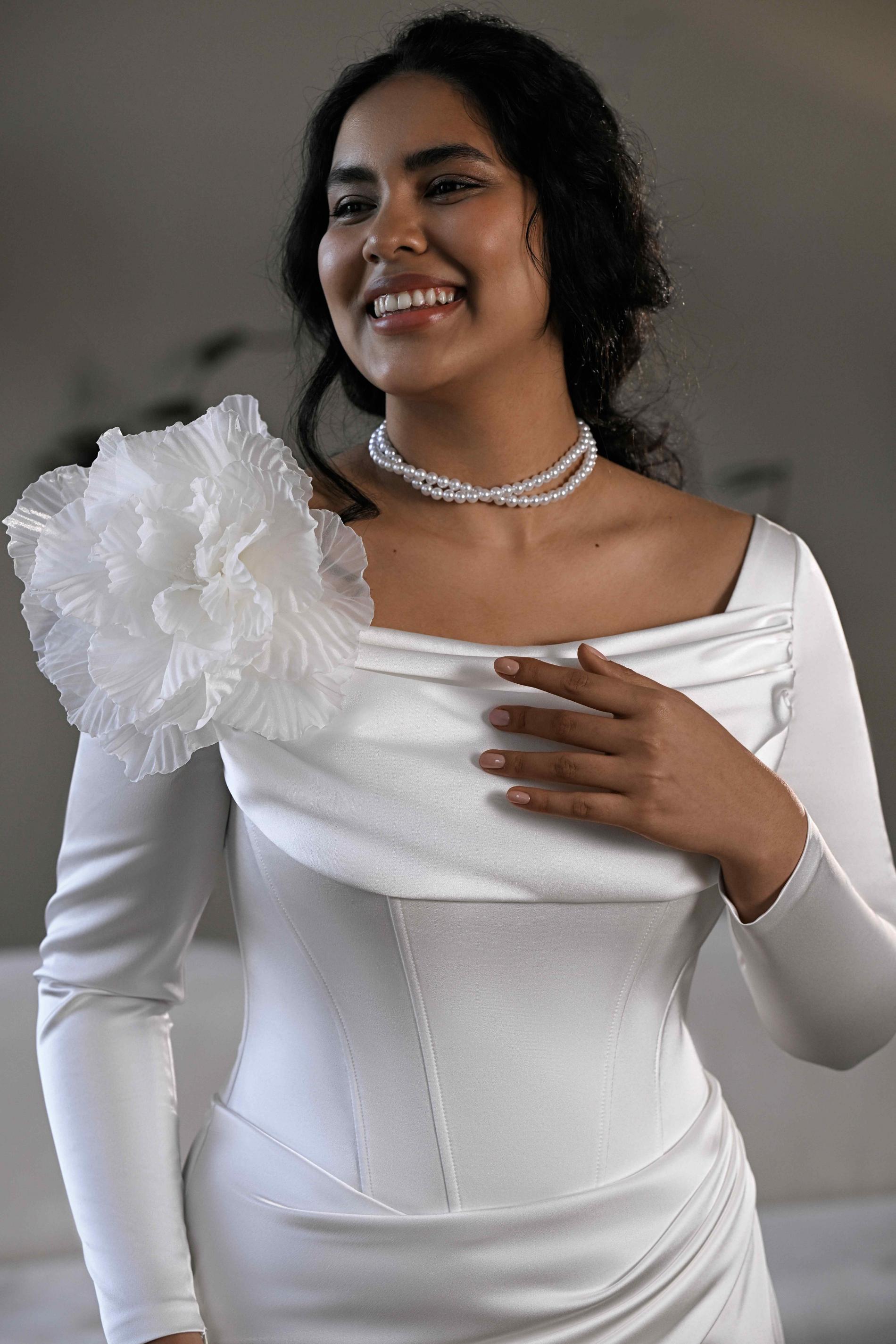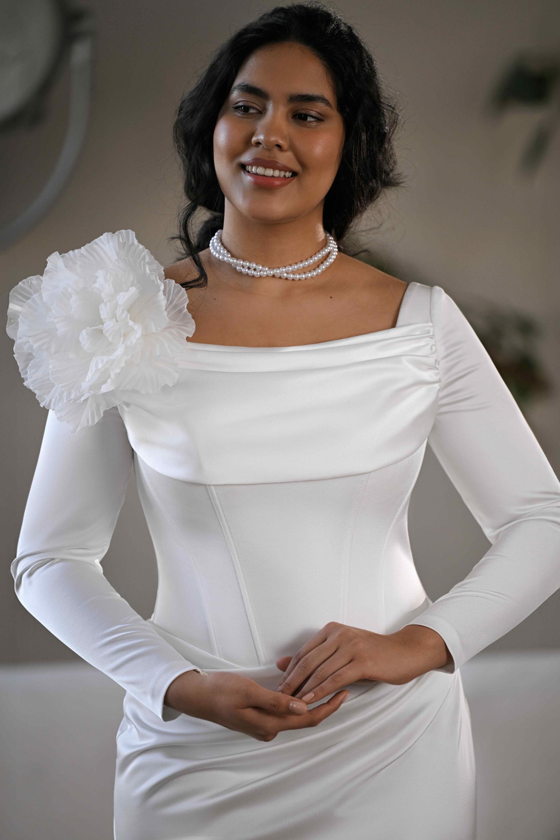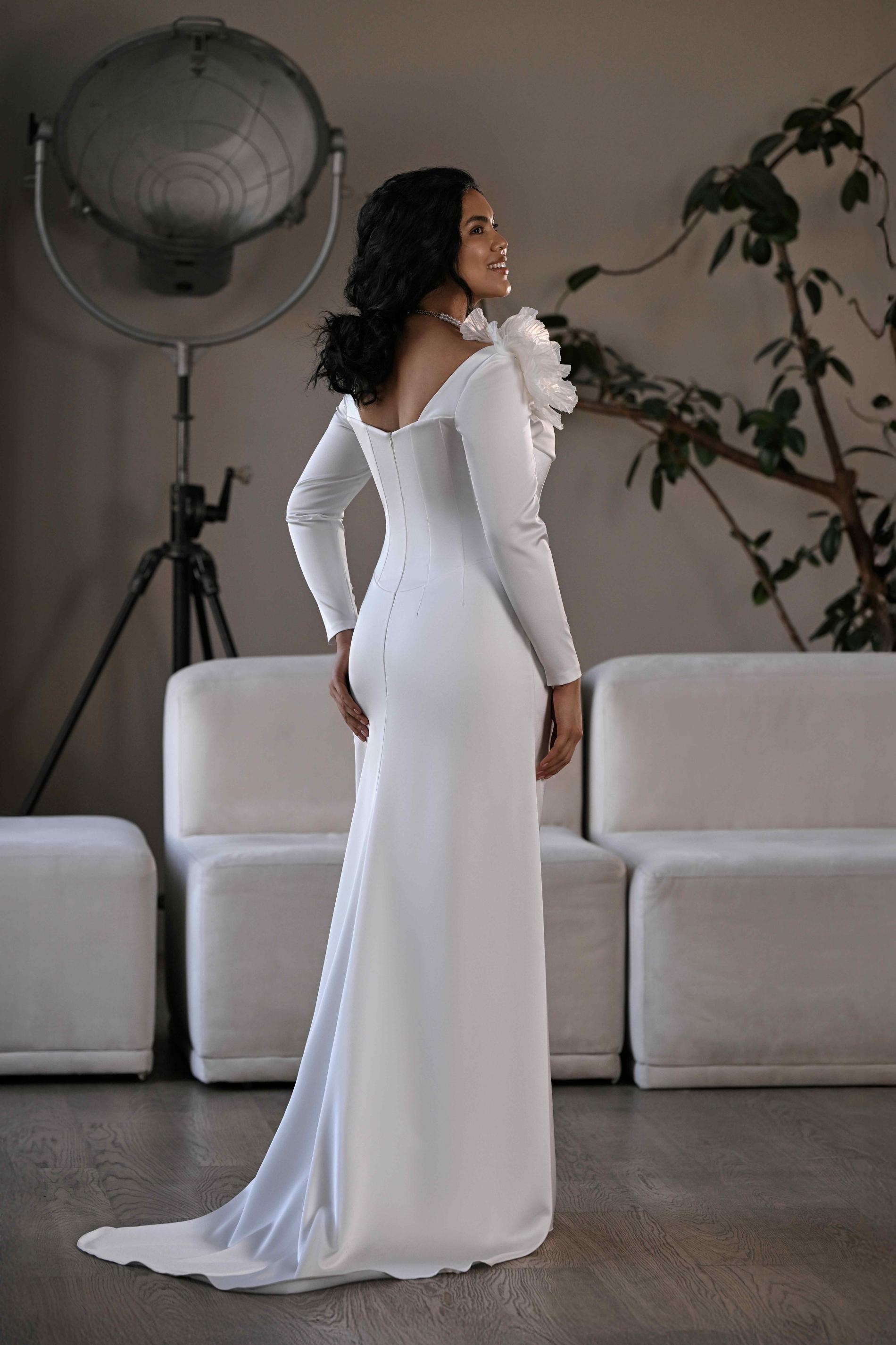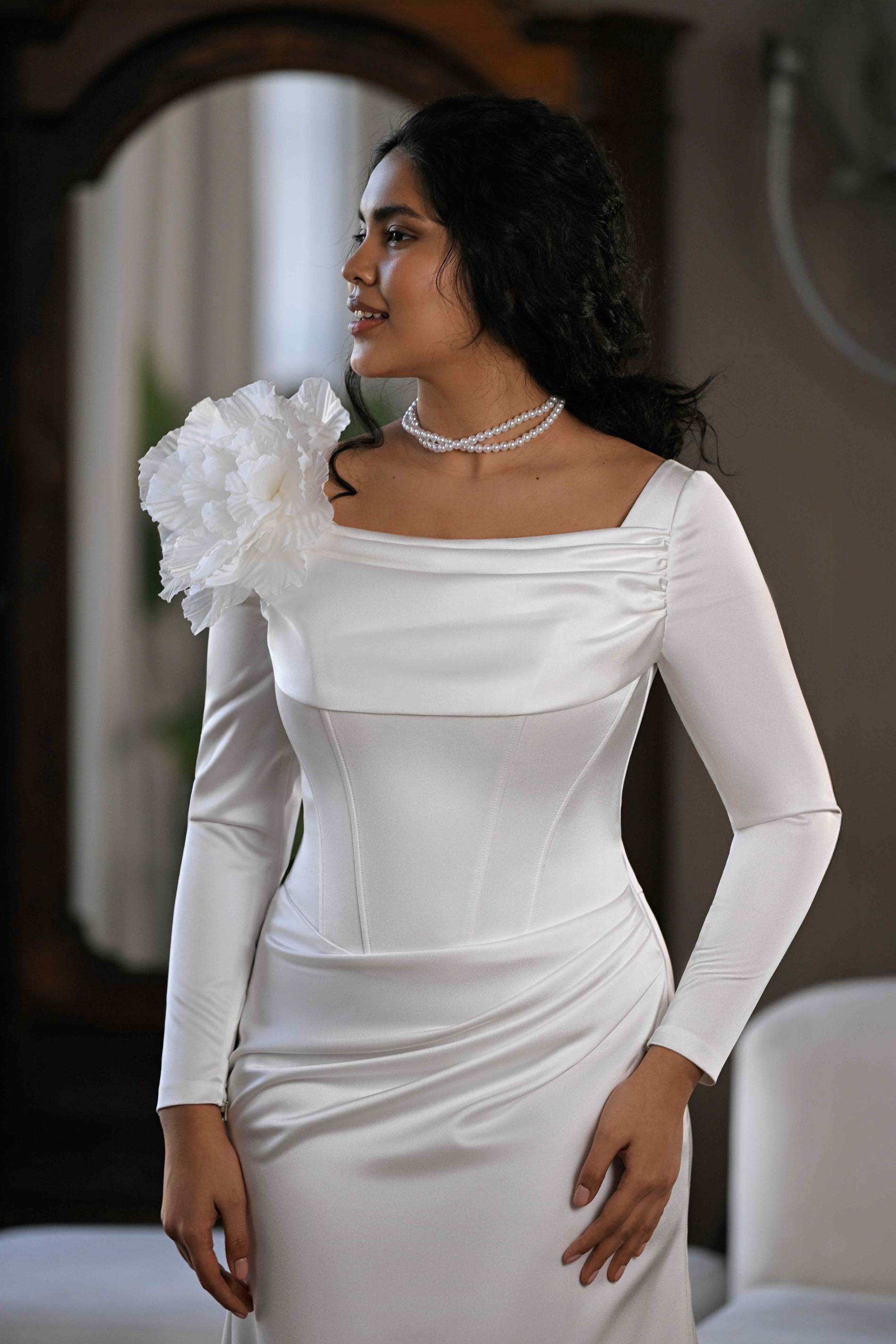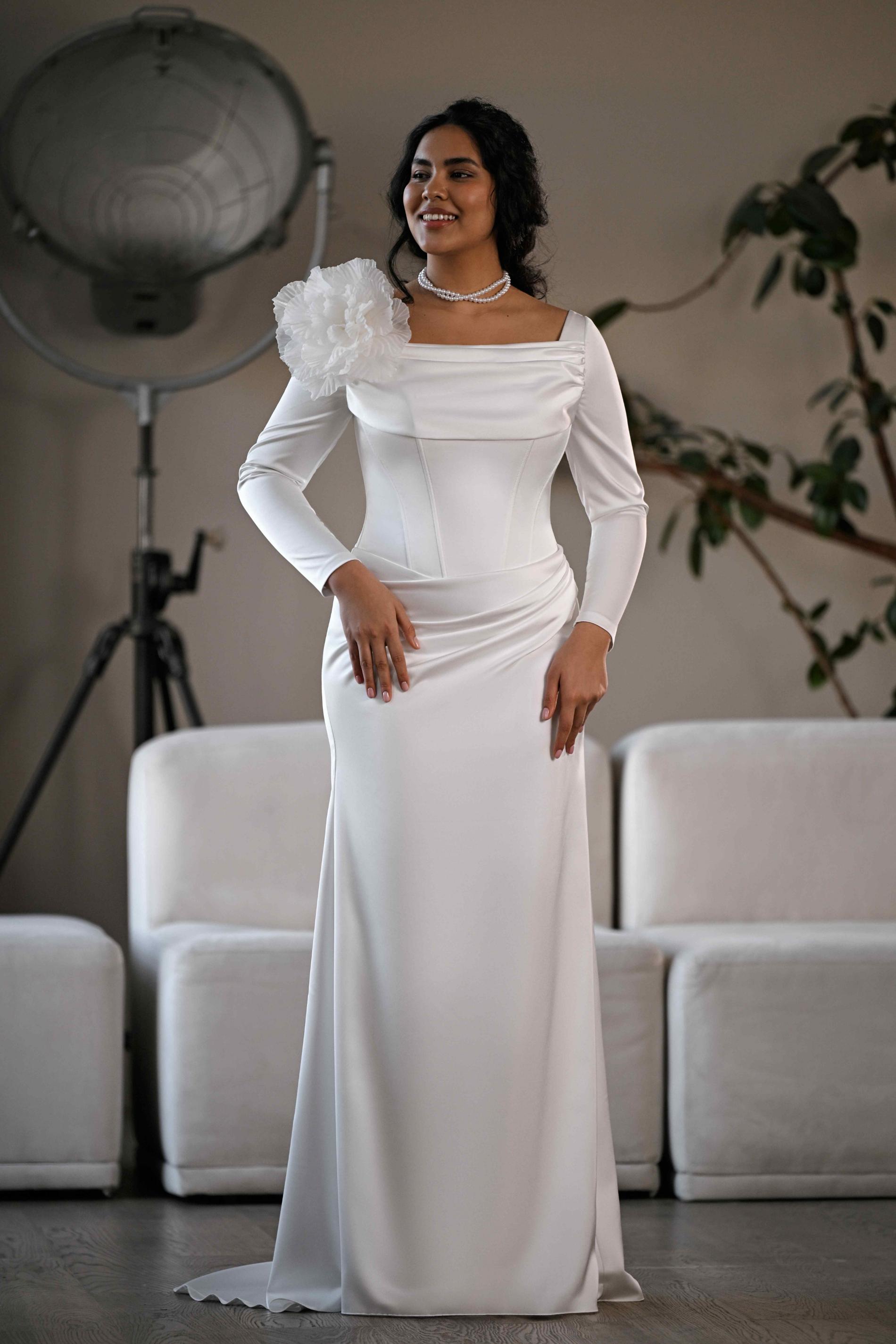 Свадебное платье прямого силуэта с длинными рукавами из гладкой ткани. Лиф с квадратным вырезом украшен крупным объемным цветком на одном плече. Приталенный фасон подчеркивает фигуру, а драпировка на бедрах добавляет легкую асимметрию и элегантность.