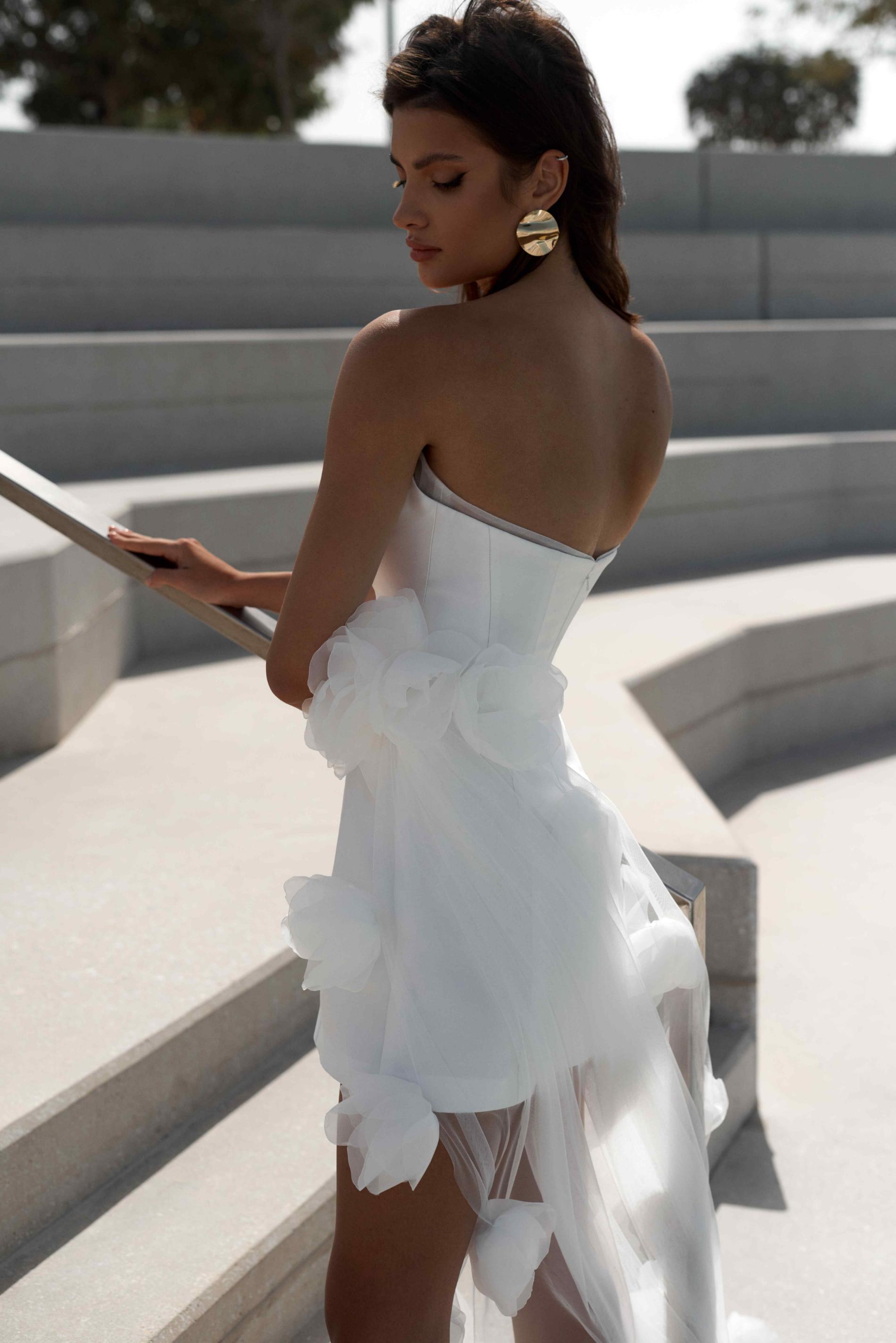 Свадебное короткое платье мини с открытыми плечами выполнено из плотной ткани и украшено ажурным цветком сбоку. Силуэт делает акцент на хрупкости и легкости