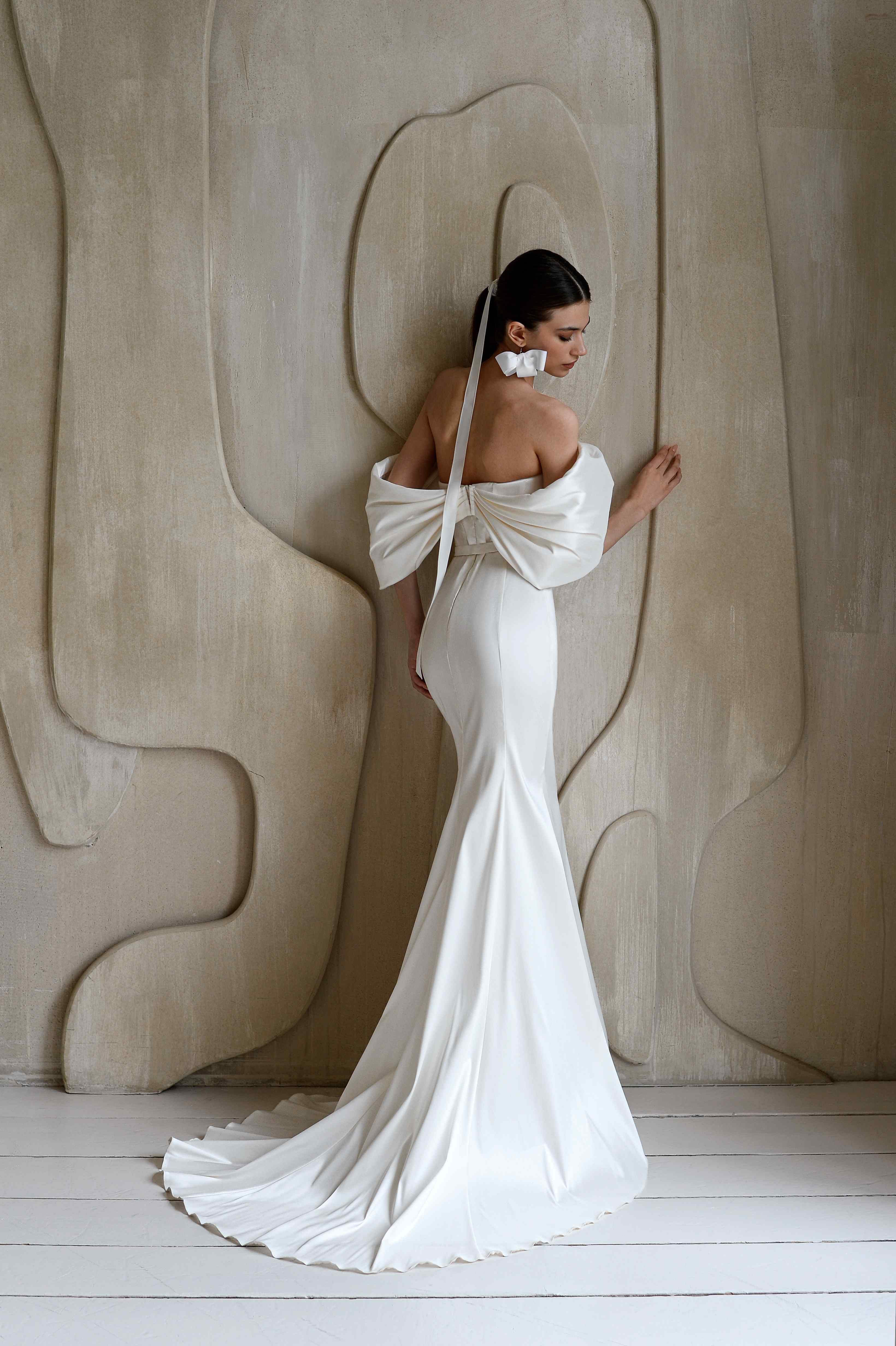 Свадебное платье силуэта «рыбка» с открытыми плечами. Лиф-бюстье с фигурным вырезом и крупными объемными рукавами-буфами создаёт праздничный и элегантный акцент. Матовая плотная ткань красиво формирует силуэт, а лаконичный крой и длина в пол делают образ строго стильным и современным.