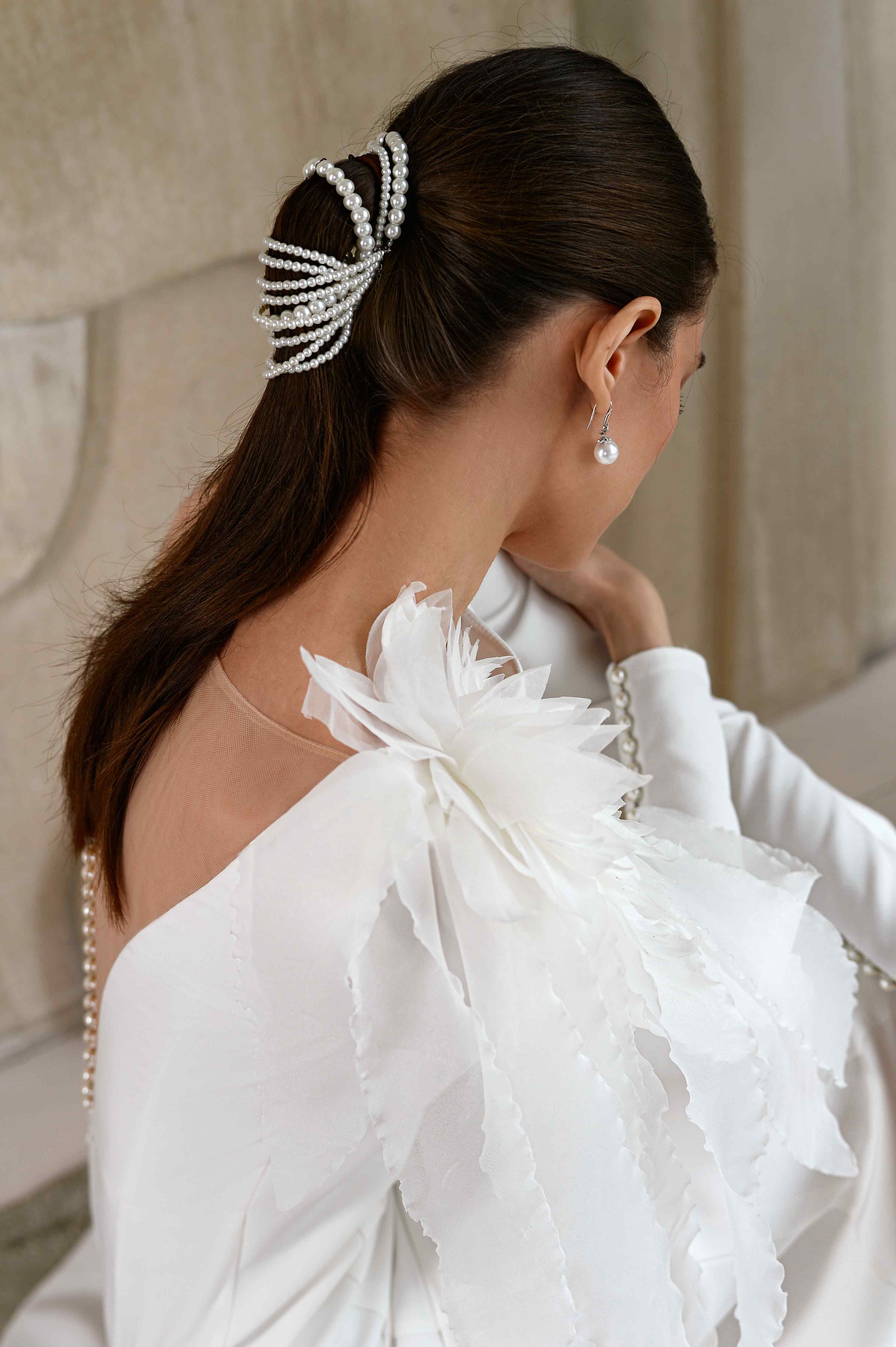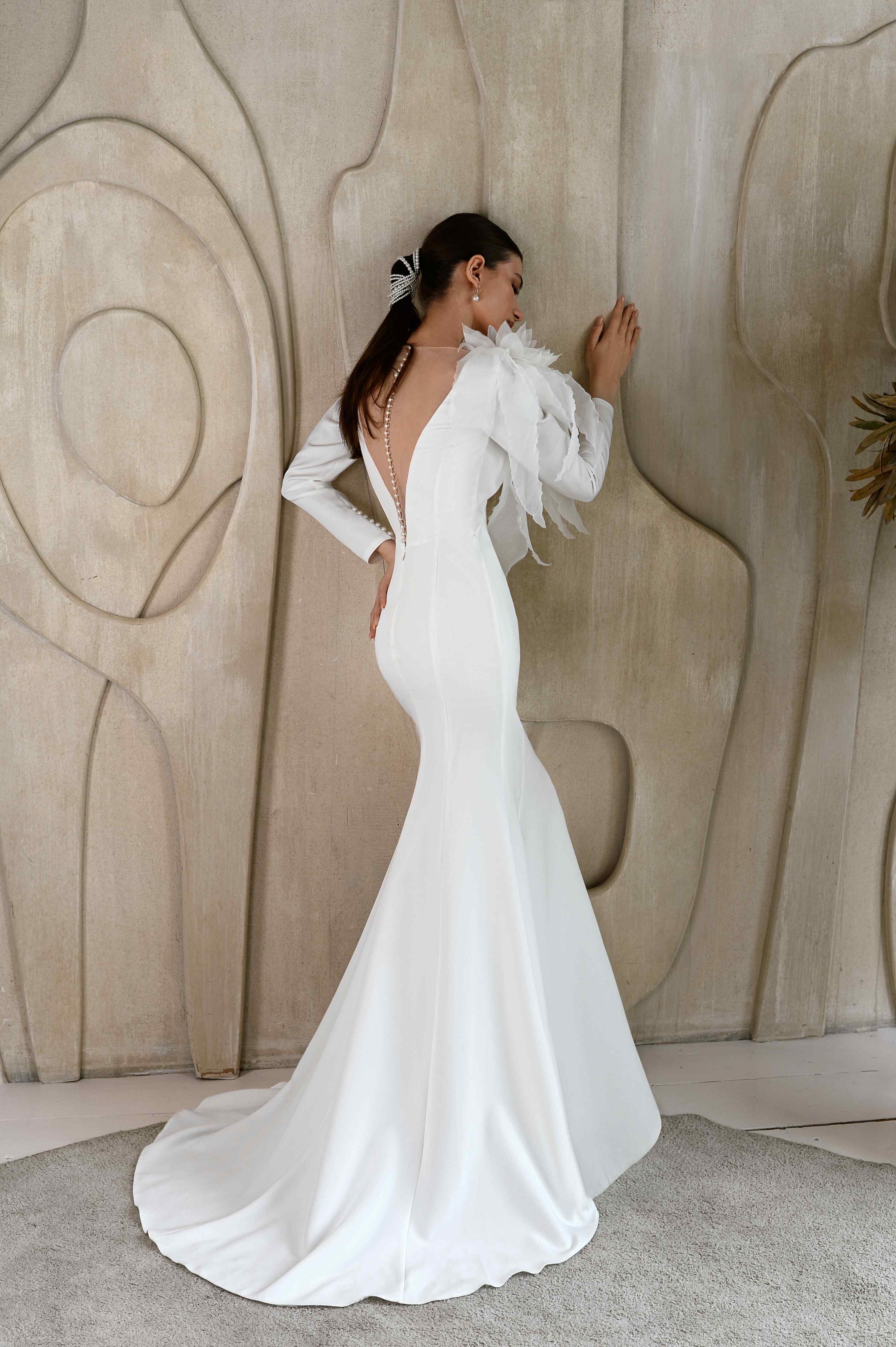 Утончённое свадебное платье «русалка» с длинными рукавами. Оно выполнено из плотной белой ткани, повторяющей изгибы фигуры, и имеет закрытый верх с округлым вырезом. Крупная объемная аппликация с цветком и многослойной прозрачной драпировкой украшает одно плечо, создавая запоминающийся акцент и добавляя наряду особого шарма.