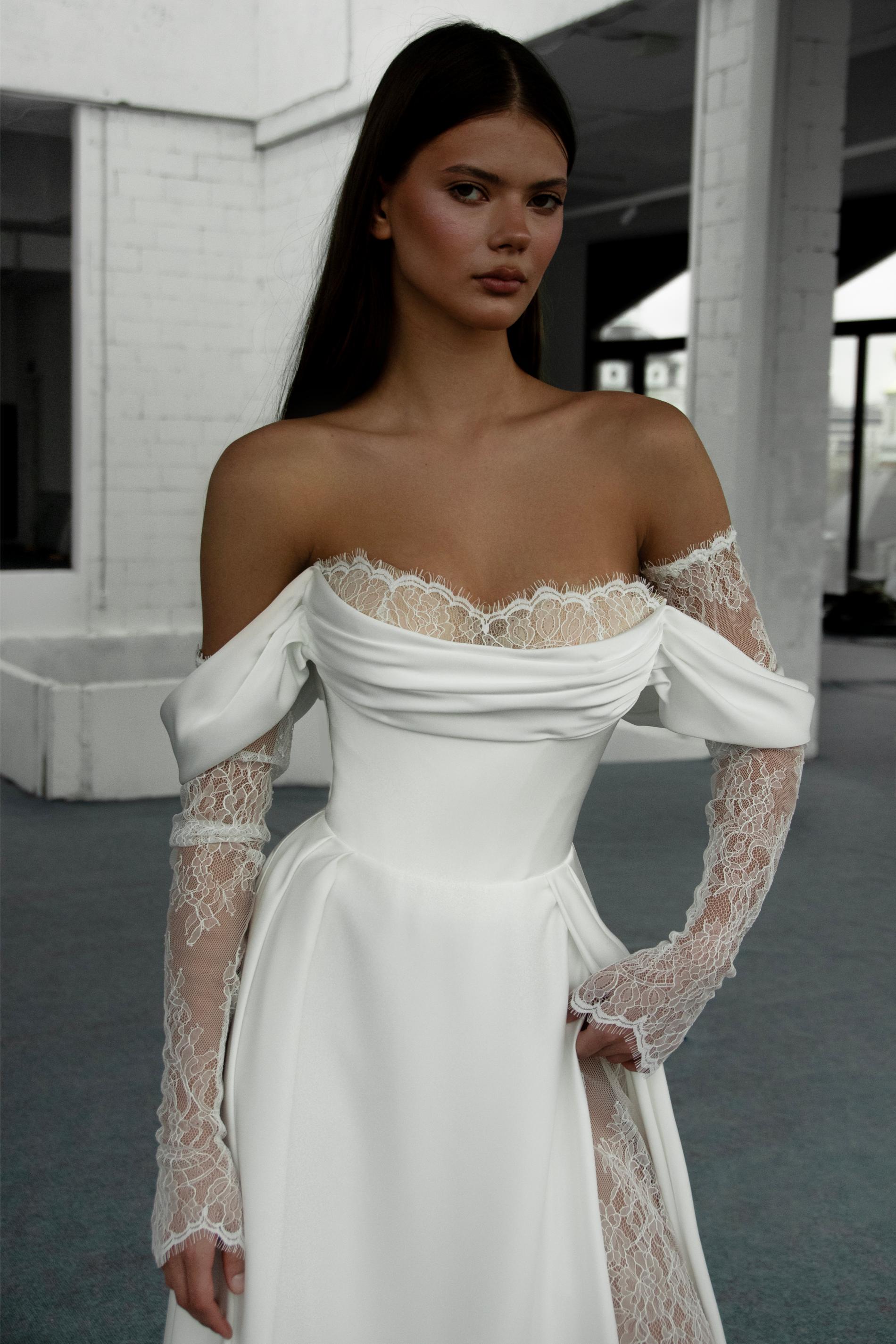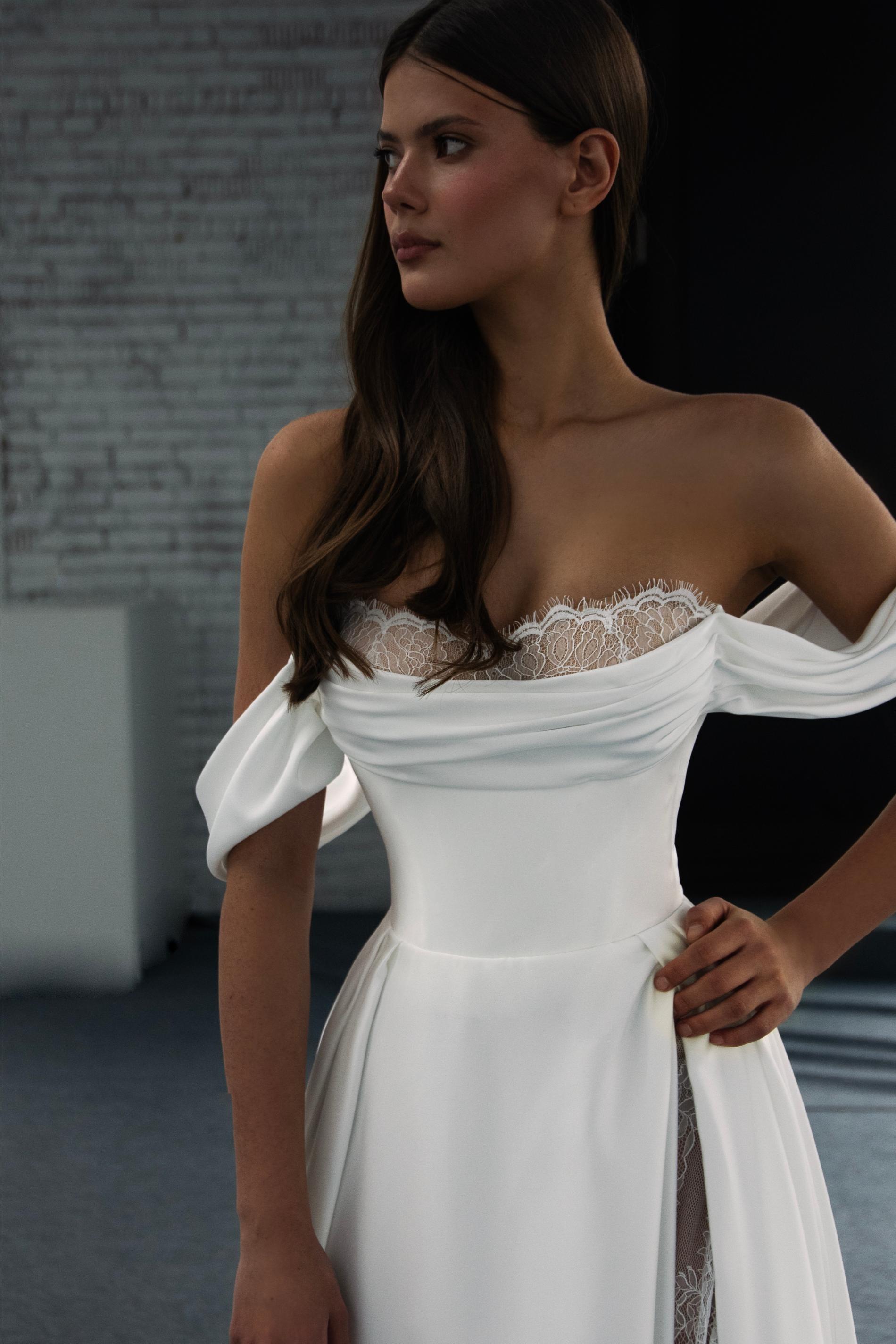 Свадебное платье выполнено из гладкой белой ткани с акцентом на крое и текстуре. Верх оформлен спущенными с плеч драпированными рукавами и открытым декольте, создающим романтичный силуэт. Юбка дополнена полупрозрачной кружевной вставкой по ноге, которая зрительно облегчает образ и придает изысканный акцент. Лаконичный фасон сочетает классику и современность, а легкий шлейф завершает нежный и элегантный образ.