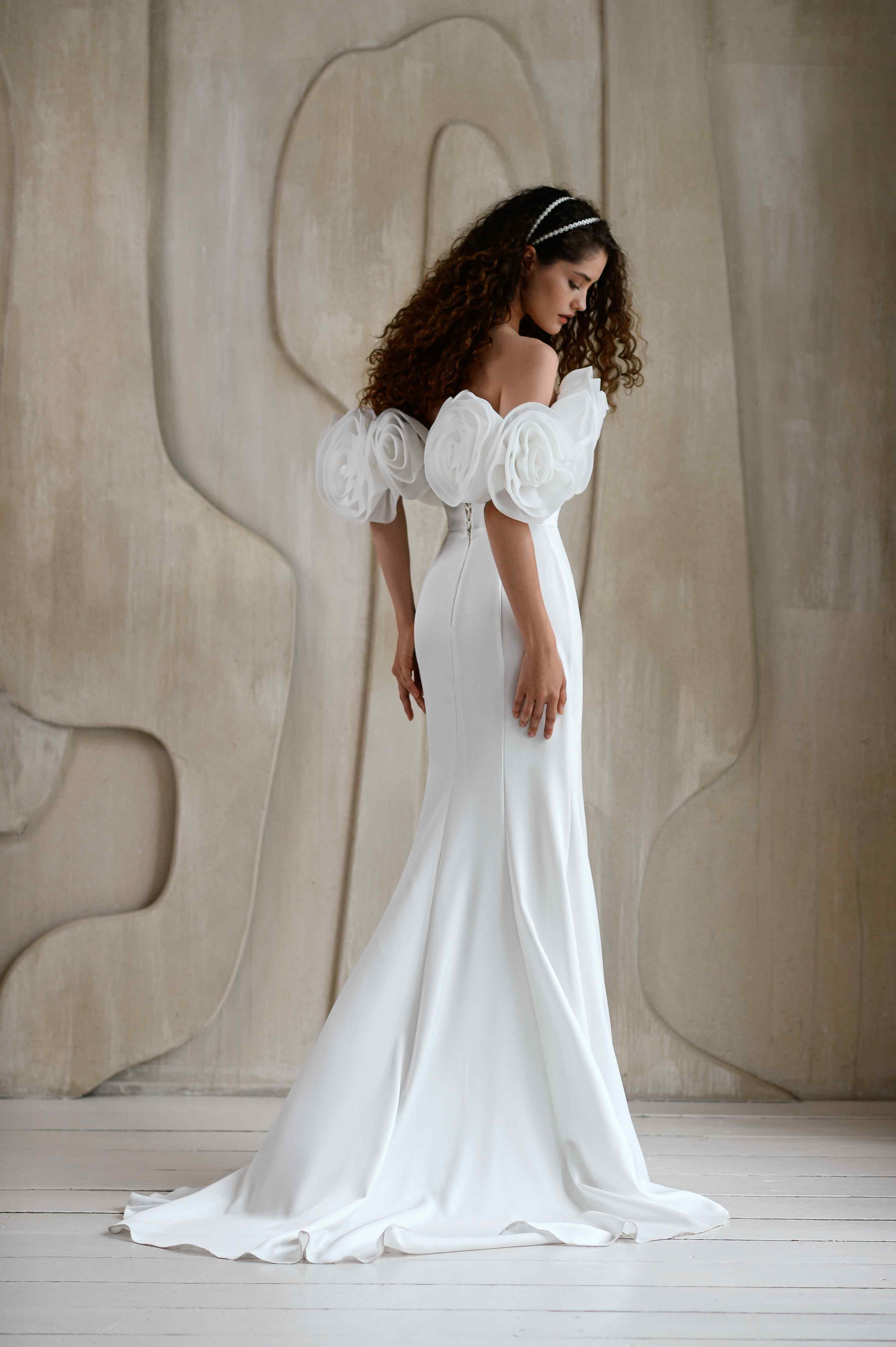 Свадебное платье приталенного силуэта с открытыми плечами. Лиф выполнен с вырезом по типу корсет-бандо, основные акценты — крупные объемные цветы из ткани на линии плеч, формирующие эффектные воздушные рукава. Юбка спадает пластично, длина в пол с небольшим шлейфом. Стиль — женственный, выразительный, идеально для утончённой и стильной невесты.