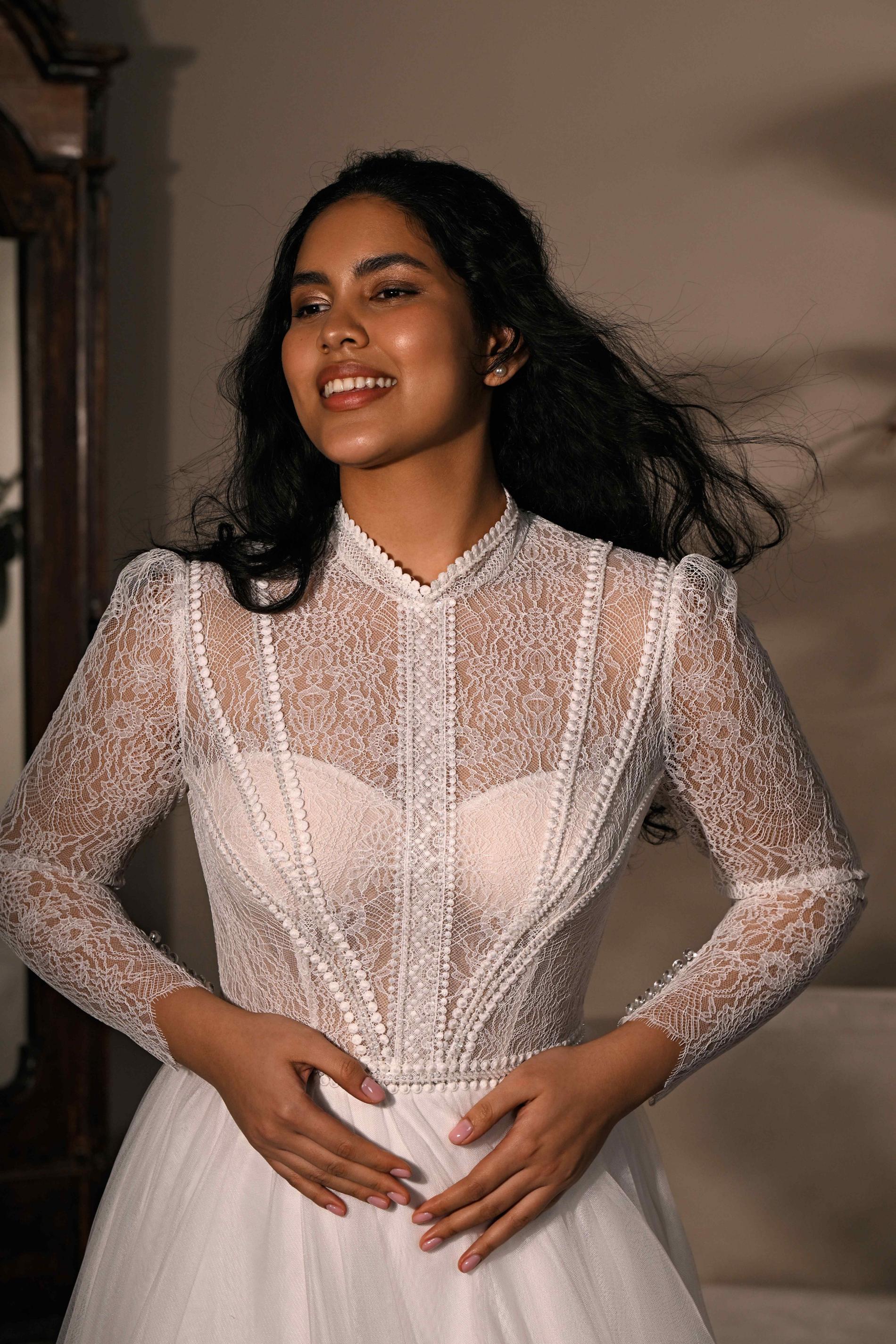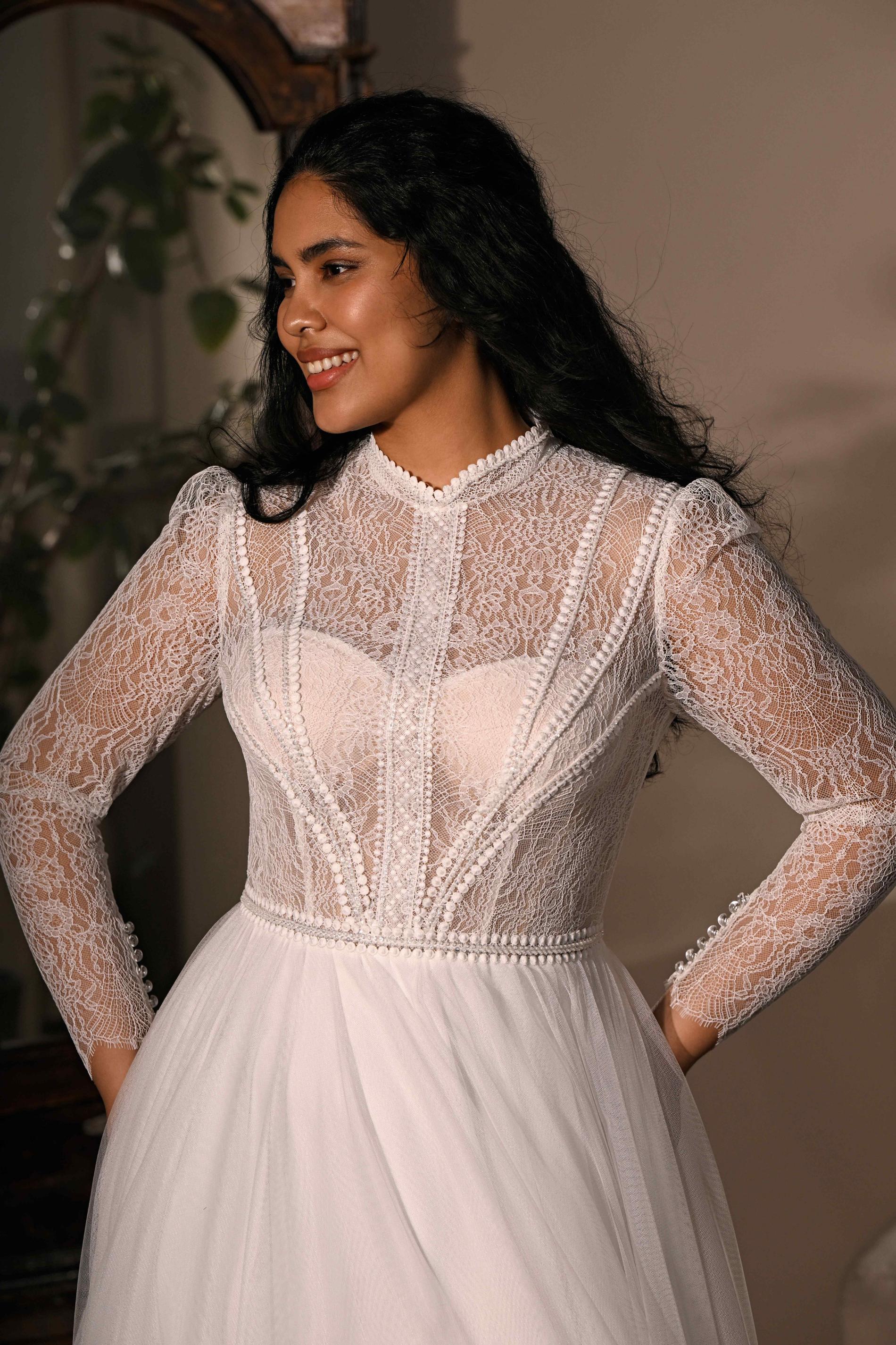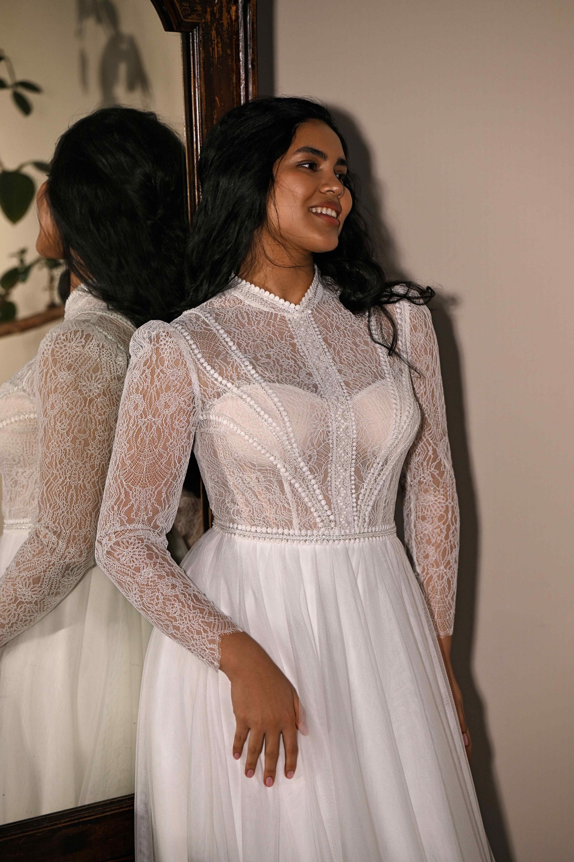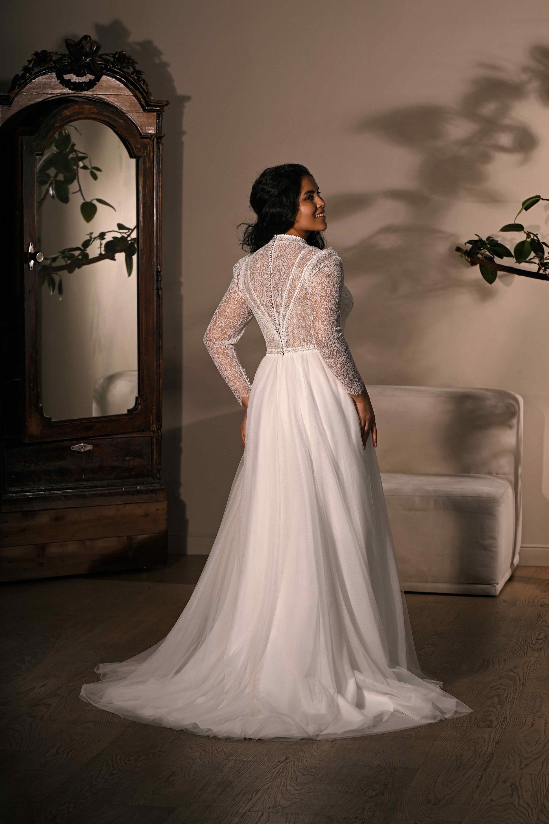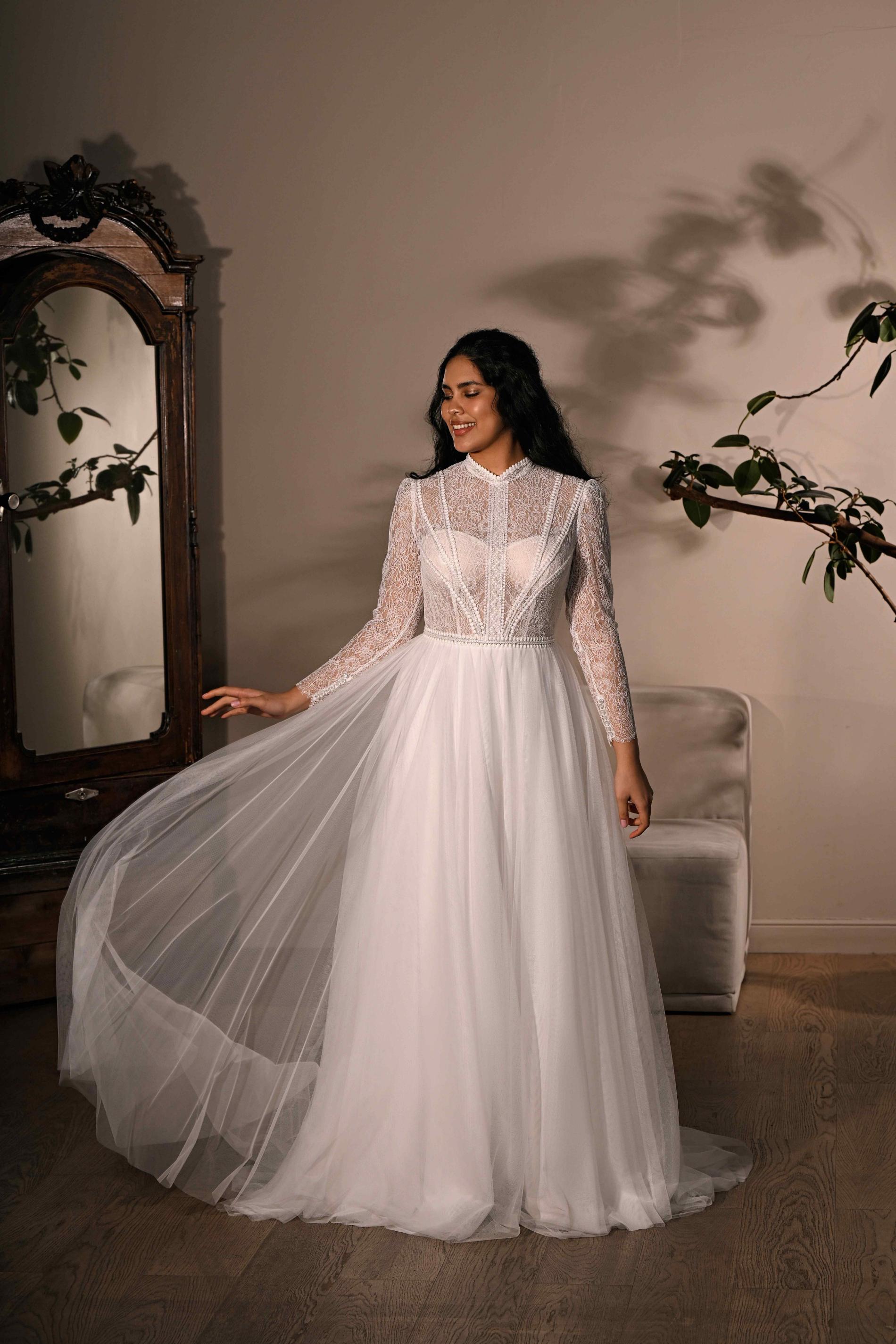 Свадебное платье А-силуэта с длинными прозрачными кружевными рукавами. Верх выполнен из ажурного кружева с фактурными деталями и высоким воротником, а легкая струящаяся юбка из фатина создает воздушность, гармонично завершая нежный образ.