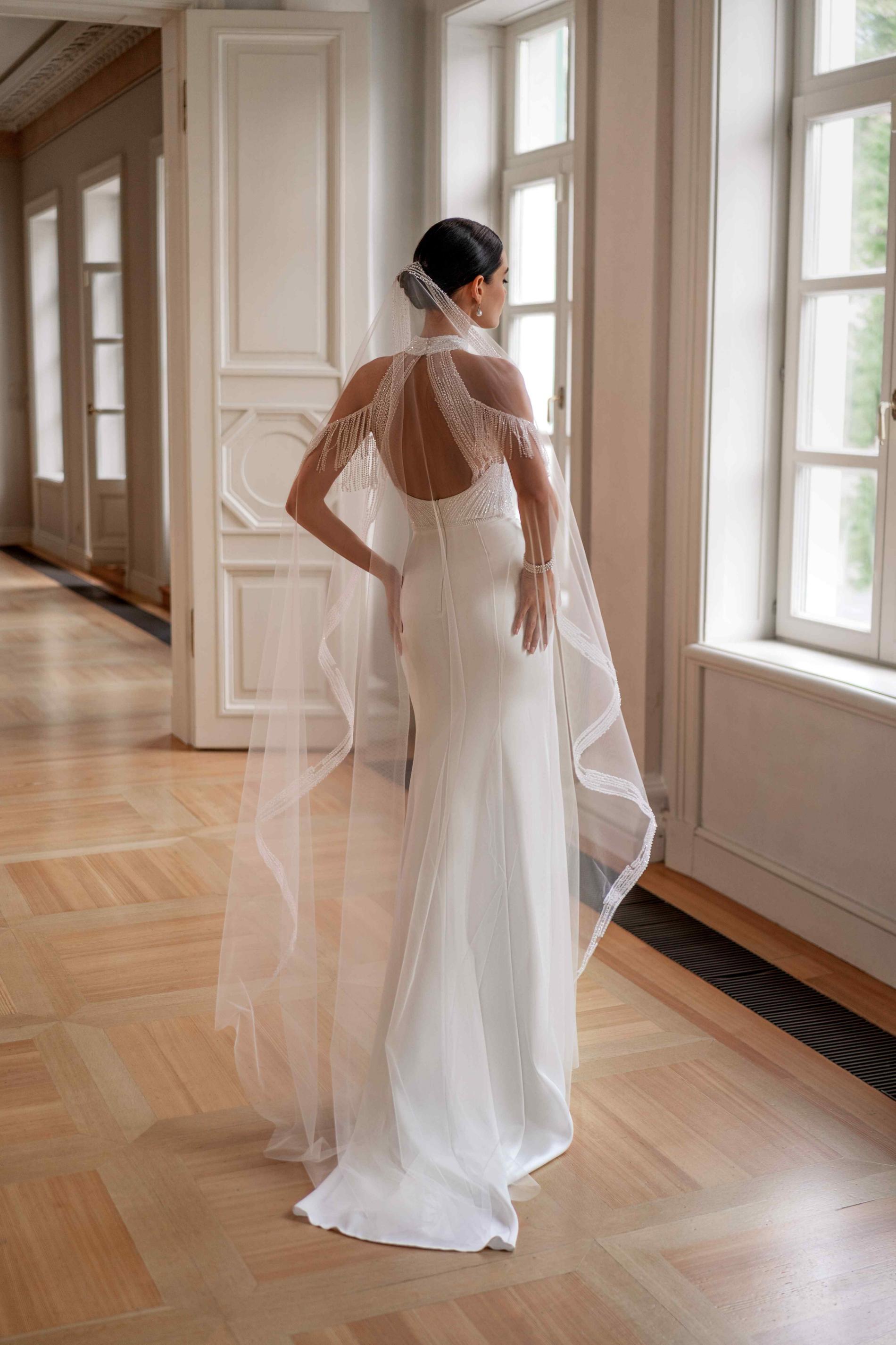 Свадебное платье прямого силуэта с высоким воротом, украшенное деликатной вышивкой бисером и фактурным верхом. Плечи открыты, а от воротника идут прозрачные шлейфы, создающие эффект легкого накидки. Лаконичный дизайн подчеркивает элегантность и утонченность