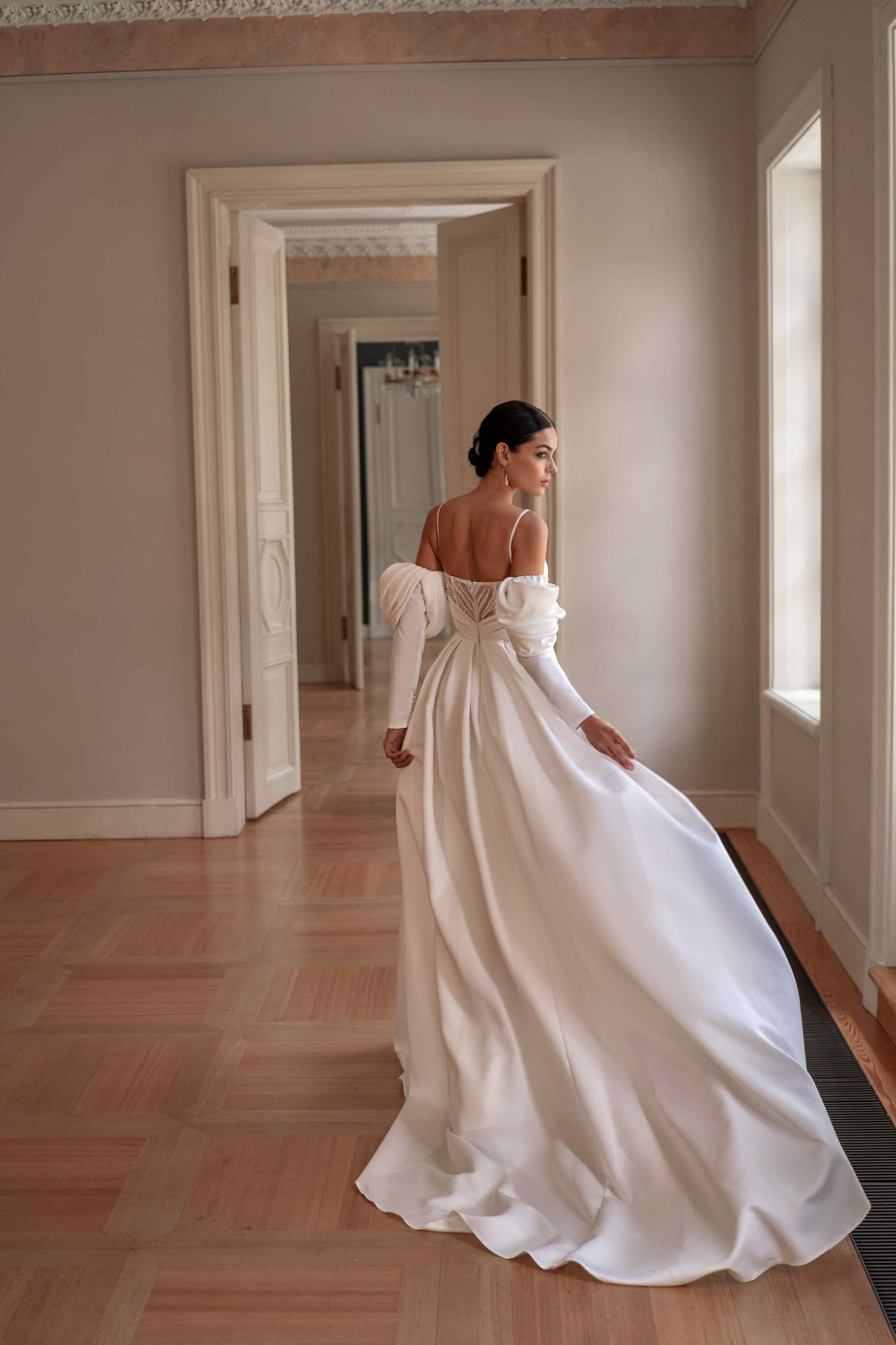 Свадебное платье с прямым лифом на тонких бретелях и объемными складками на рукавах. Юбка с высокой талией и эффектным разрезом визуально удлиняет ноги, а мягкая ткань создает легкость движения.