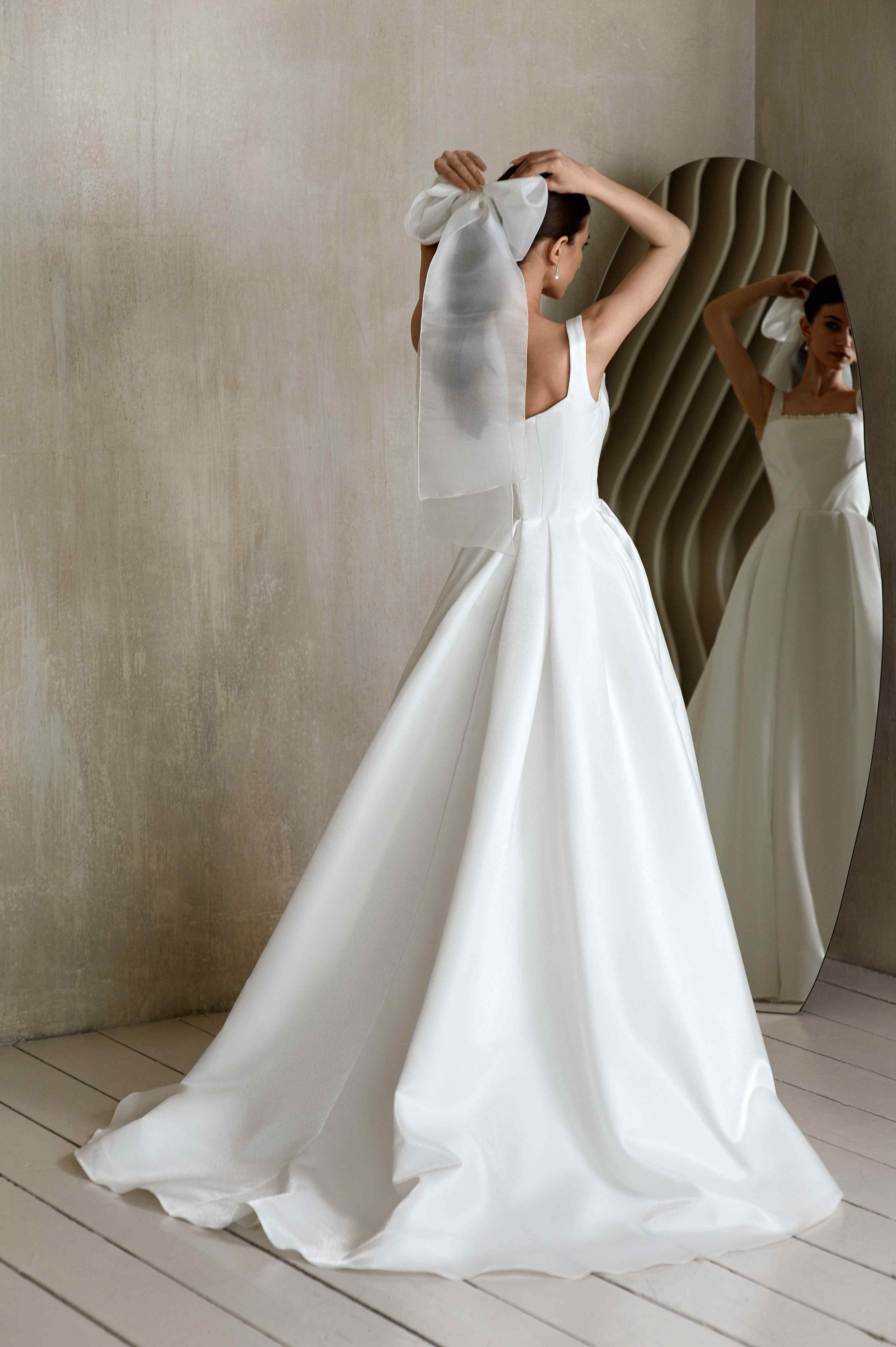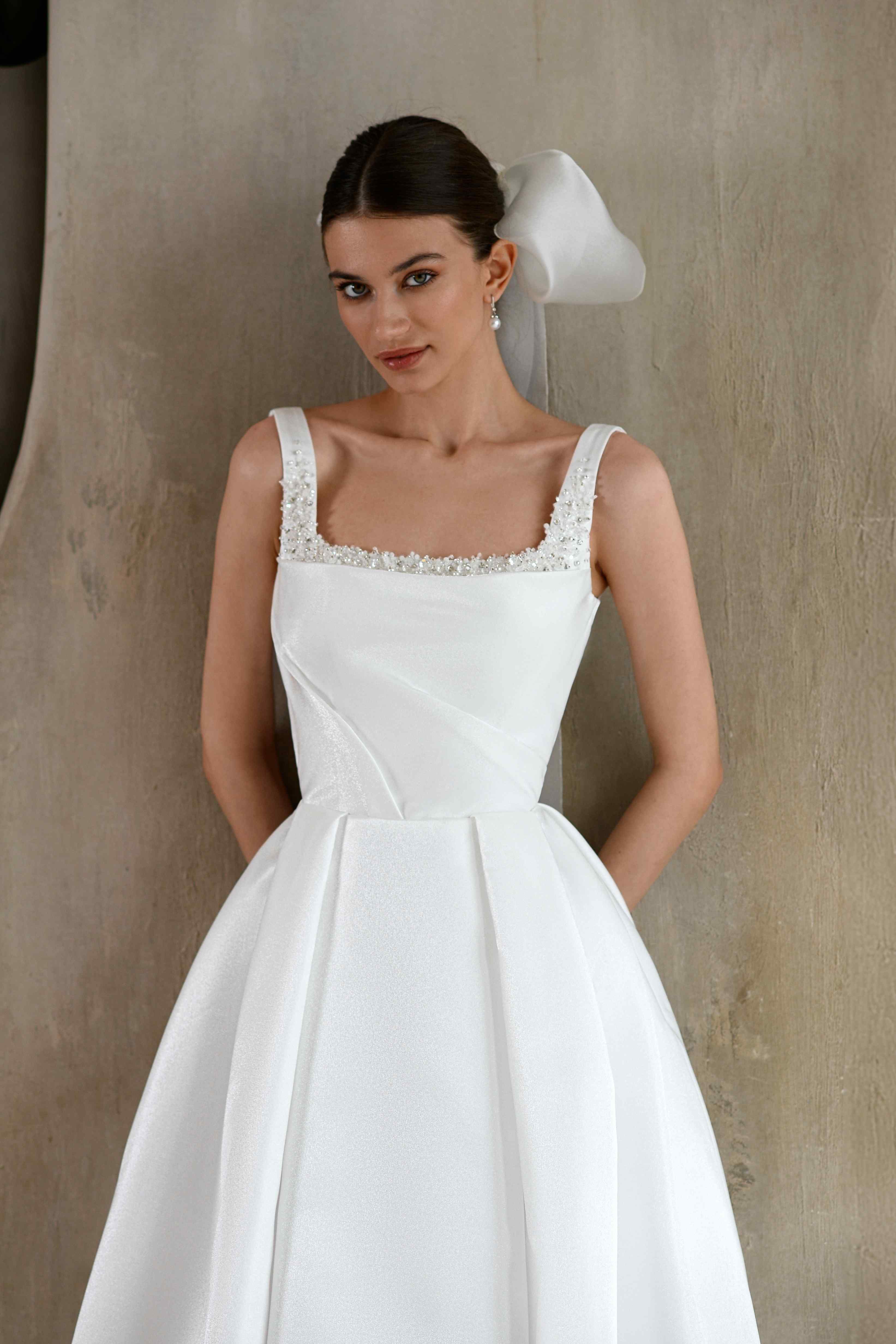 Свадебное платье классического А-силуэта с широкой юбкой и открытыми плечами на широких бретелях. Верх украшен квадратным вырезом и декором по линии горловины. Юбка многослойная, выполнена из плотной ткани с легким мерцанием, добавляя торжественности образу.