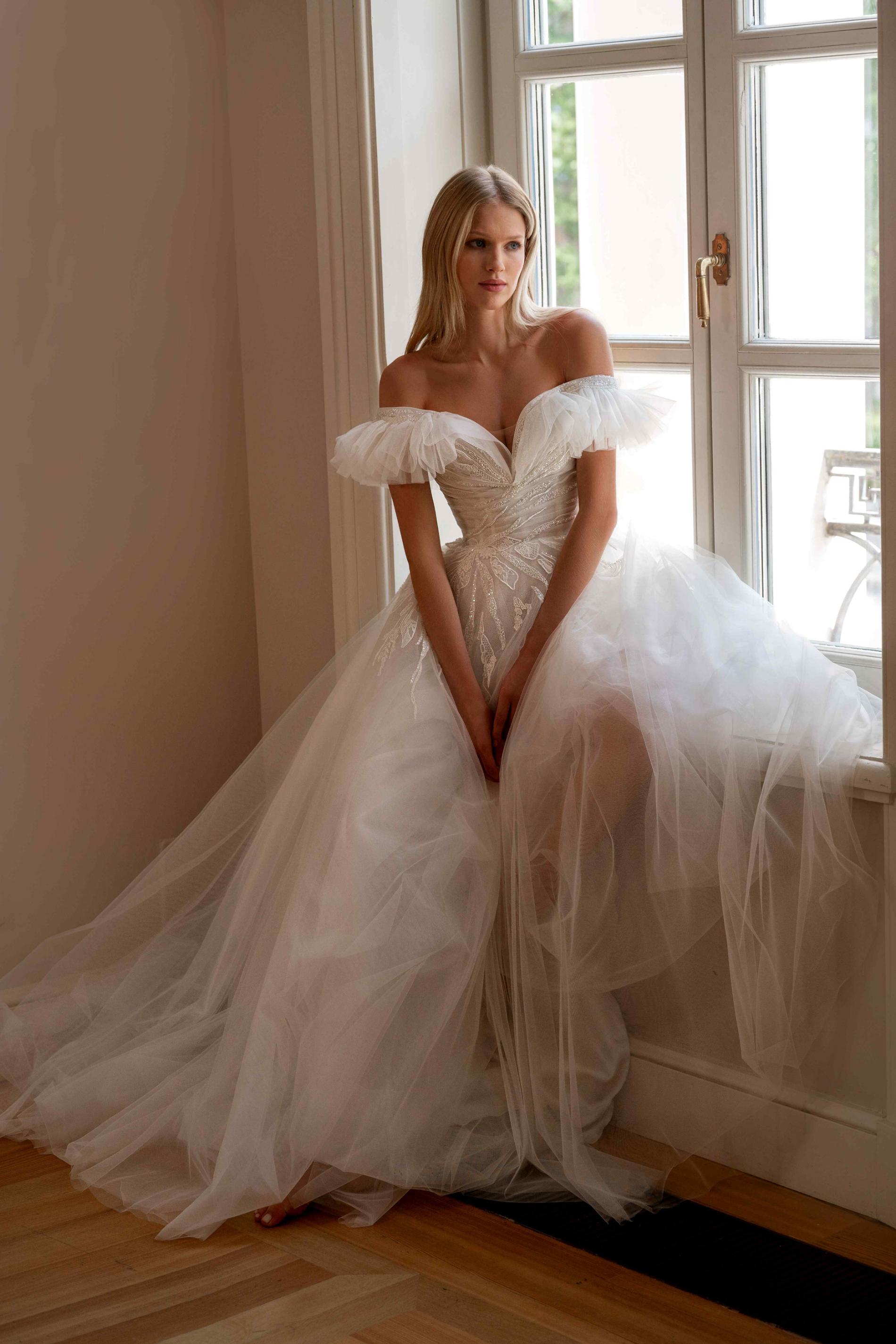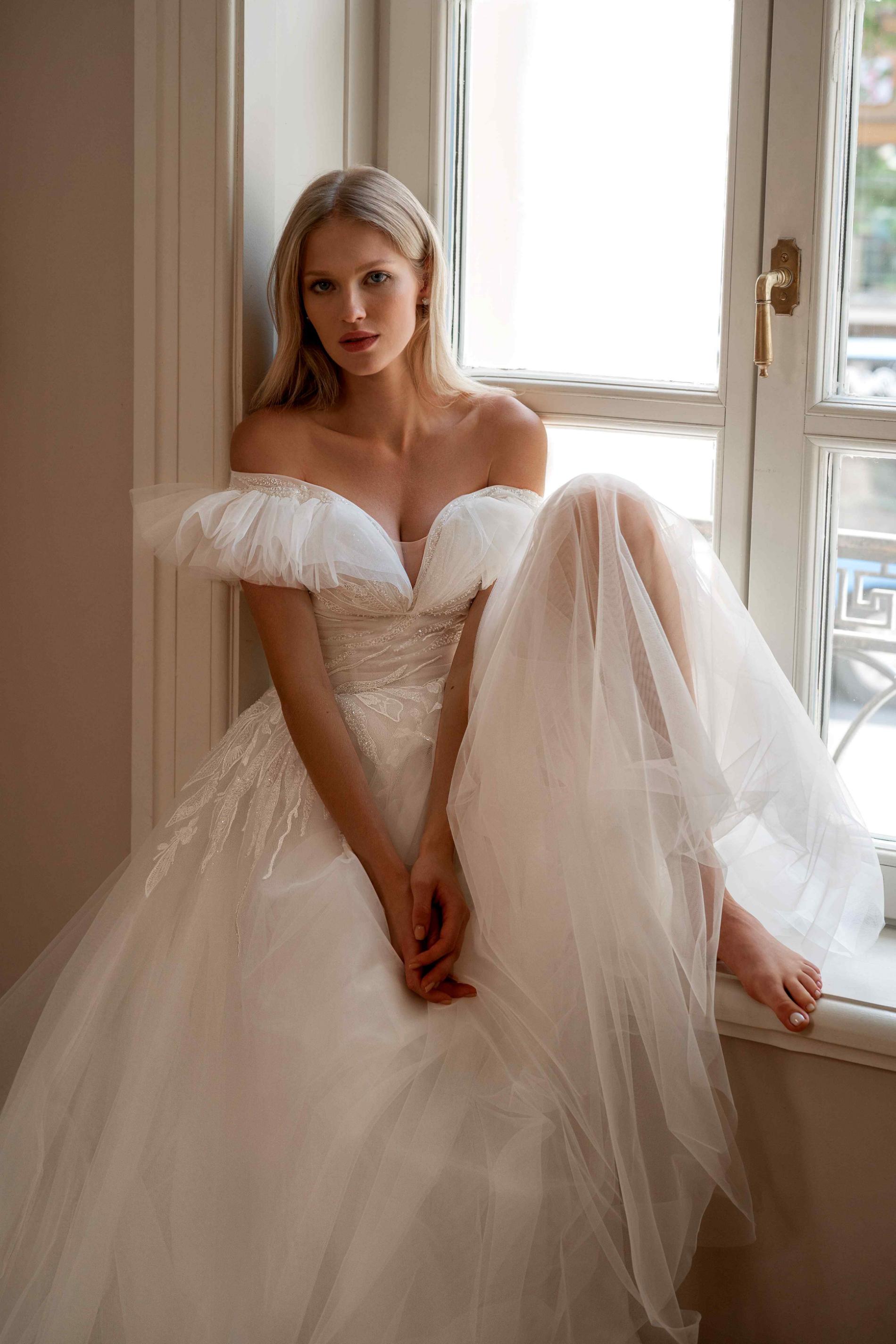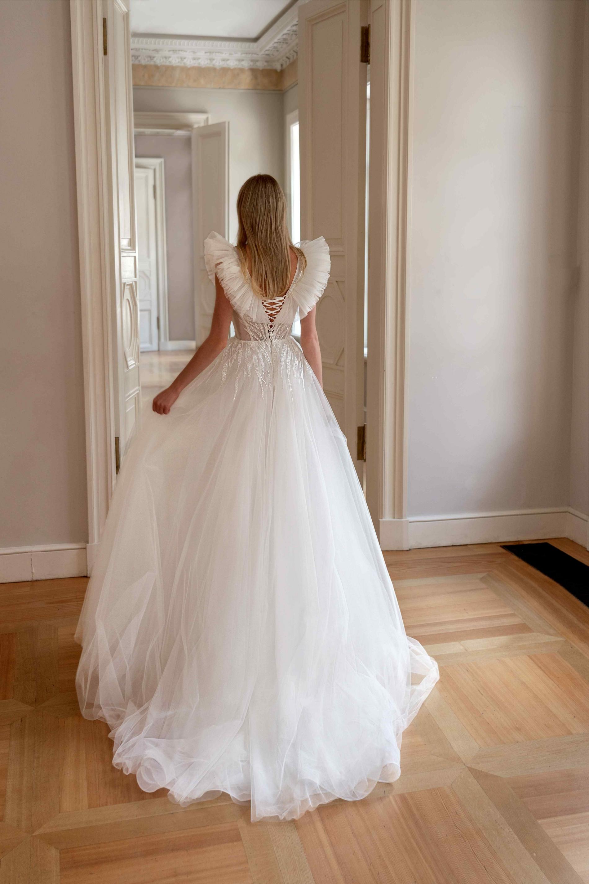 Воздушное свадебное платье А-силуэта с оригинальными объемными рукавами. Лиф украшен изящной вышивкой, а легкая полупрозрачная юбка красиво струится и формирует мягкий шлейф. Стильная деталь — рюши по плечам, добавляющие образу женственности и романтики.