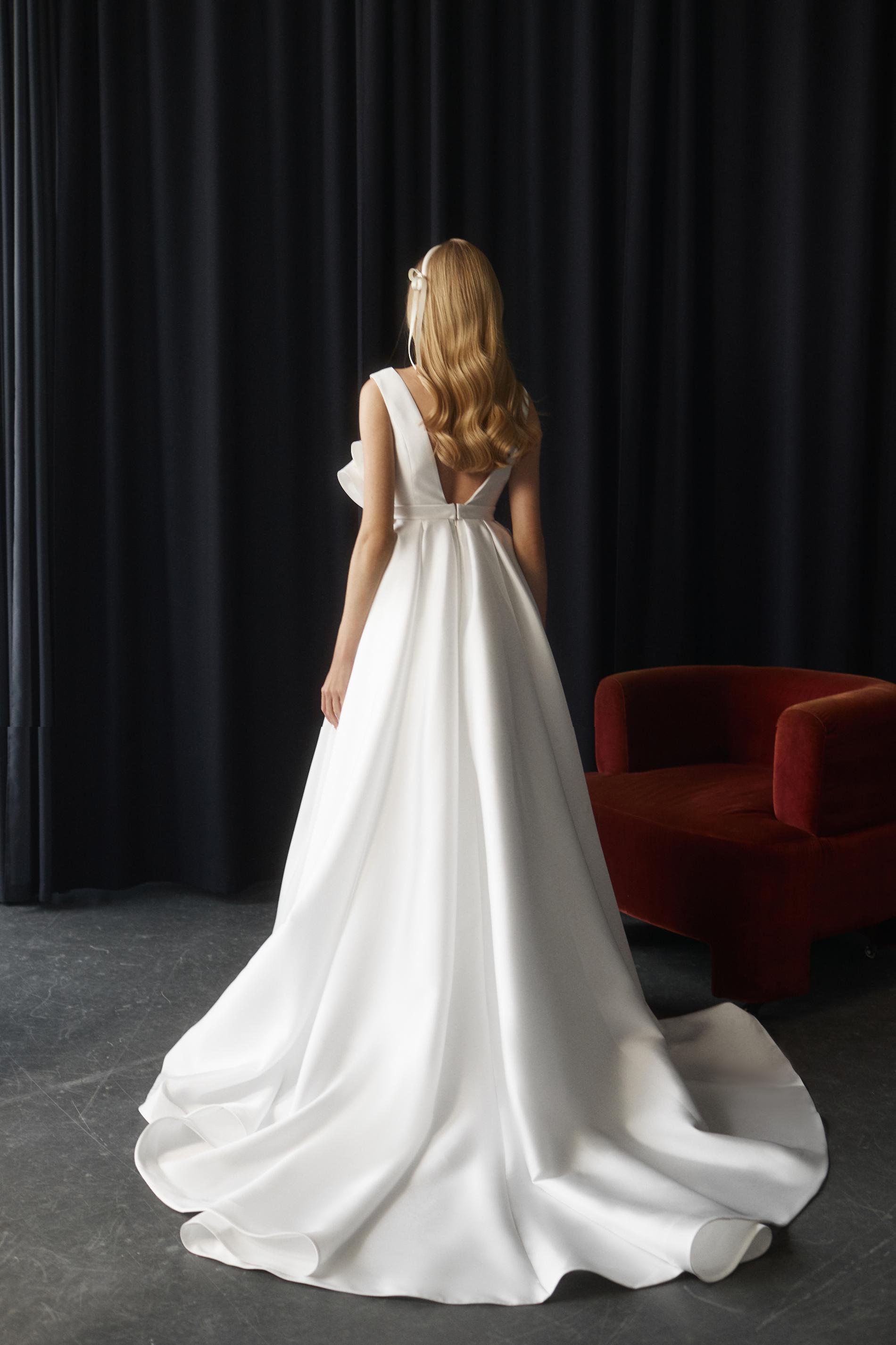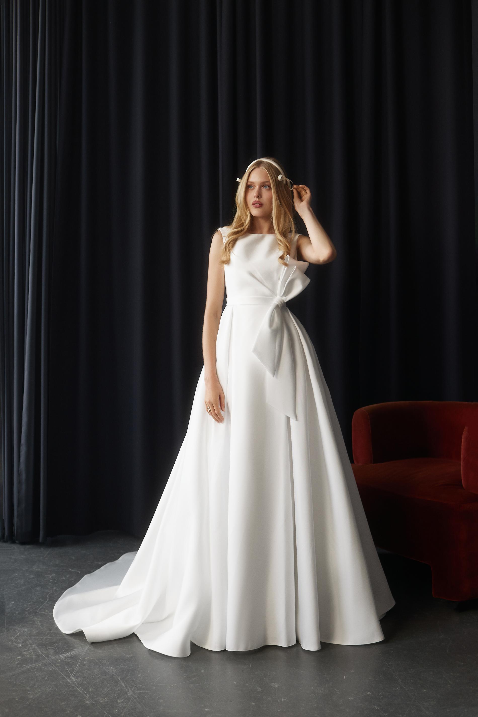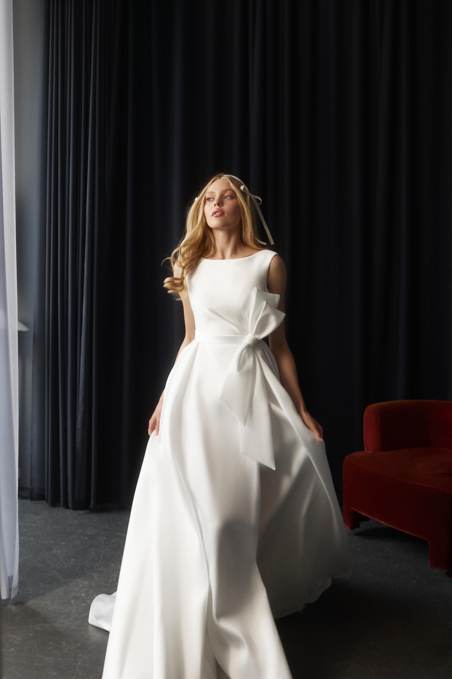 Свадебное платье выполнено из роскошной белой атласной ткани, которая создает гладкий и сияющий эффект. Модель имеет прямой верх без рукавов и акцентированную линию талии, украшенную крупным декоративным бантом сбоку. Юбка платья пышная и многослойная, дополнена глубоким высоким разрезом, открывающим ногу. Такой фасон сочетает классику с современными элементами и смотрится очень эффектно и элегантно.
