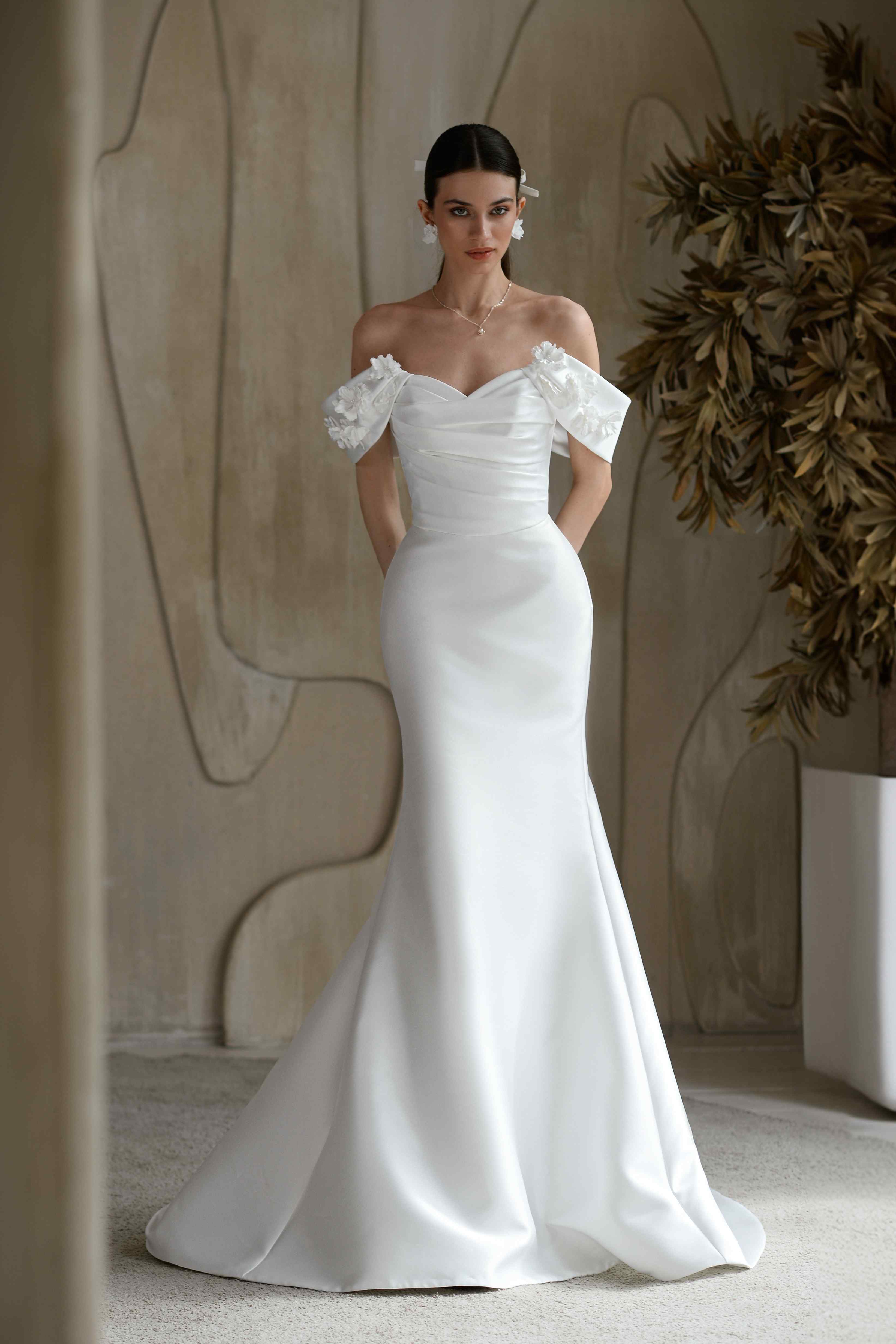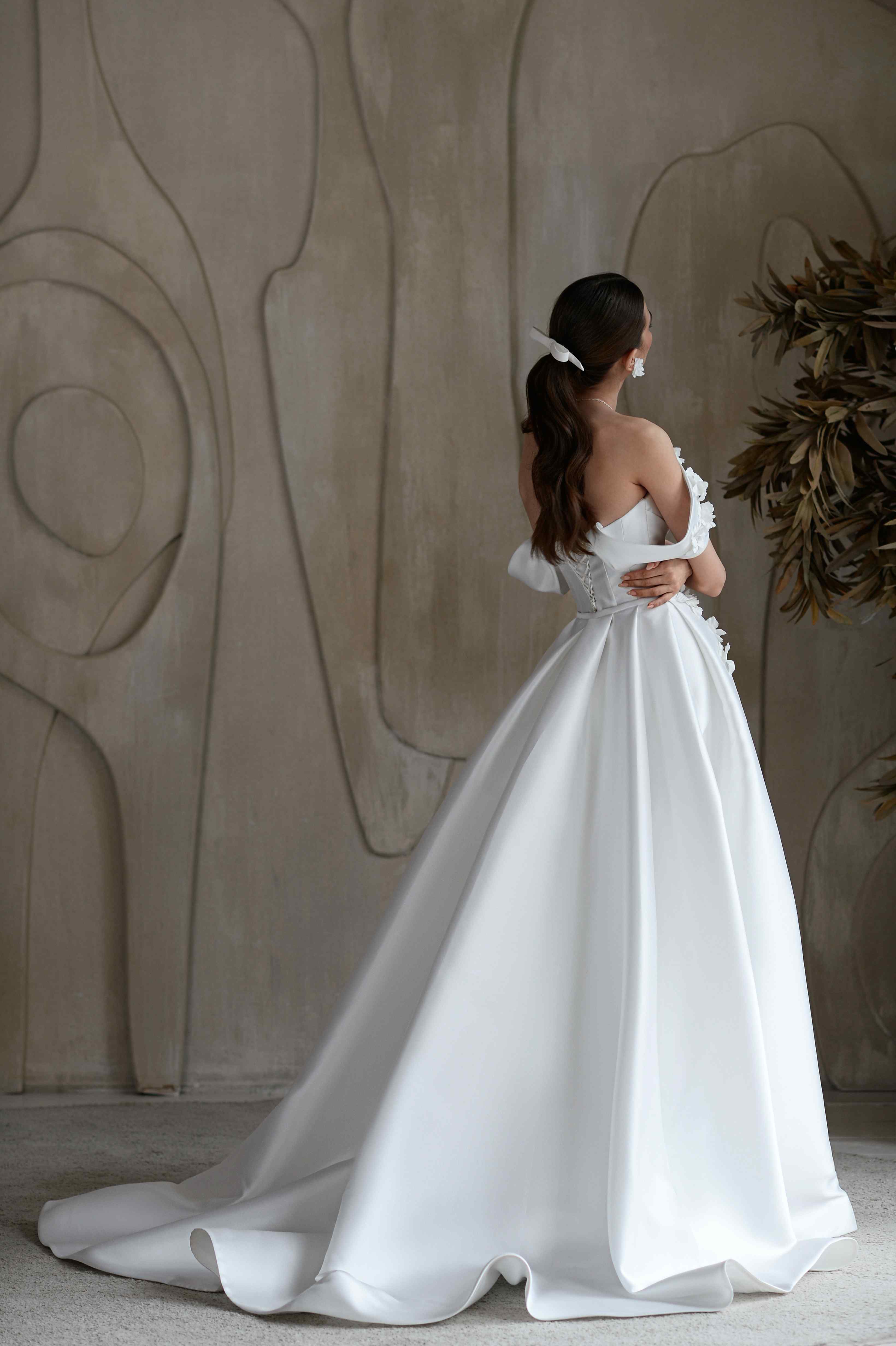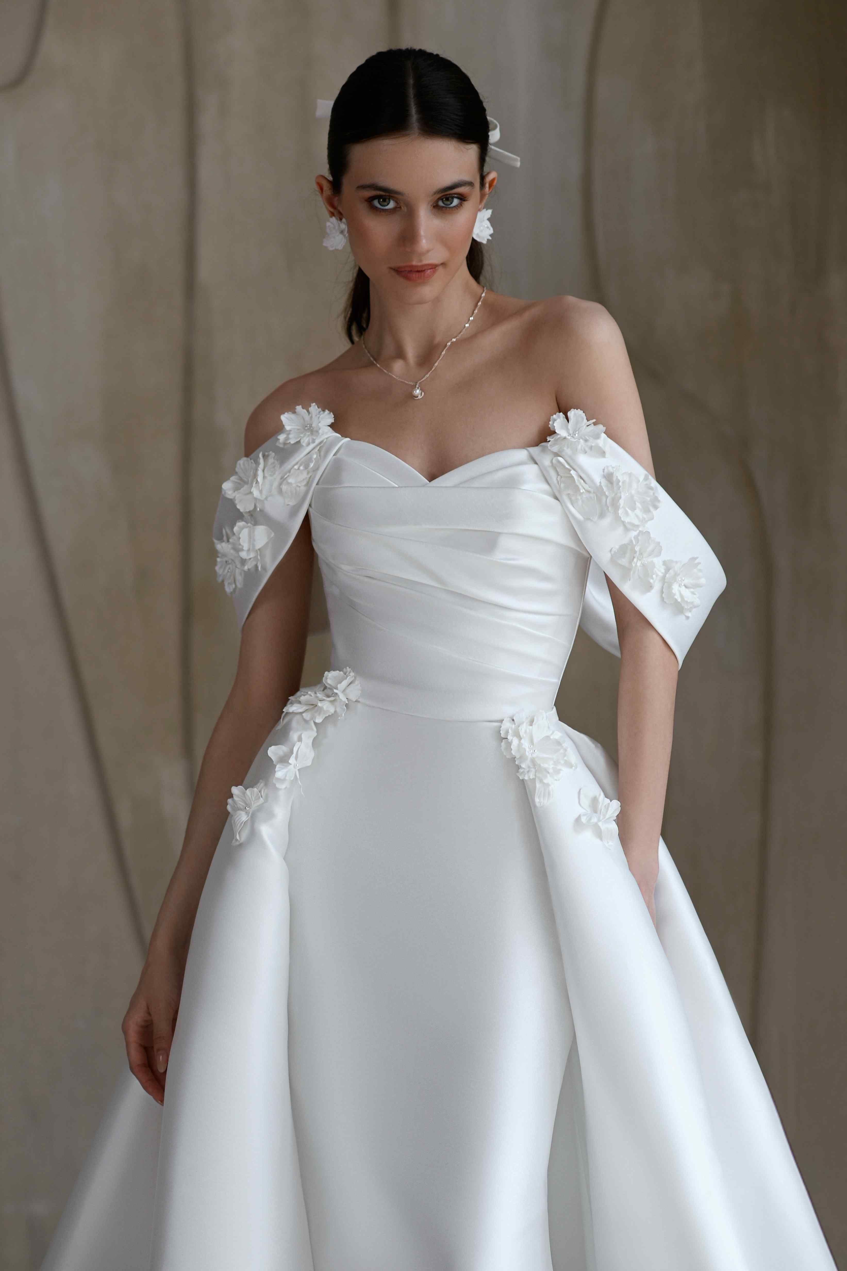 Свадебное платье классического силуэта с открытыми плечами. Верх платья драпирован в форме сердечка, а спущенные рукава оформлены объемной текстильной вышивкой в виде цветов. Платье выполнено из гладкой атласной ткани цвета слоновой кости, декор по талии и рукавам добавляет нежности, далее юбка струится легкими складками, образ выглядит по-королевски торжественно.