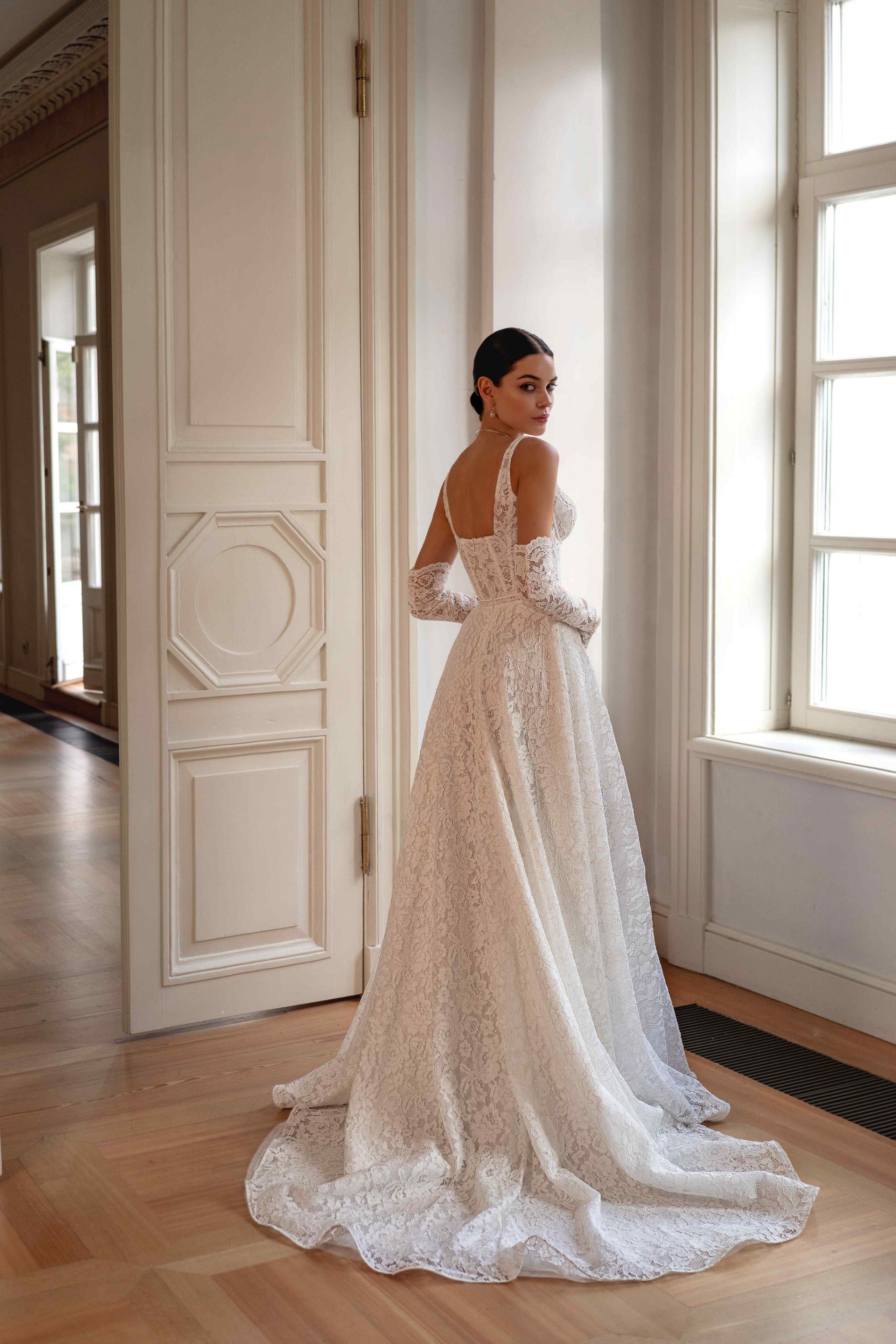 Свадебное платье с корсетным верхом и широкими бретелями, полностью выполнено из ажурного кружева. Лиф украшен прозрачными вставками и поддерживает форму, подчеркивая талию.