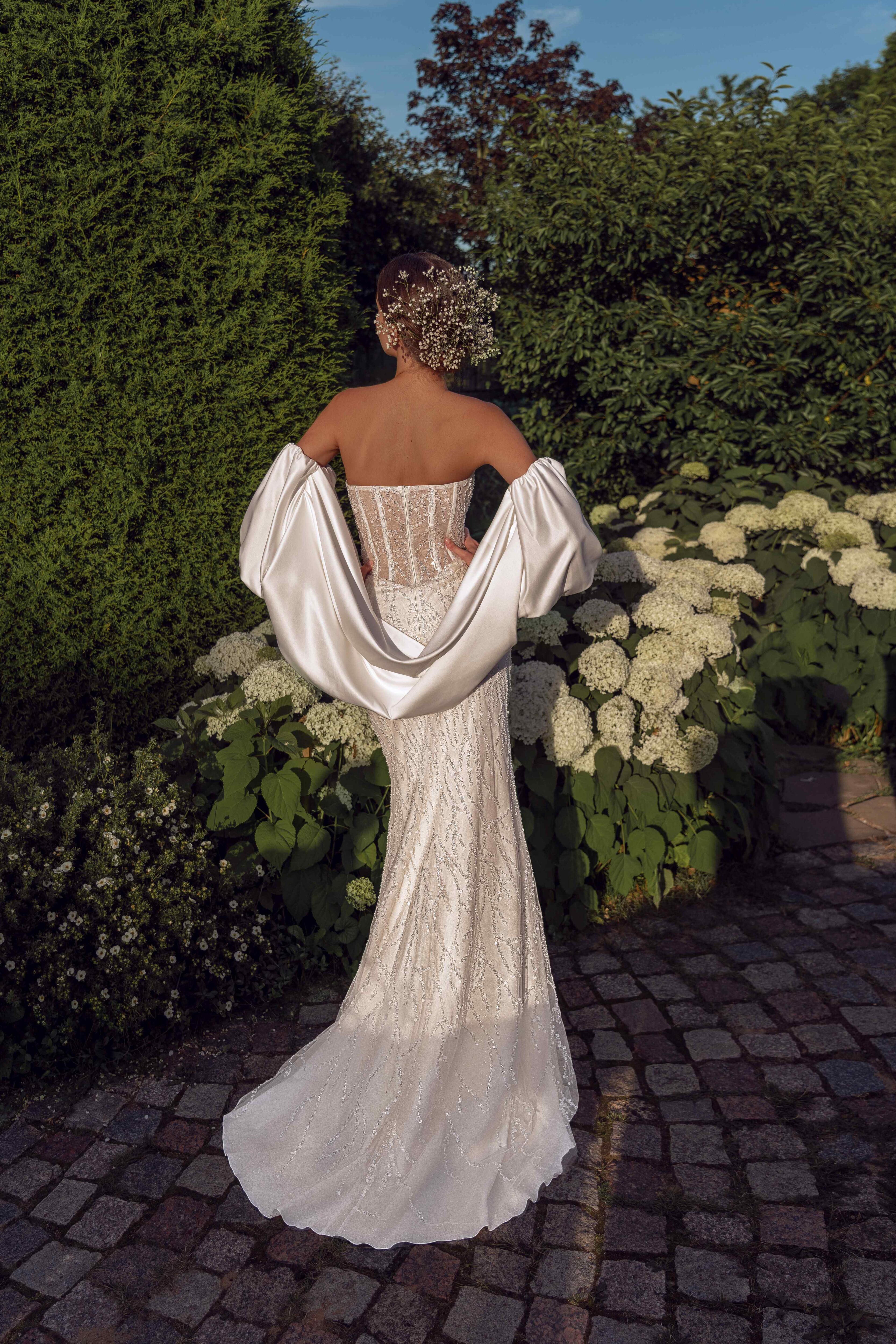 Свадебное платье — элегантное, с открытыми плечами, прямым кроем и объемными рукавами из гладкой атласной ткани. Оно украшено деликатной вышивкой и пайетками, силуэт приталенный, акцент на чистоте линий и современности.