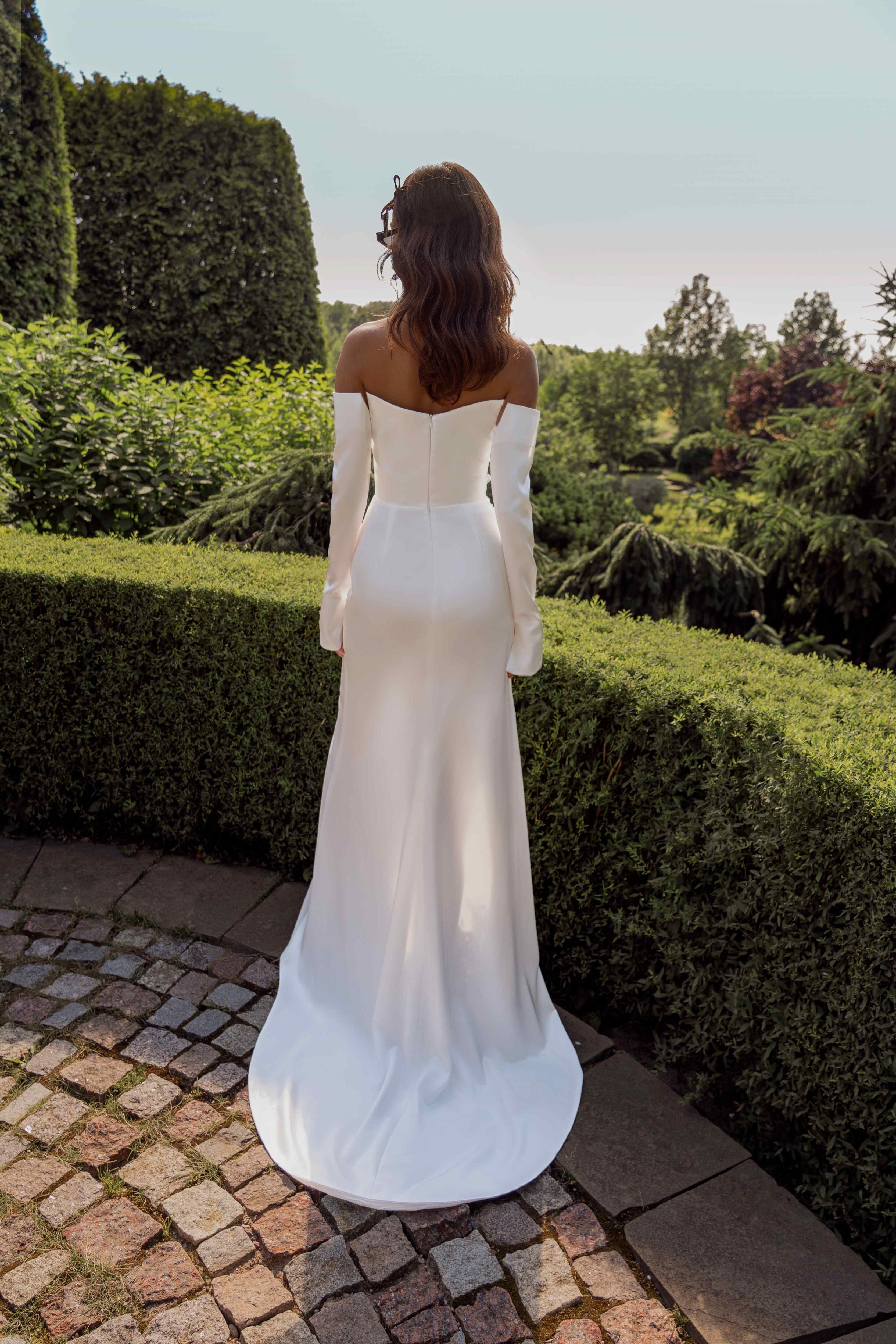 Свадебное платье — минималистичная модель с длинными рукавами, высоким разрезом на юбке и прямым вырезом. Платье выполнено из гладкой ткани, отличается сдержанностью, легким шлейфом и подошло бы как для классической, так и для стильной свадьбы.