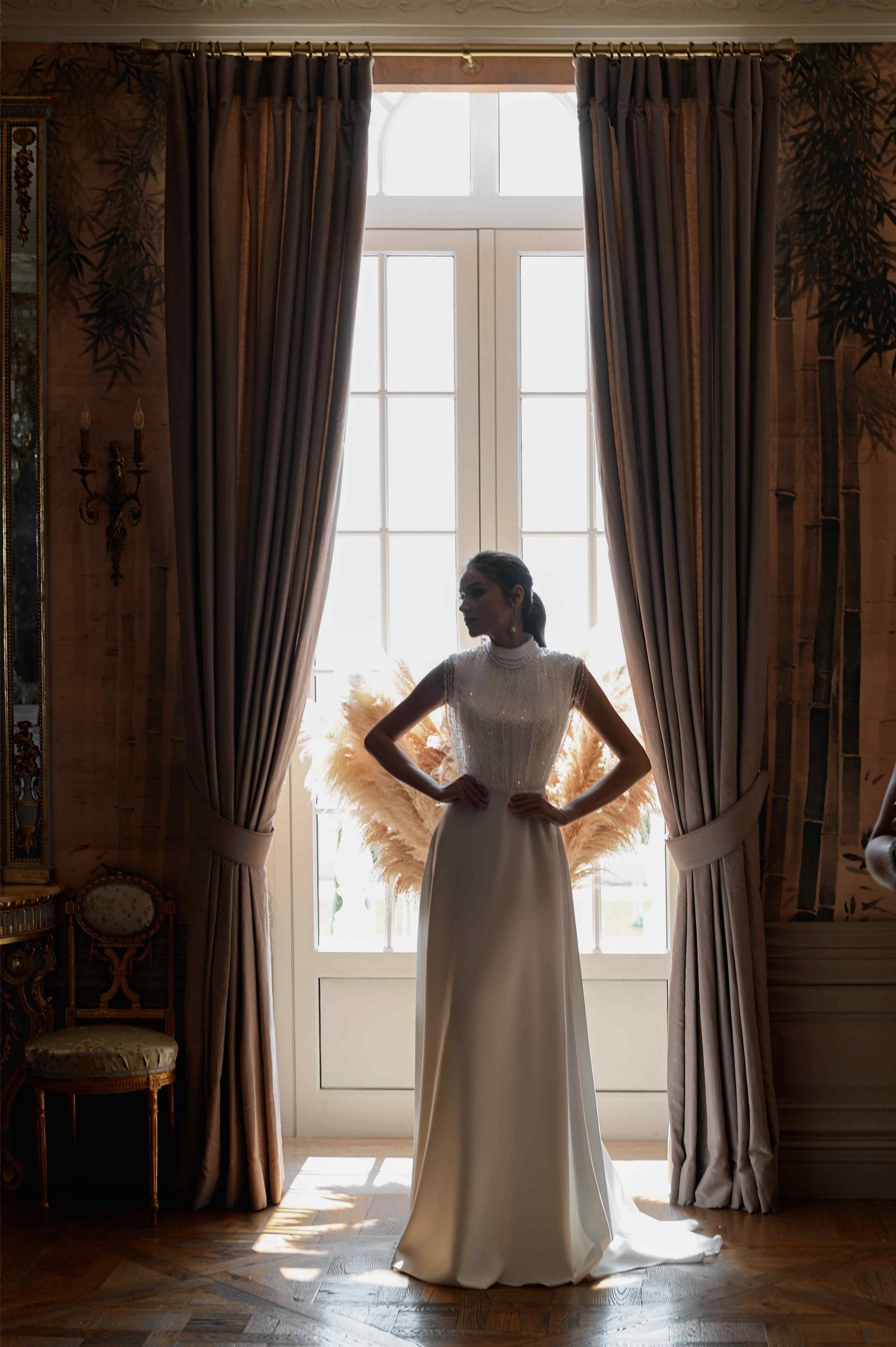 Свадебное платье прямого силуэта. Верх выполнен в виде закрытого топа с высоким воротником и без рукавов, полностью расшит жемчужинами и стеклянным бисером, которые создают эффект утончённого мерцания. Юбка гладкая, длинная, из плотной струящейся ткани, мягко обтекающей фигуру.