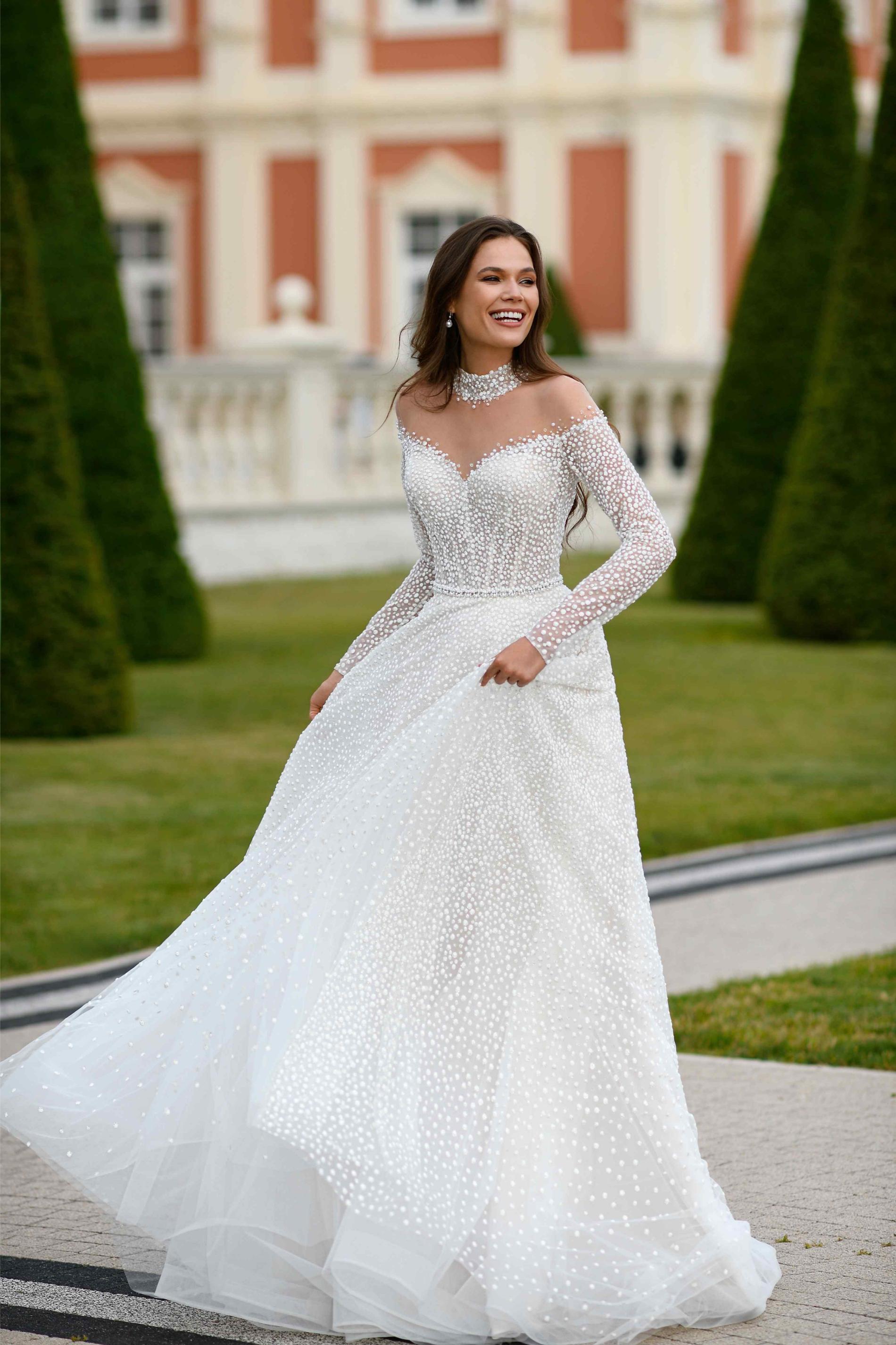 Свадебное платье в классическом стиле princess с длинными рукавами. Платье выполнено из легкой ткани, усыпанной россыпью жемчужных бусин и мелких декоративных элементов по всей поверхности. Верх с открытыми плечами благодаря иллюзии из прозрачной сетки, рукава также украшены жемчугом.