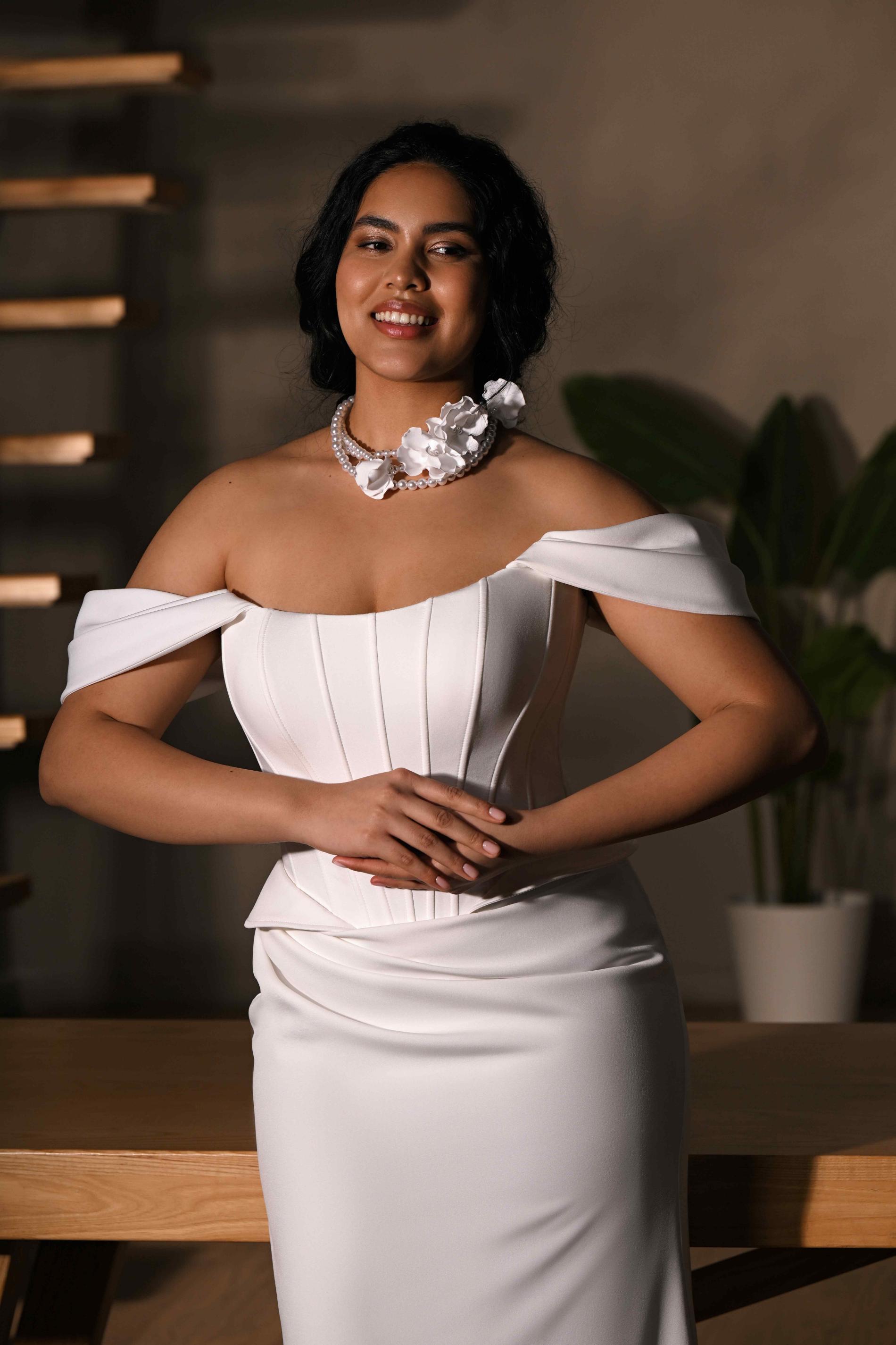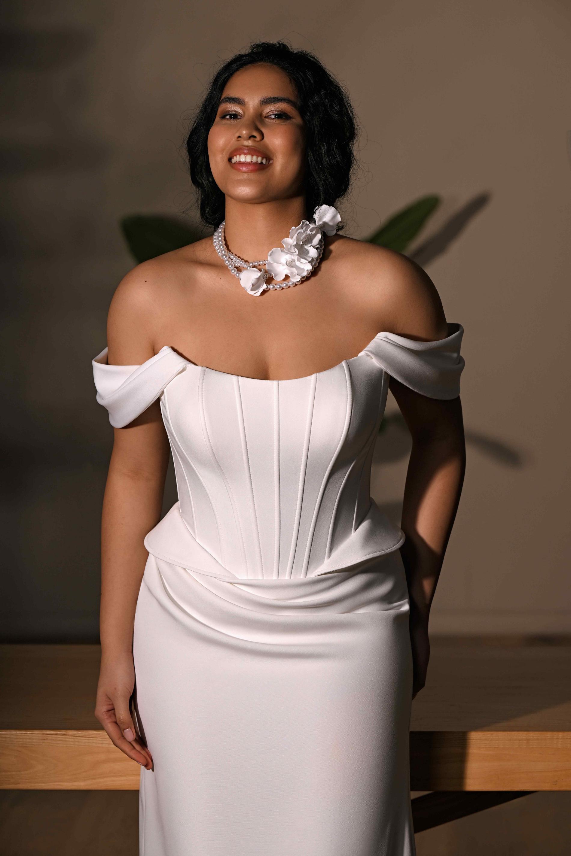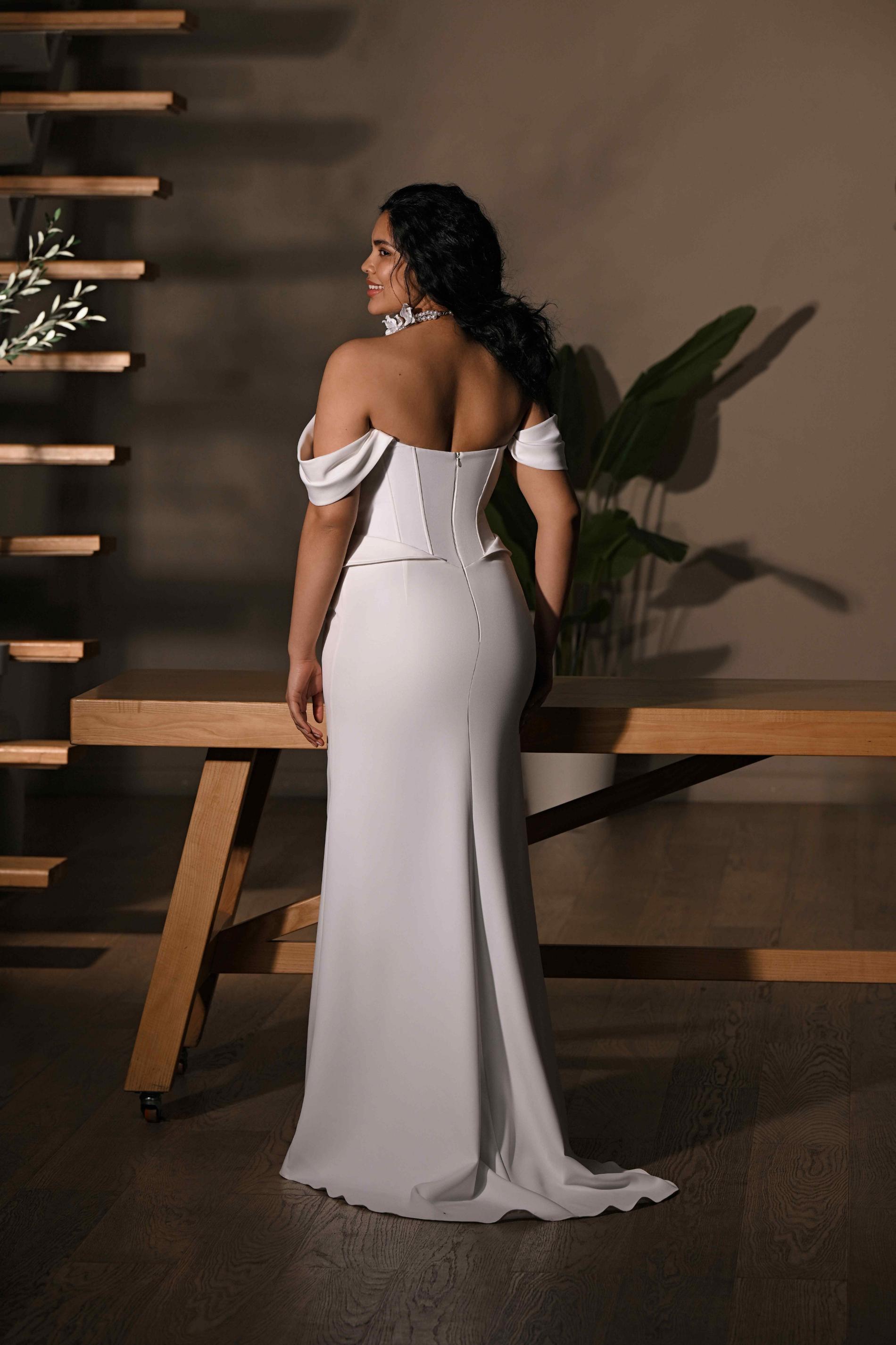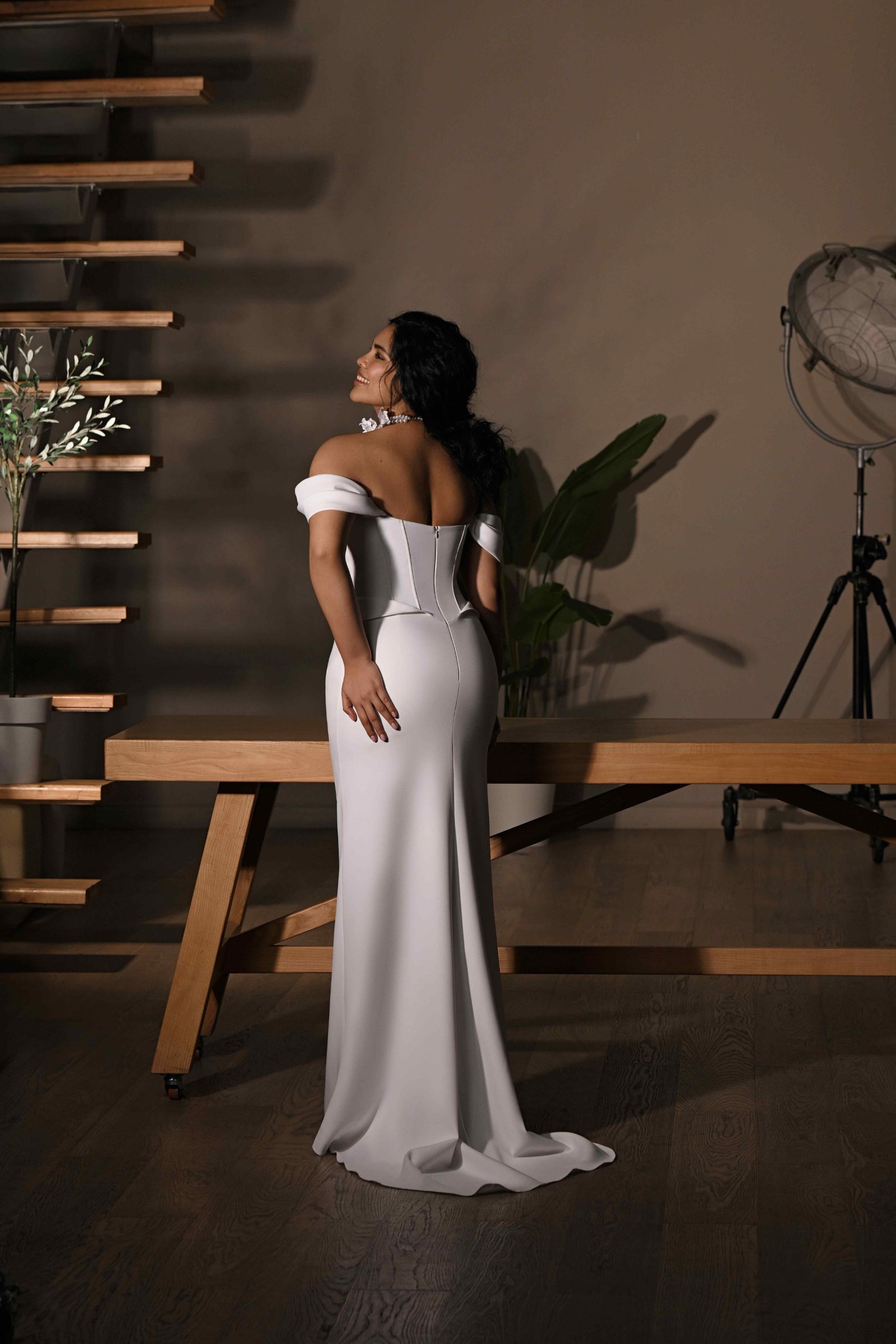 Свадебное платье в современном стиле с открытыми плечами и корсетным верхом. Акцент выполнен на строгих вертикальных линиях корсета, которые визуально стройнят и подчеркивают талию. Материал плотный, мягко драпируется у бедер, образуя плавные складки. Платье выглядит элегантно и утончённо, хорошо подчеркивает фигуру.