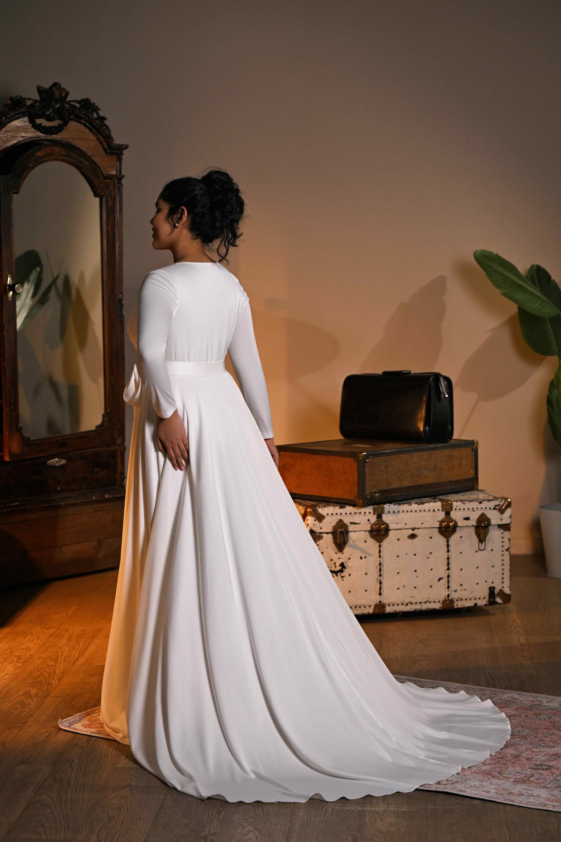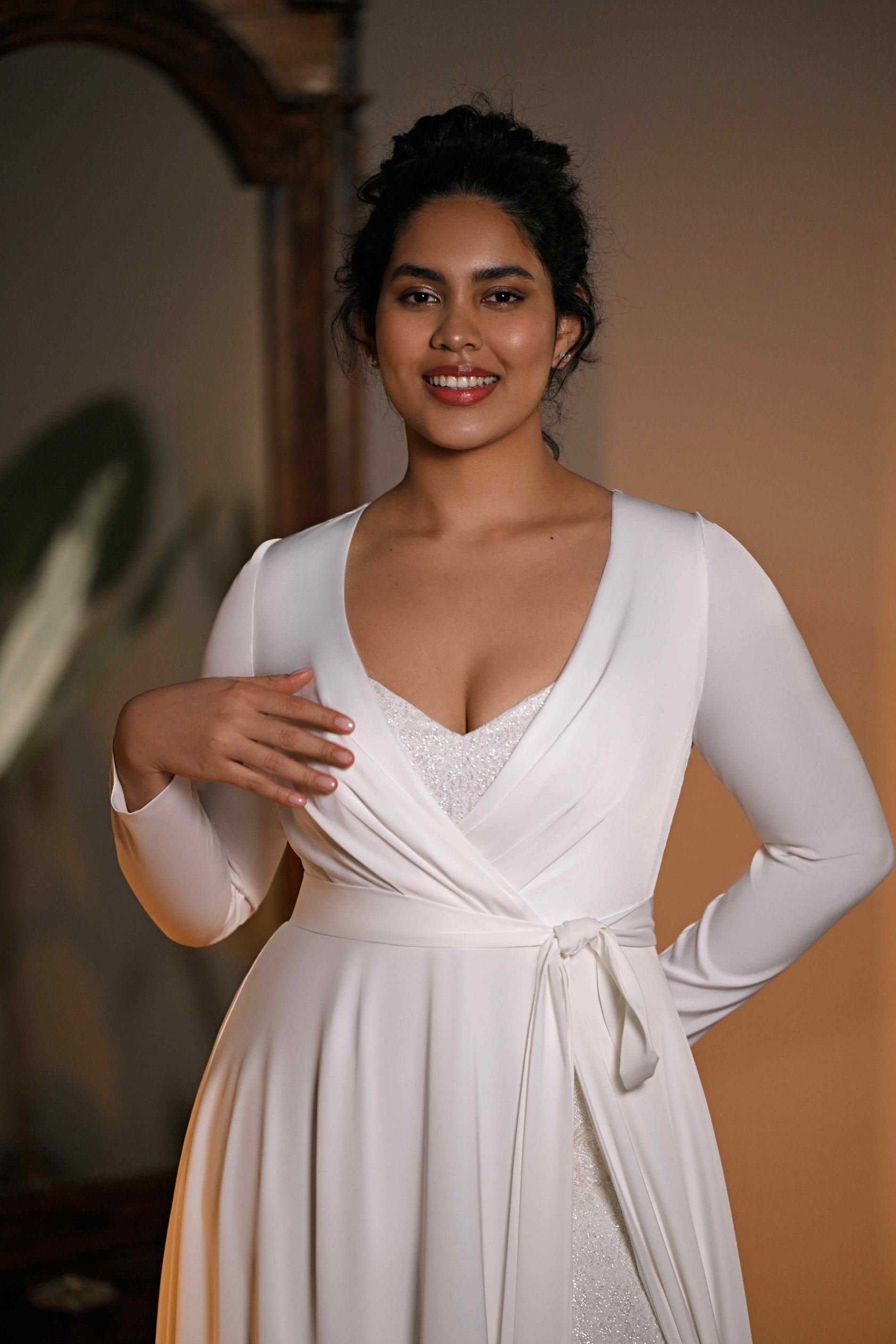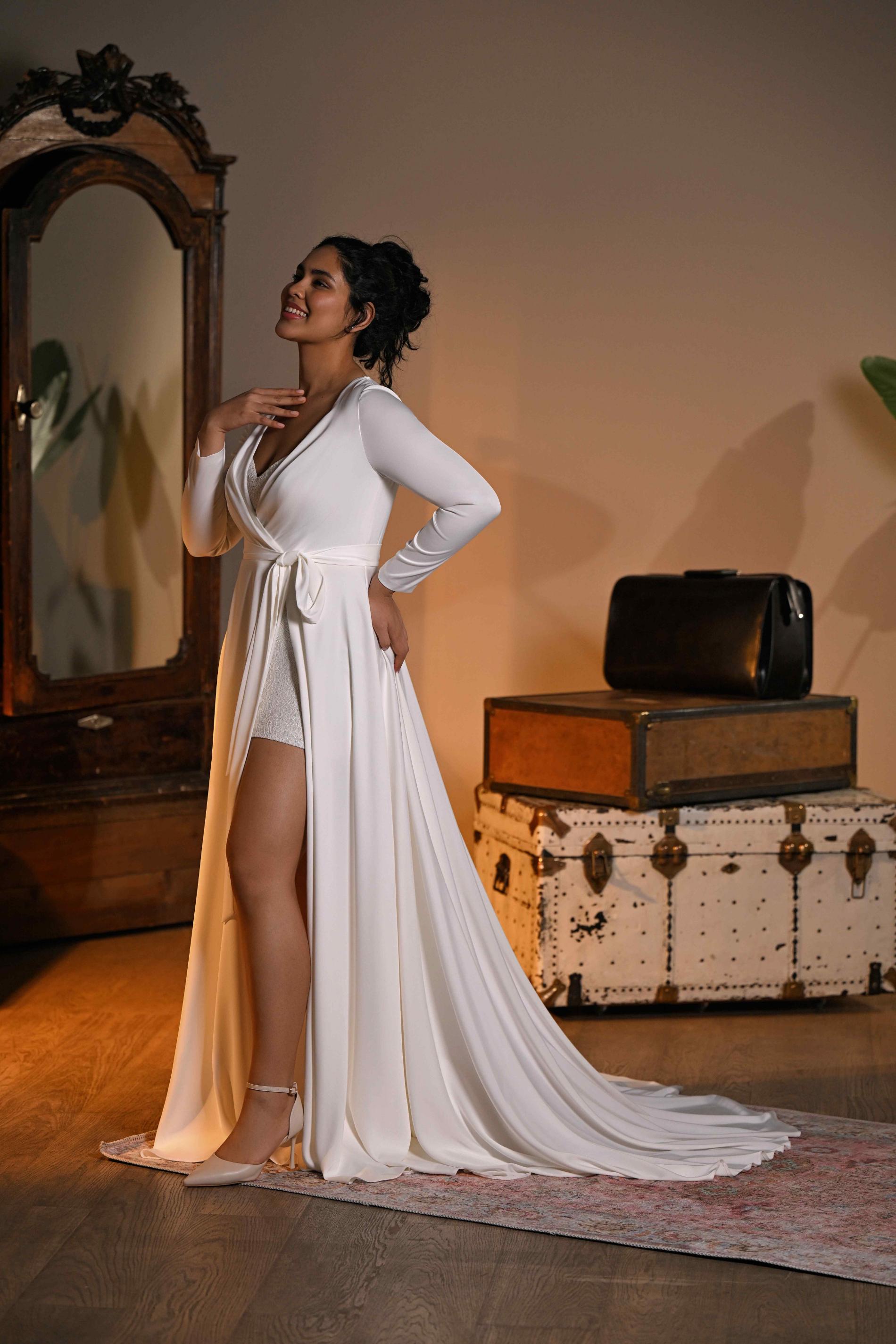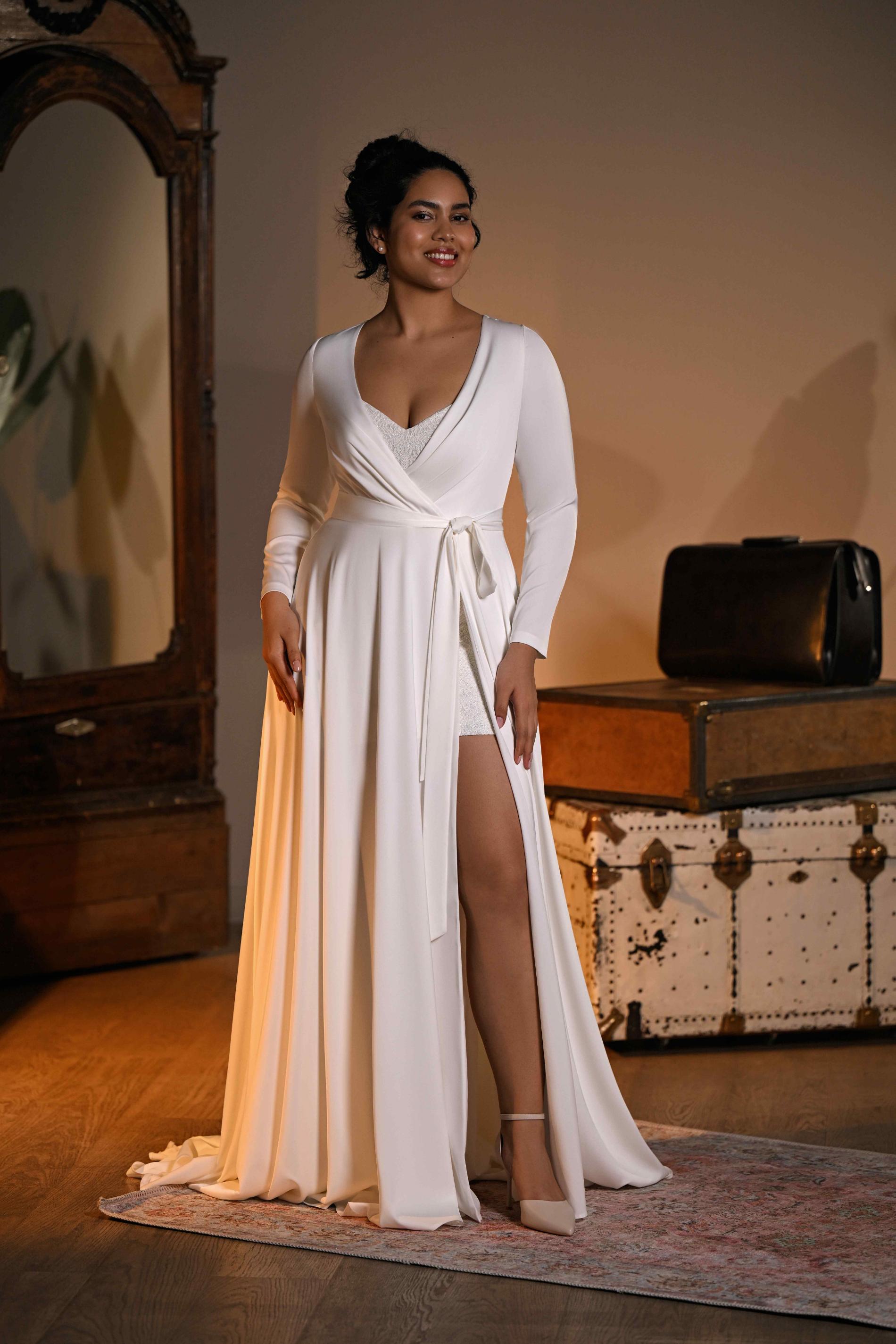 Свадебное платье-трансформер, состоящее из двух частей. Внешняя — длинное платье с запахом, длинными рукавами и поясом на талии. Глубокий V-образный вырез создаёт женственный силуэт, а высокий разрез на юбке элегантно открывает мини-платье, надетое под низ.