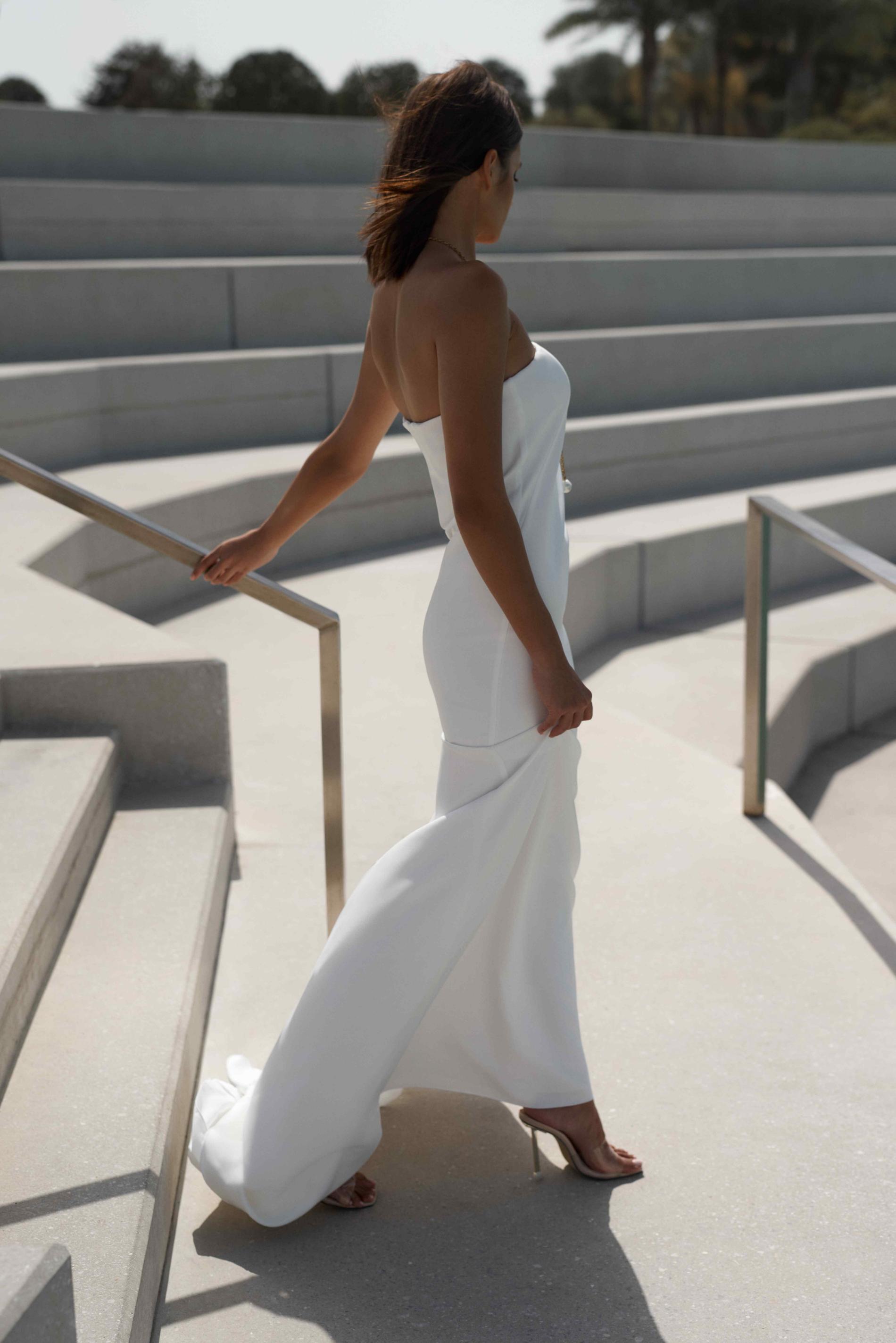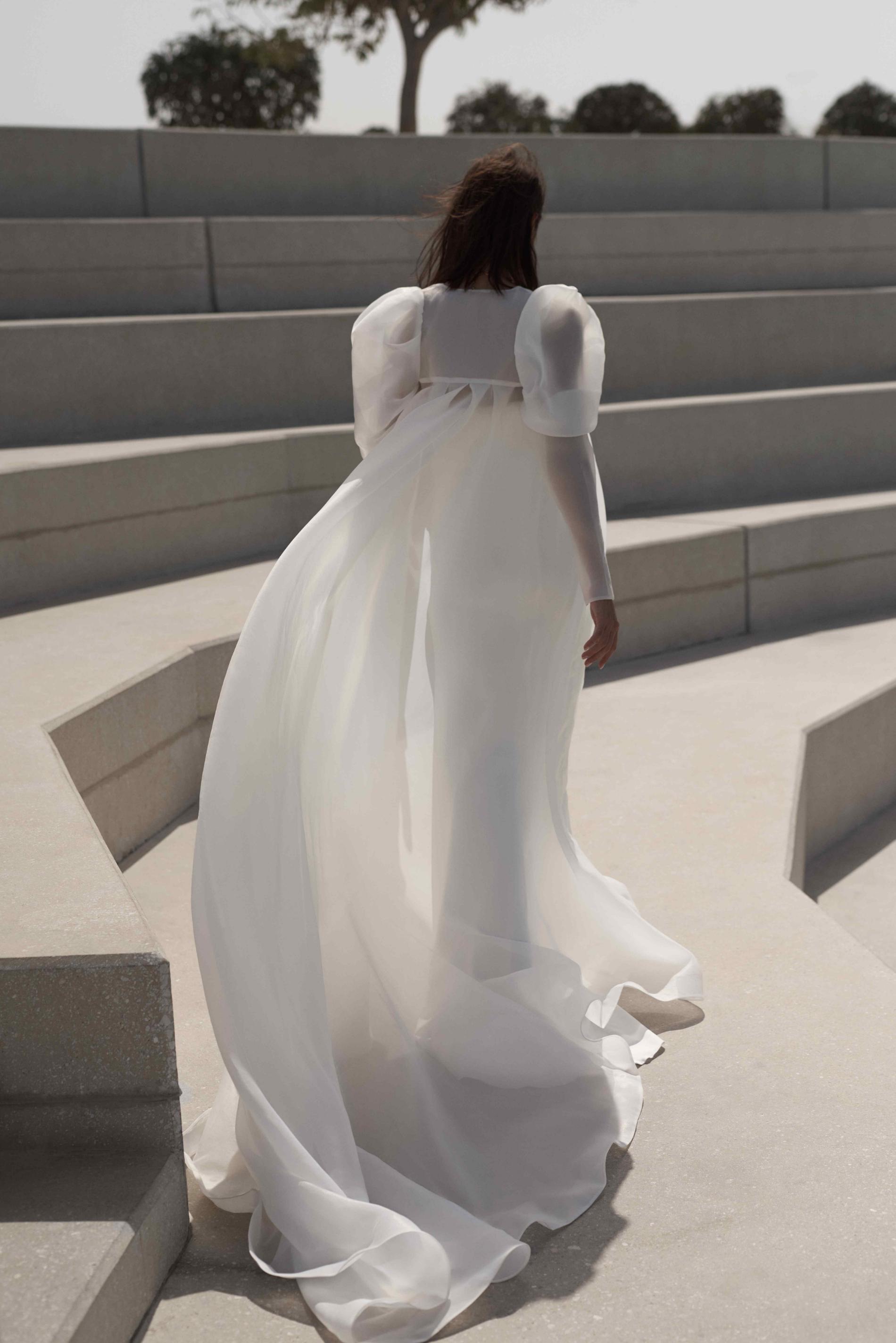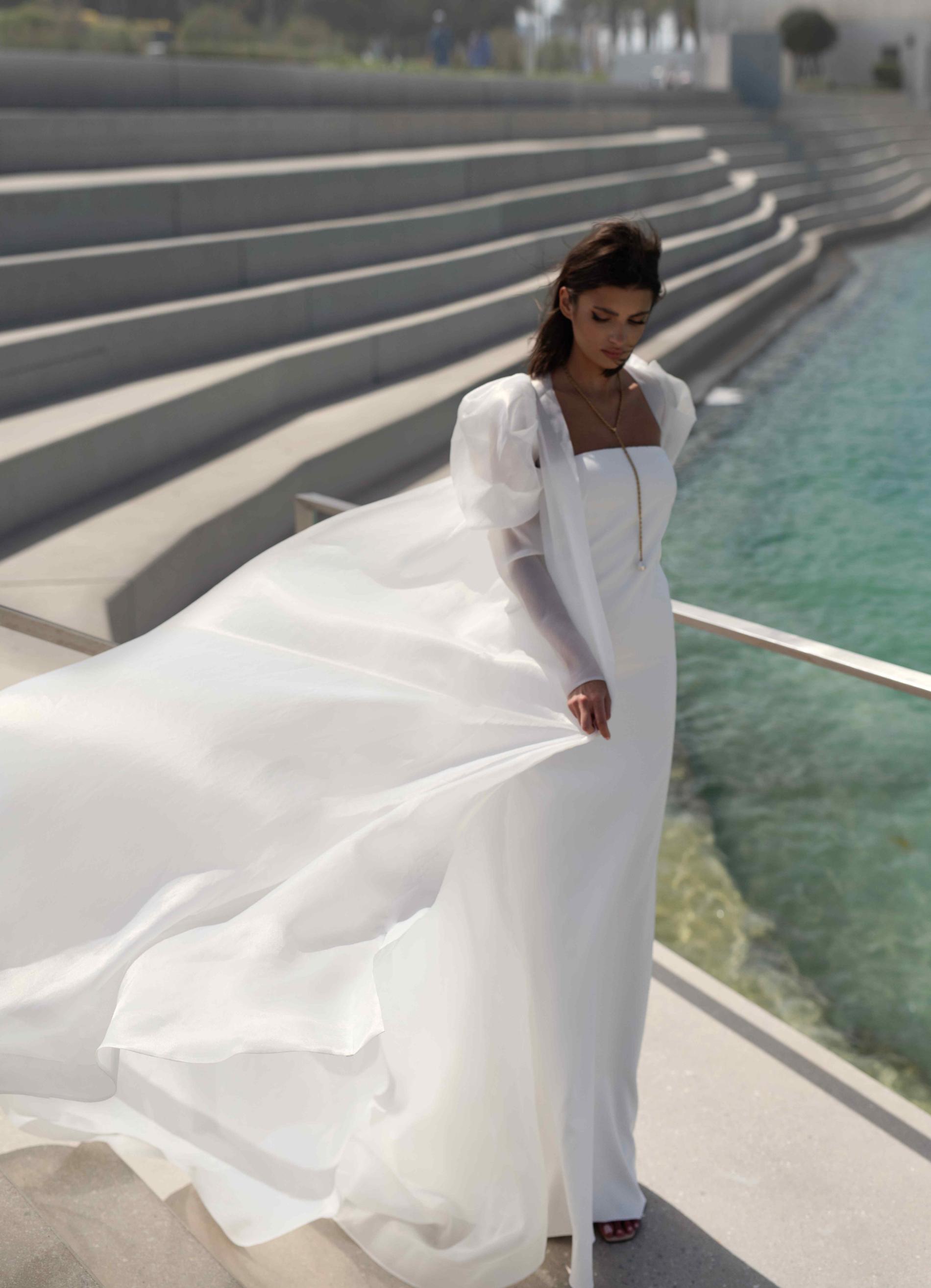Свадебное платье-бандо прямого силуэта с воздушными объемными рукавами из органзы. Акцент на плечах придаёт наряду легкость и выразительность.