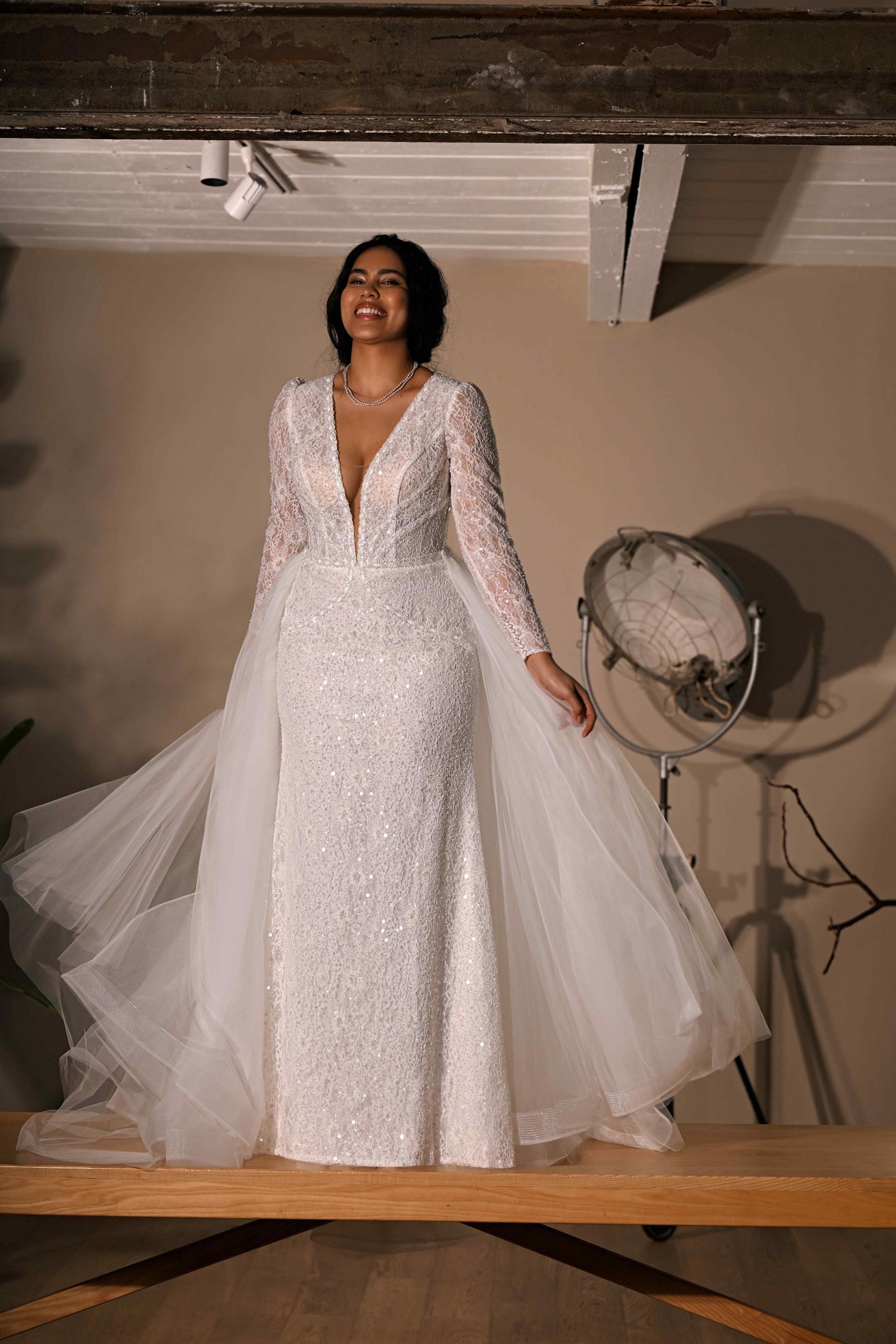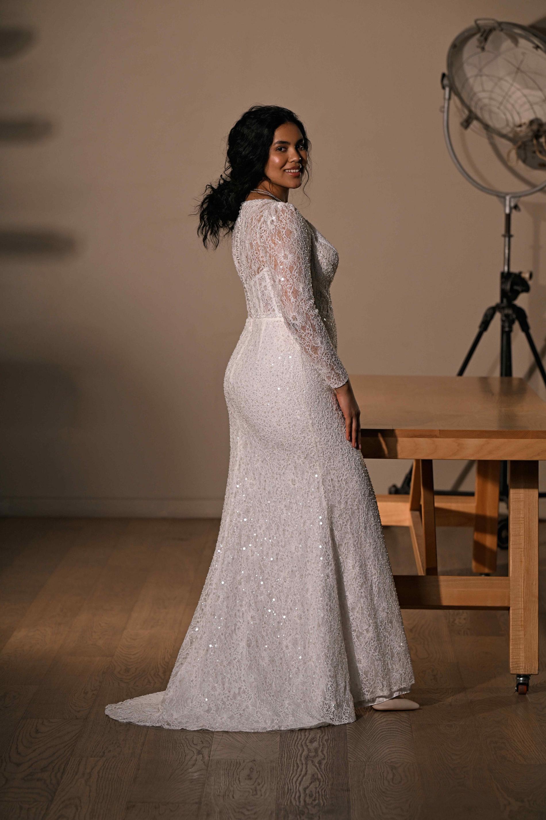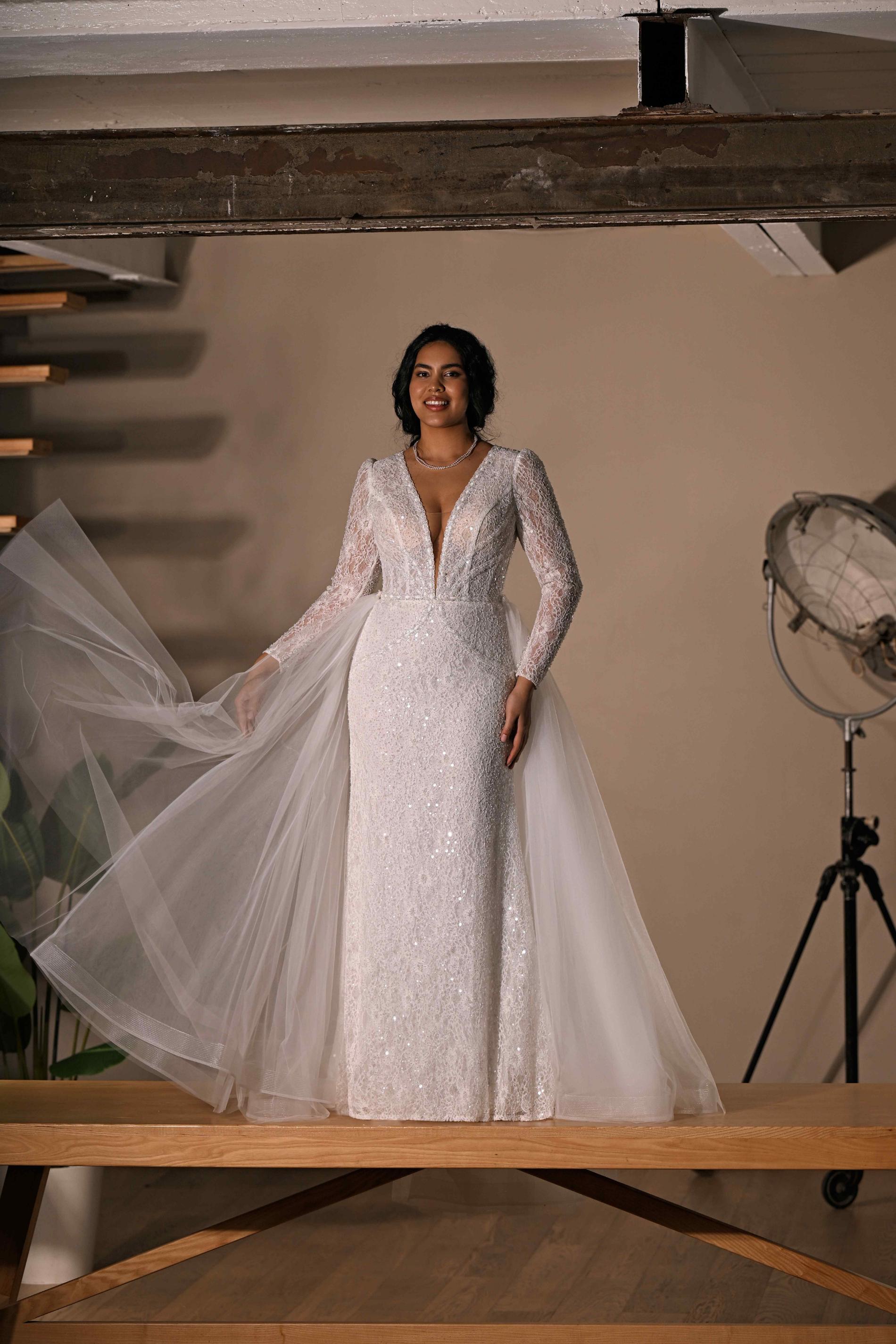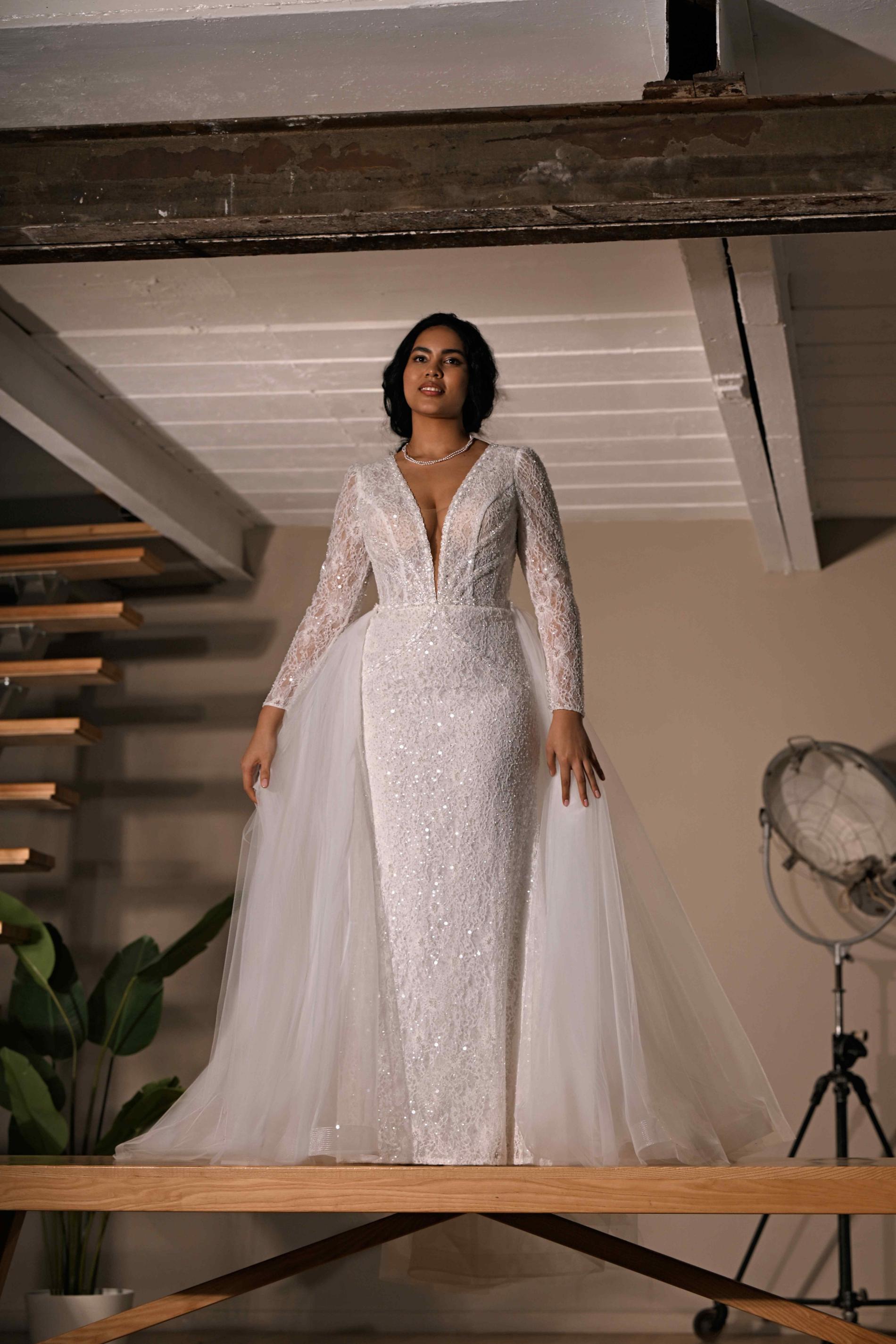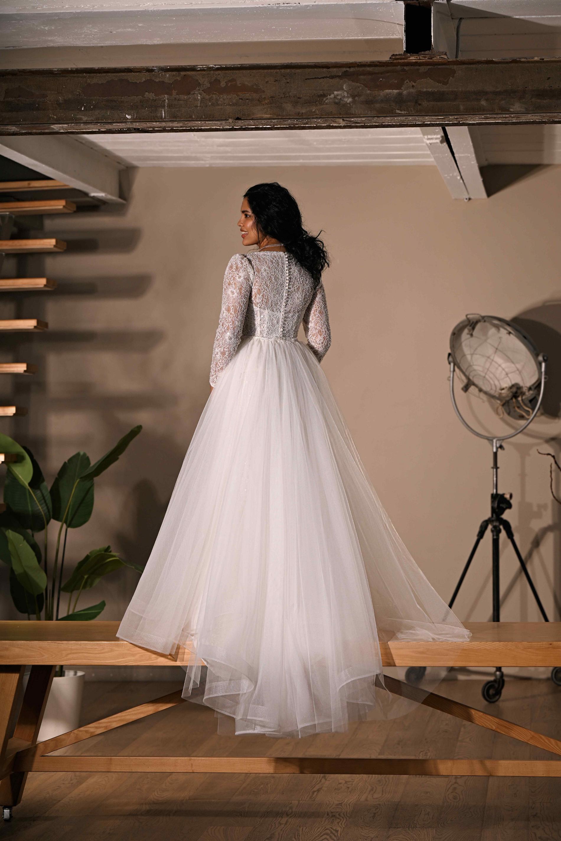 Свадебное платье приталенного силуэта, полностью украшено узорным кружевом и нежным сияющим декором. Глубокий V-образный вырез добавляет образу утончённости, а длинные прозрачные кружевные рукава придают легкость и элегантность. Юбка дополнена воздушной накидкой-шлейфом из мягкого фатина, который красиво ниспадает до пола и создает эффект легкости при движении.