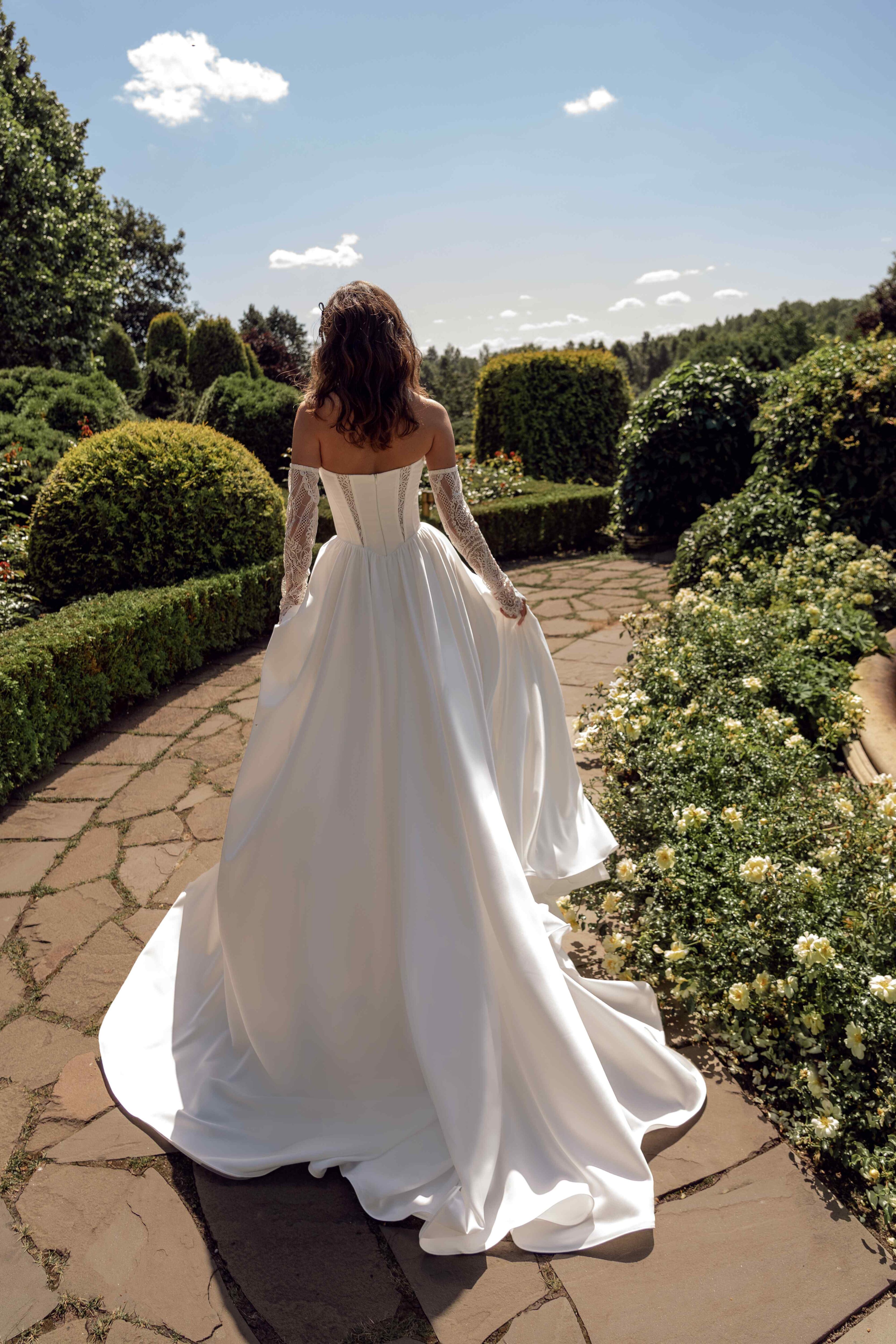 Свадебное платье — корсетное, с открытой спиной и длинными прозрачными рукавами, украшено вставками из кружева и высоким разрезом спереди. Юбка свободно ниспадает, делая образ одновременно чувственным и романтичным.